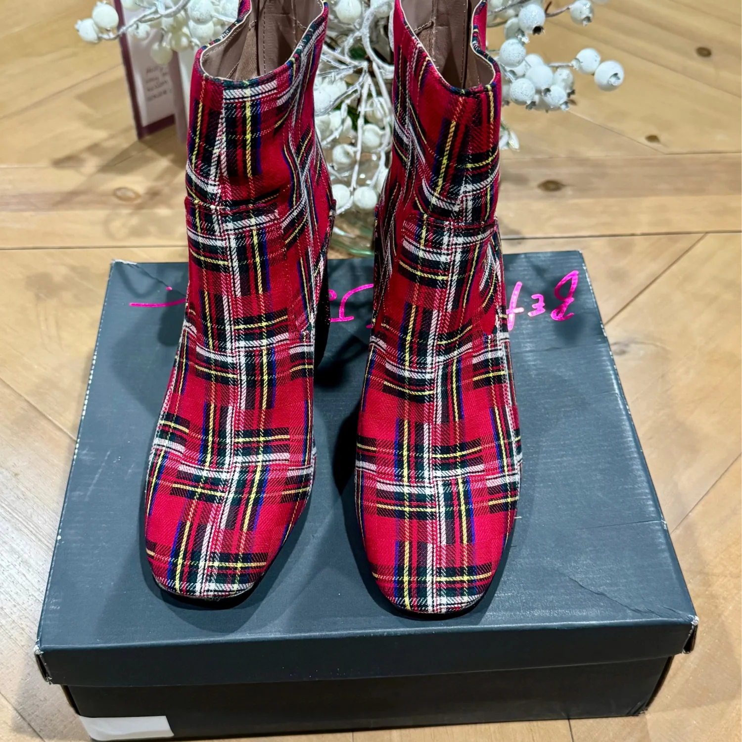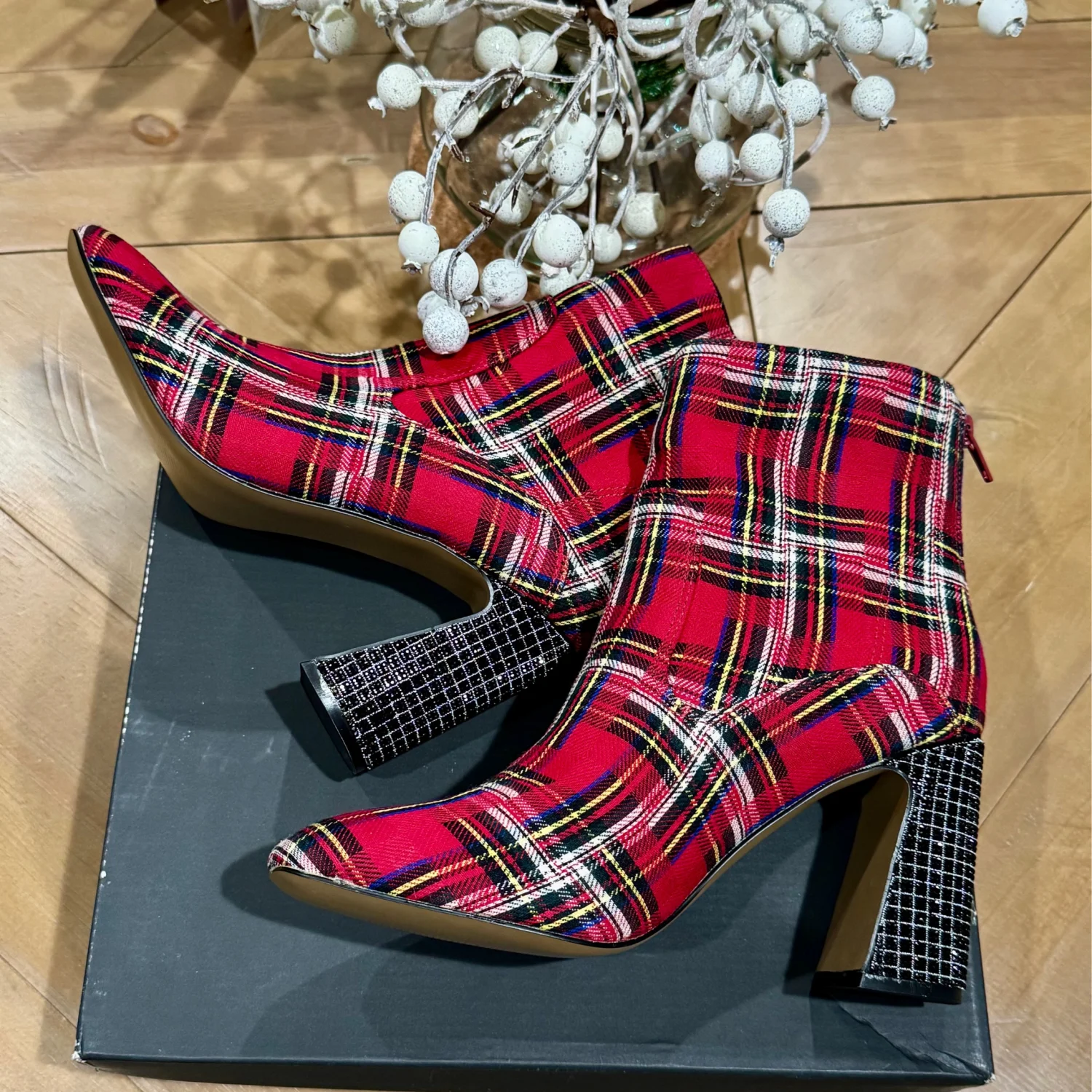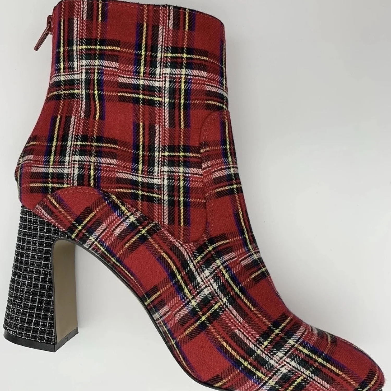 Betsey Johnson Blanche Boot Womens Red Plaid Rhinestone Block Heel Bootie