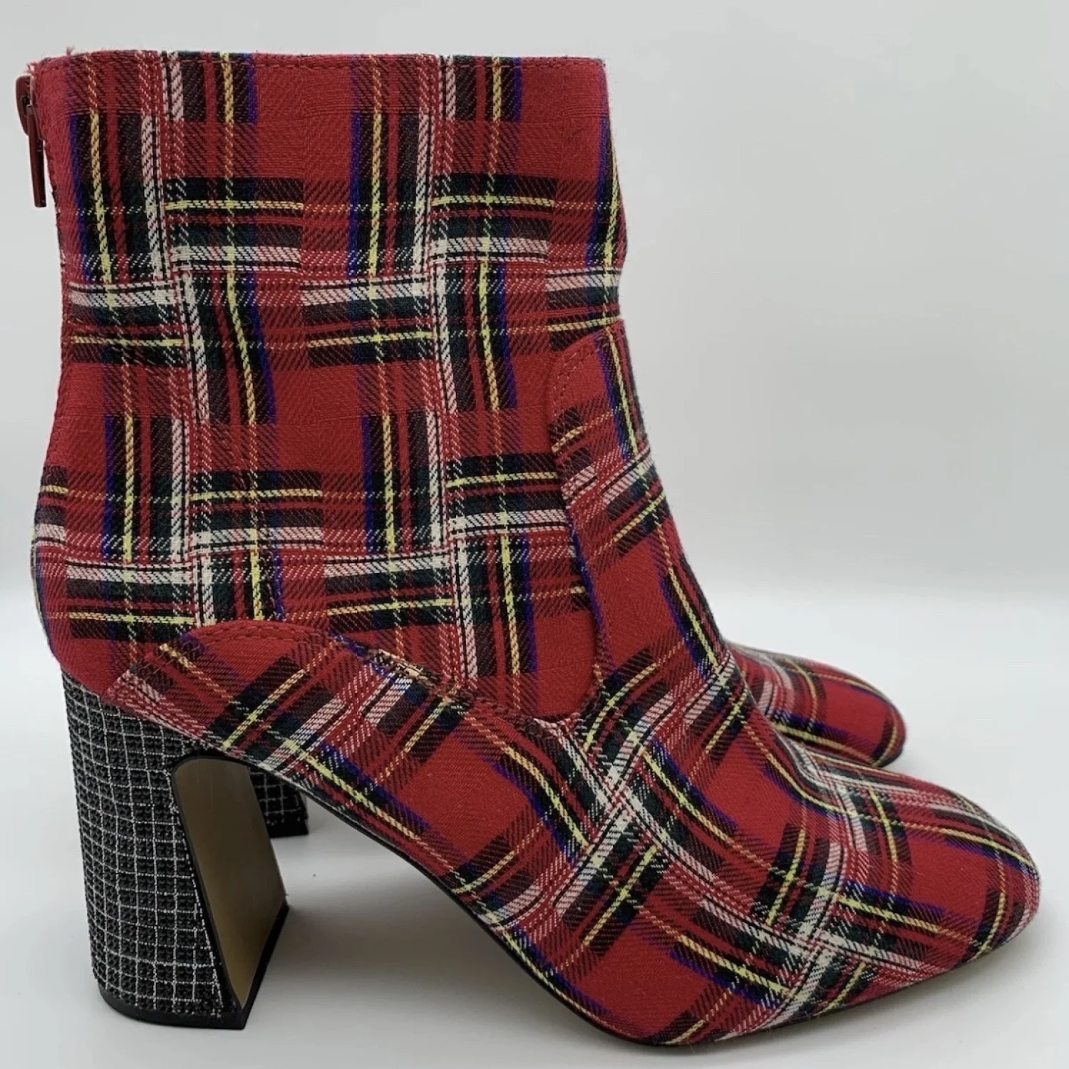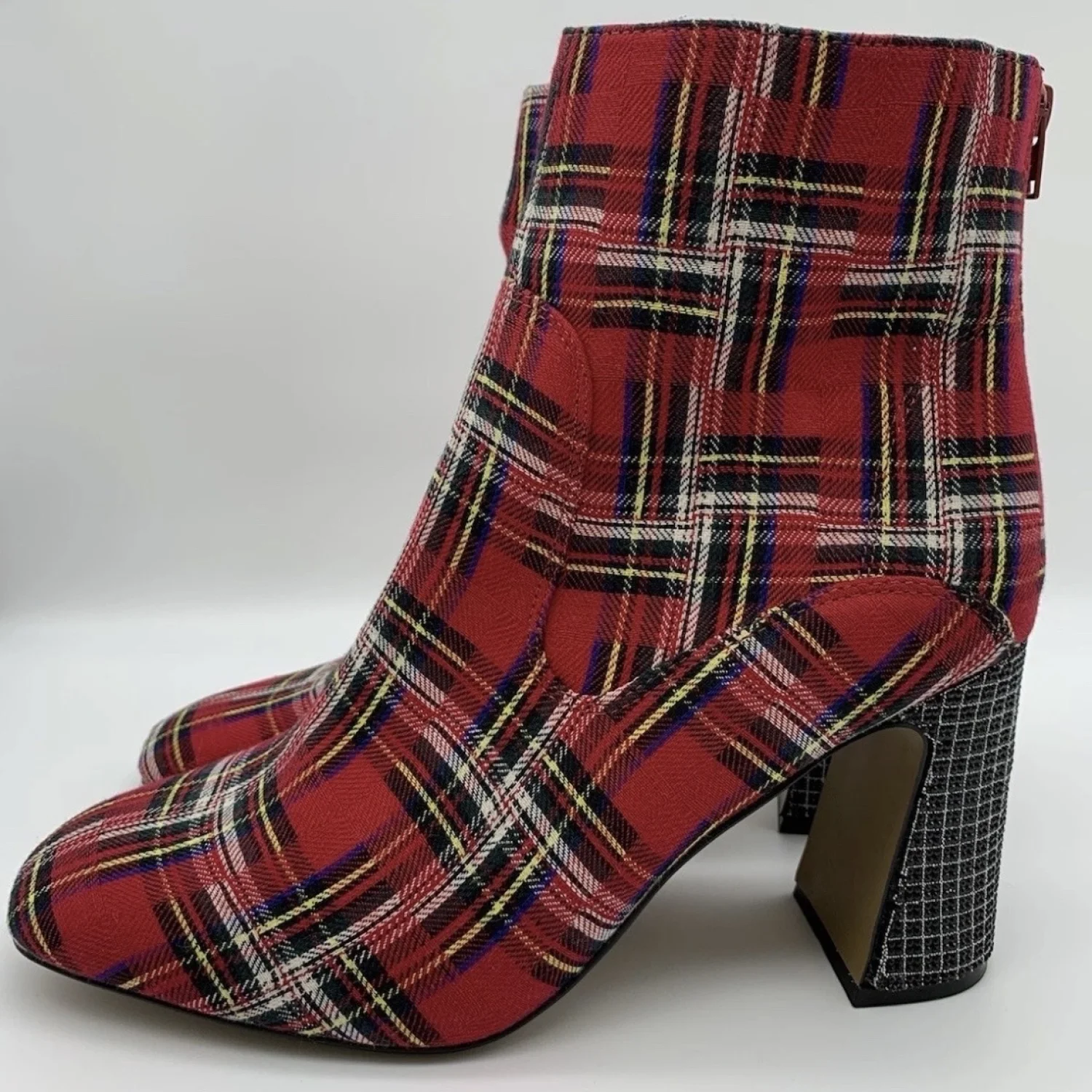 Elevate your style with these stunning Betsey Johnson Blanche red plaid fabric boots. The ankle-length boots feature a square toe shape and a zip closure for easy wear. The 3.75 inch block heel style makes it perfect for formal occasions, parties, or even workwear. The fabric lining and insole material provide added comfort and durability. These designer boots are a great addition to any wardrobe and are sure to make a statement. •Size: 8 •Width: Medium •Heel height - 3.5" •Block heel •Shaft height - 5" •Calf circumference - 10" •Shoe width - medium •Interior side zipper closure •Textile upper, synthetic lining, and manmade outsole •Square toe •Made in China