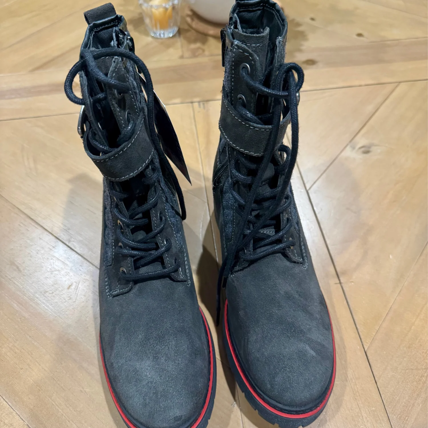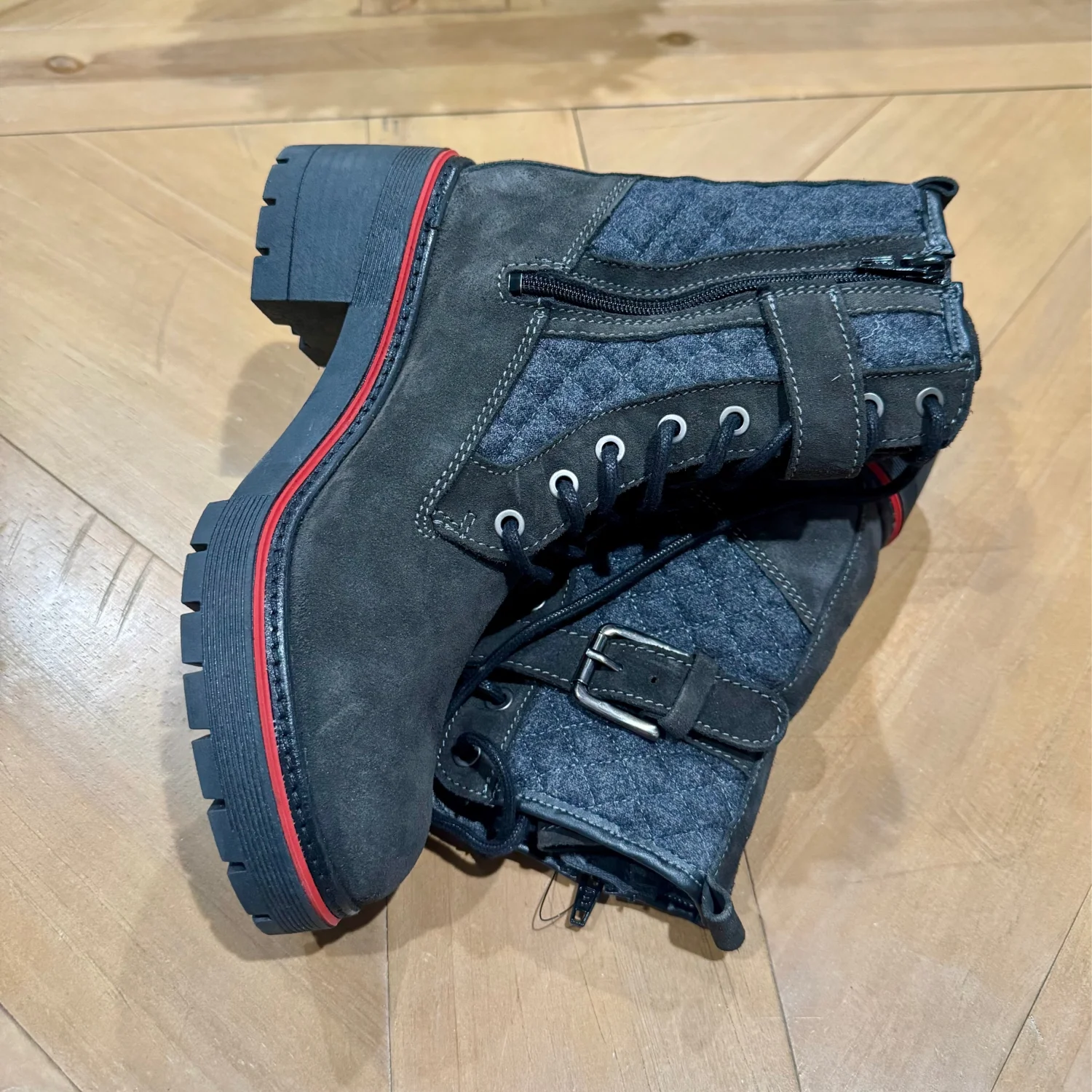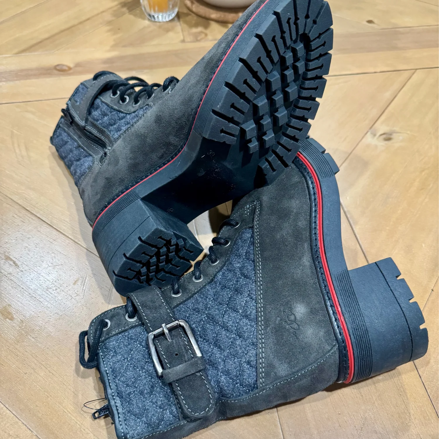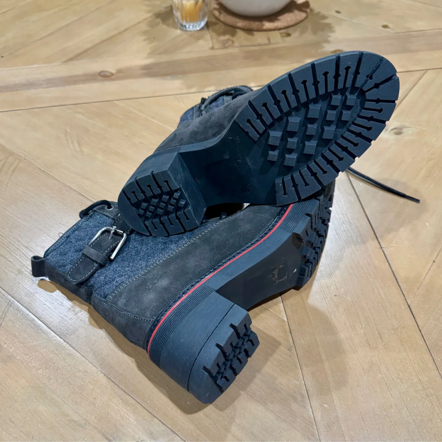 ZING The chunky heel and quilting on the zing along with the buckle and red on the sole give it a unique and trendy look. The warm microfiber lining is comfort rated to minus 15 celcius/5 fahrenheit and the sole has a heel to toe memory foam insole and thermal barrier to keep your feet cushioned and warm. The inside zipper makes this boot easy to get on and off while the adjustable laces and buckle give it a flexible and comfortable fit. 6.25 inch shaft height and 11 inch shaft circumference. -Zozeica Line -Leather And Flannel Upper -Microfiber Lined -2.5 Inch Heel With 1 Inch Forepart -Cushion Insole -Zip Up Boot Size: 39 / 8.5 Waterproof Made In Portugal MSRP: $280