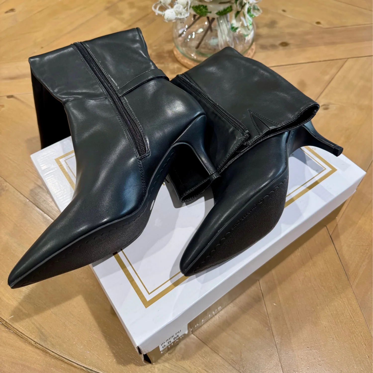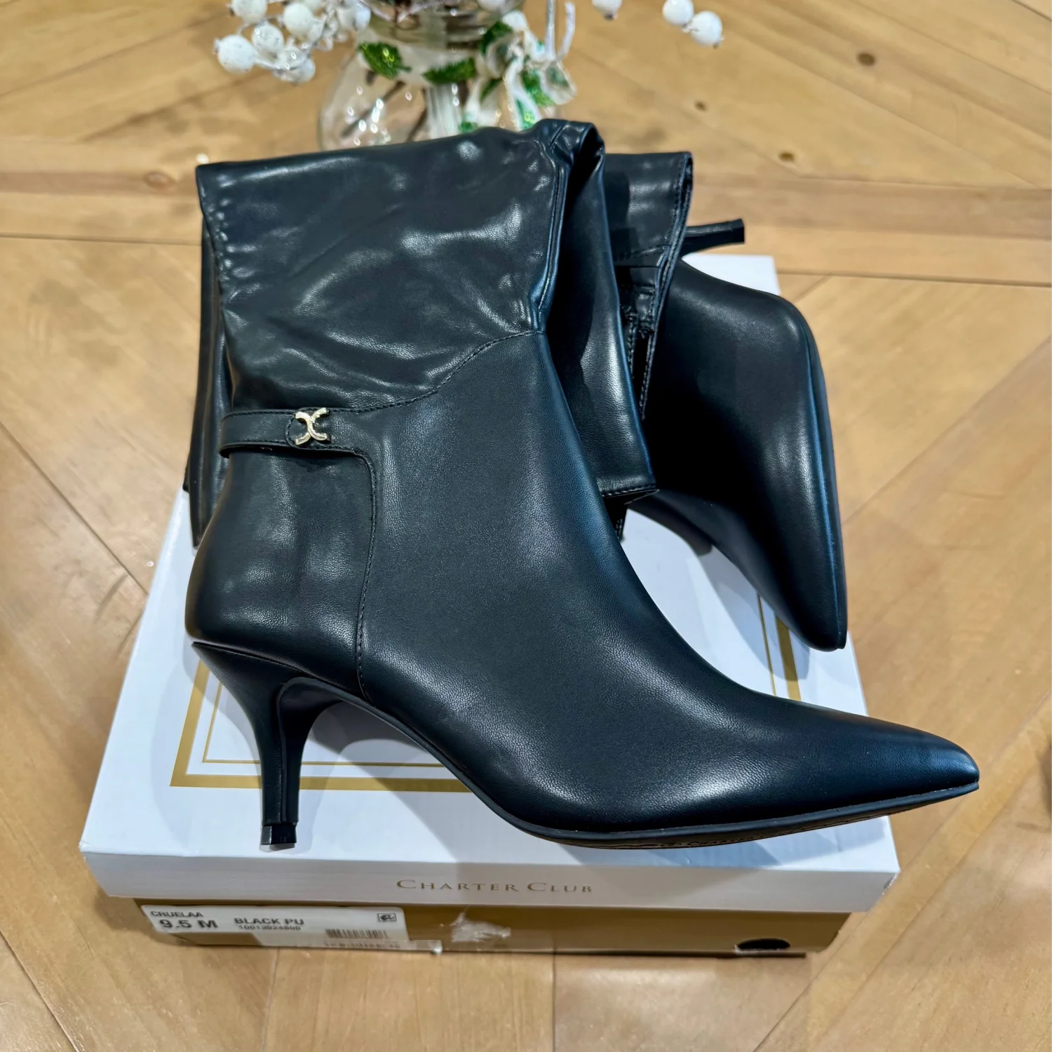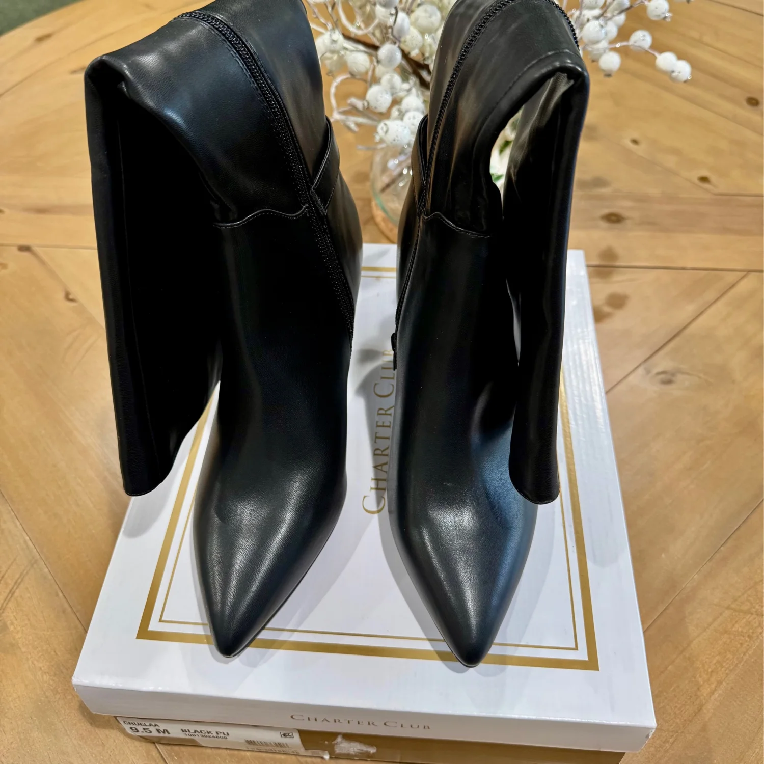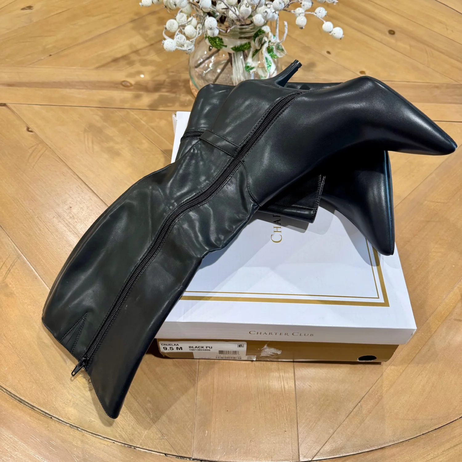 Posted on pretty points and sleek stiletto heels, the Cruelaa boots from Charter Club dress up your favorite looks with inspired lines and chic silhouettes. • Size: 9.5 • Width: Medium • 2-1/4" stiletto heel • Shaft height: 15.5” Circumference: approx 16” • Pointed-toe dress boots with inner ankle zipper closure • Cushioned insole for added comfort • NOTE: Shaft height and circumference vary by size. • Created for Macy's • Manmade upper; fabric lining; rubber sole • MSRP: $120