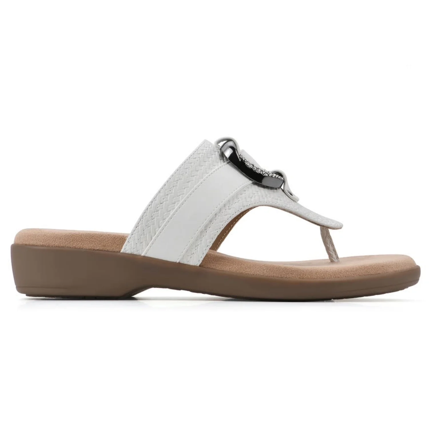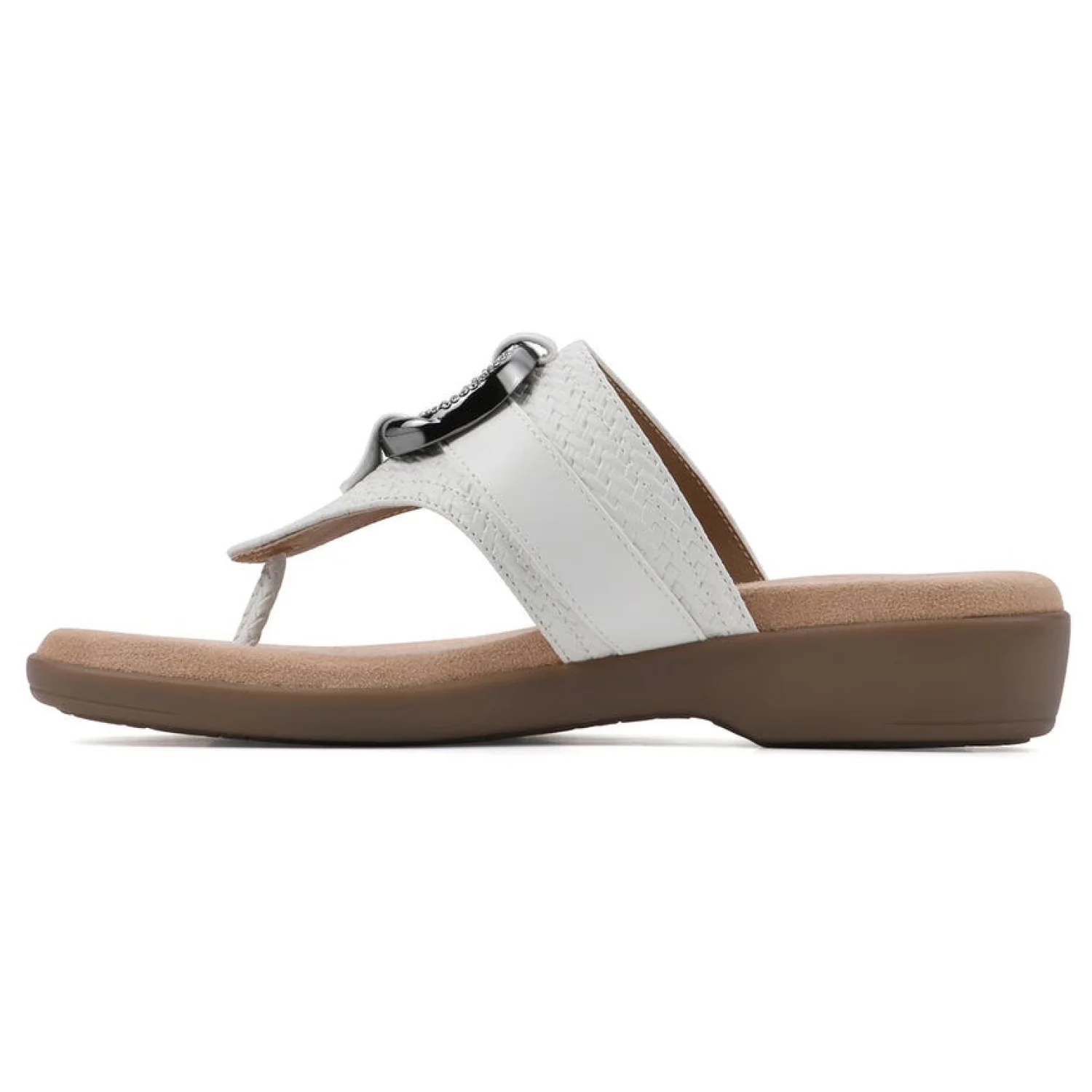 The Benedict thong sandal from Cliffs by White Mountain Shoes makes a statement! This comfort sandal is adorned with a metal O-Ring ornament that is sure to turn heads. The cushioned insole and flexible outsole are great for walkability whether you are running errands, headed to date night, or meeting up with the girls! Size: 7 Comfortable Slip on Construction Thong sandal with soft suedette lining Heel Height: 1.25" Platform Height: 0.5" Upper Material: Man Made Outsole Material: Man made MSRP: $65