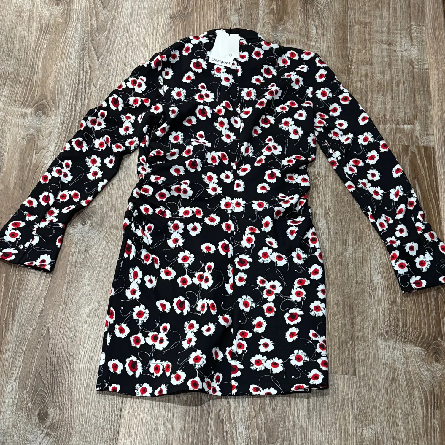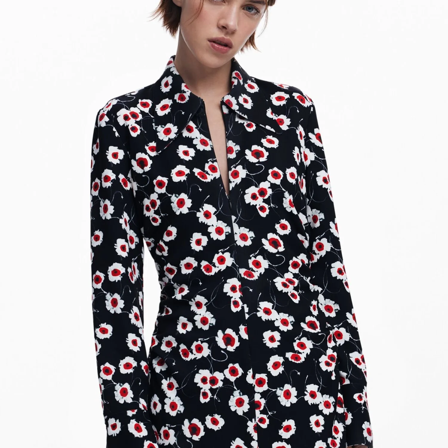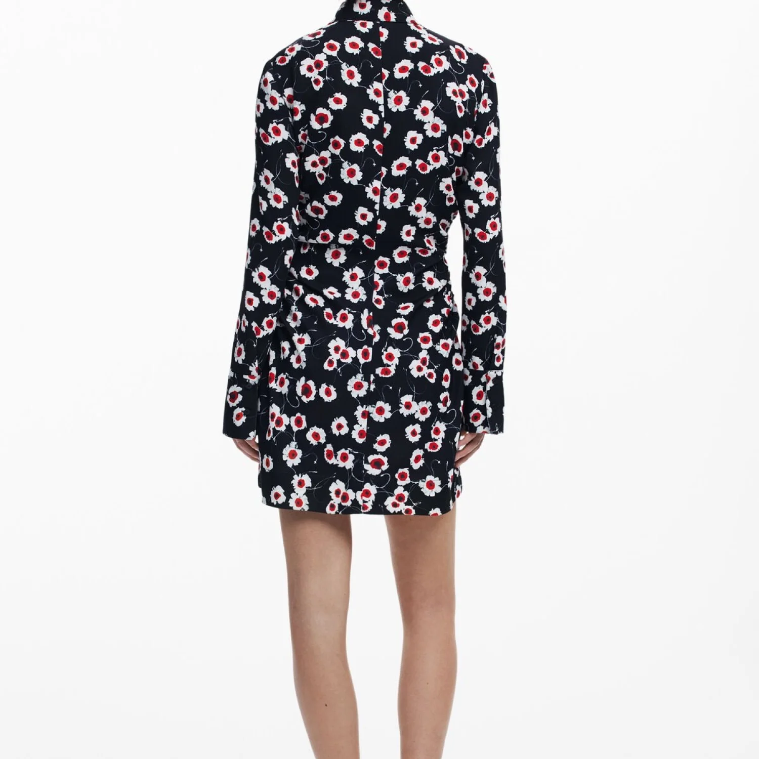Long-sleeve mini dress, wide lapel collar, side ruching, front zipper closure, and wide shirt-style cuffs with large floral print. Model’s measurements: Height: 175 cm; Waist: 56 cm; Hip: 83 cm Model size: Medium Dress Size: Medium Material: 100% Polyester Wash with dark colors separately Made in China MSRP: $159