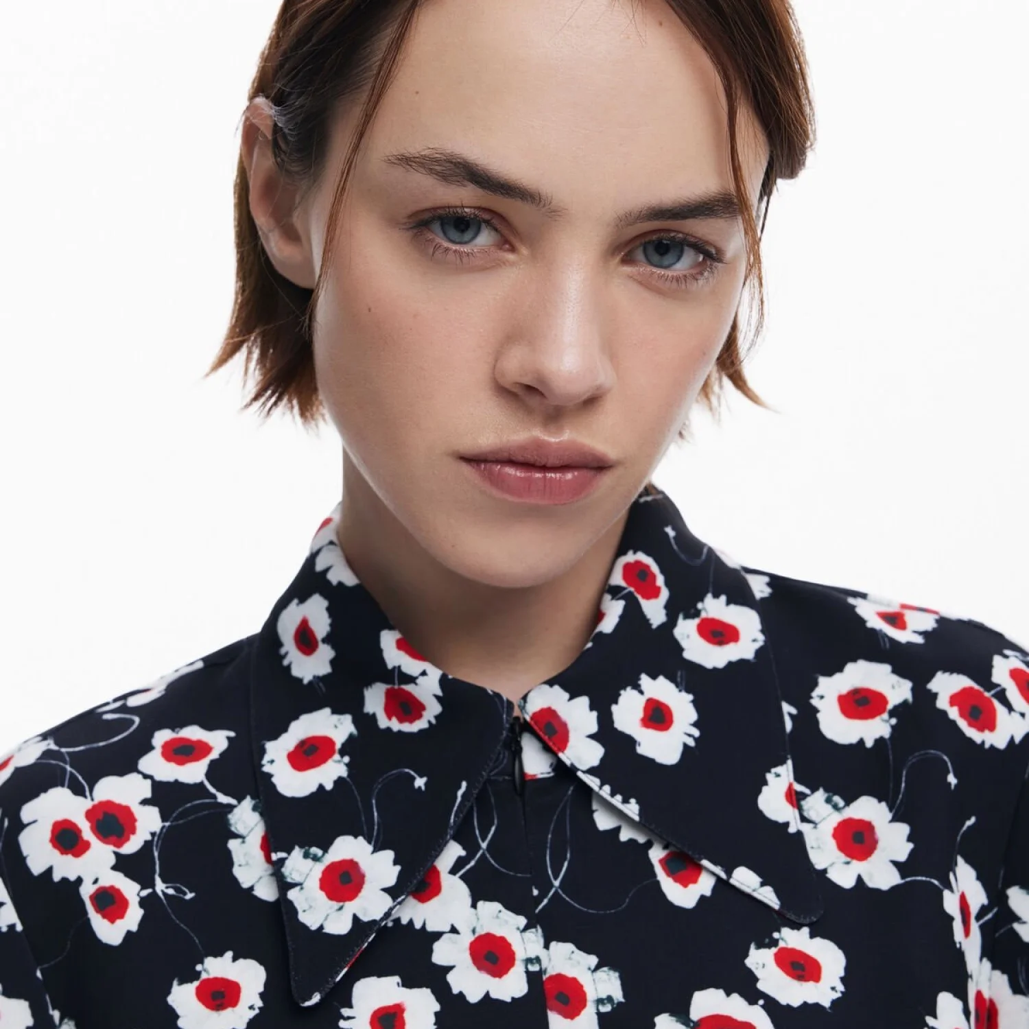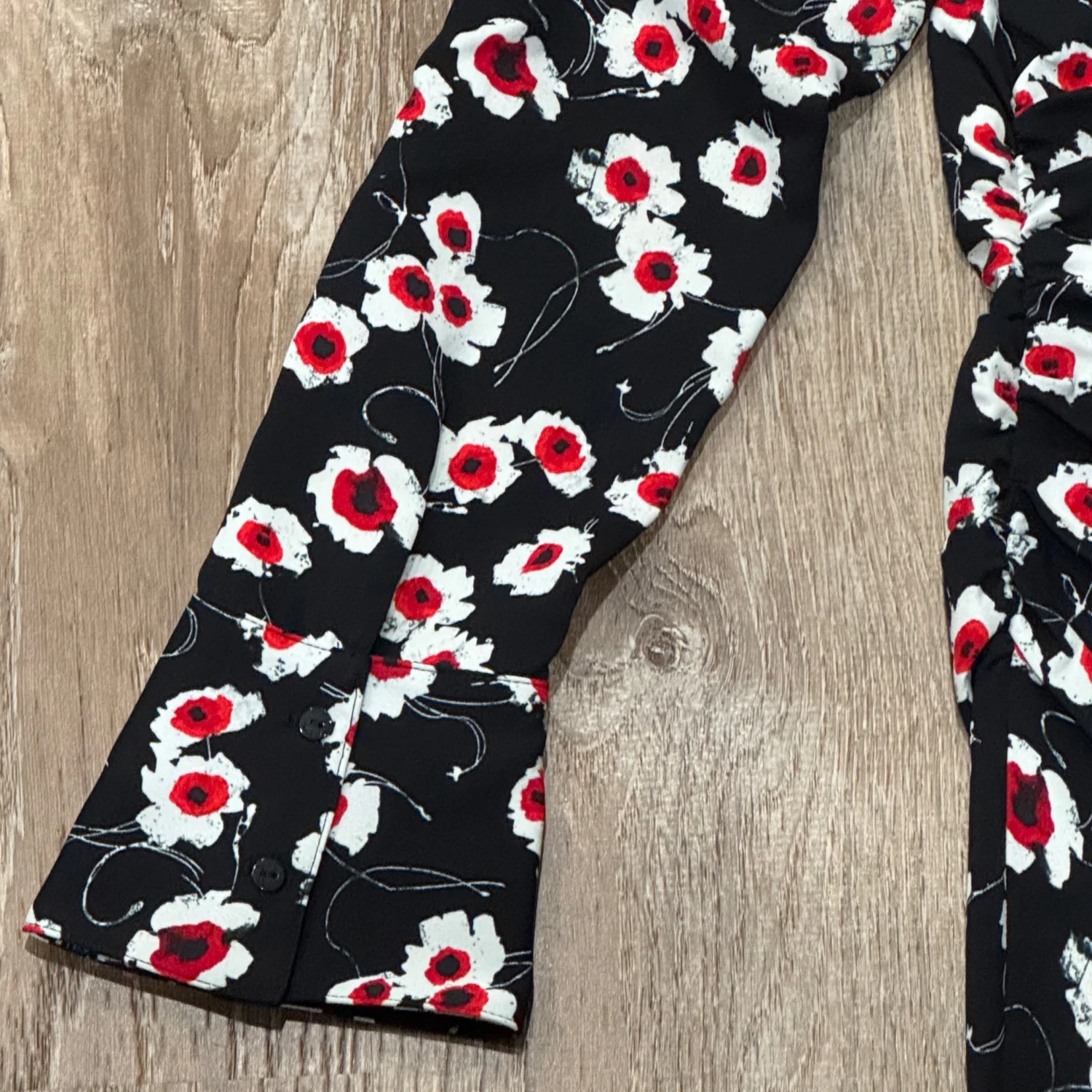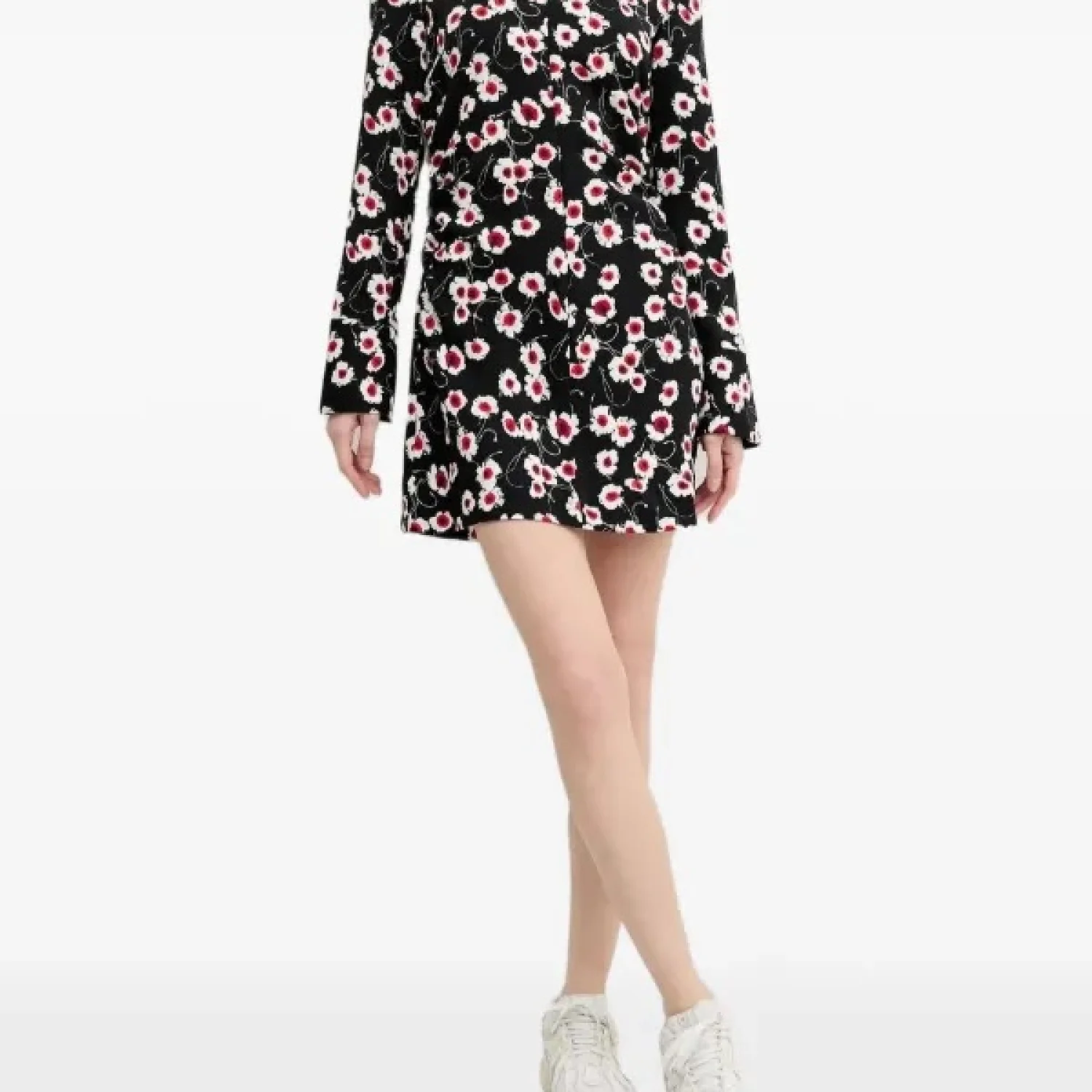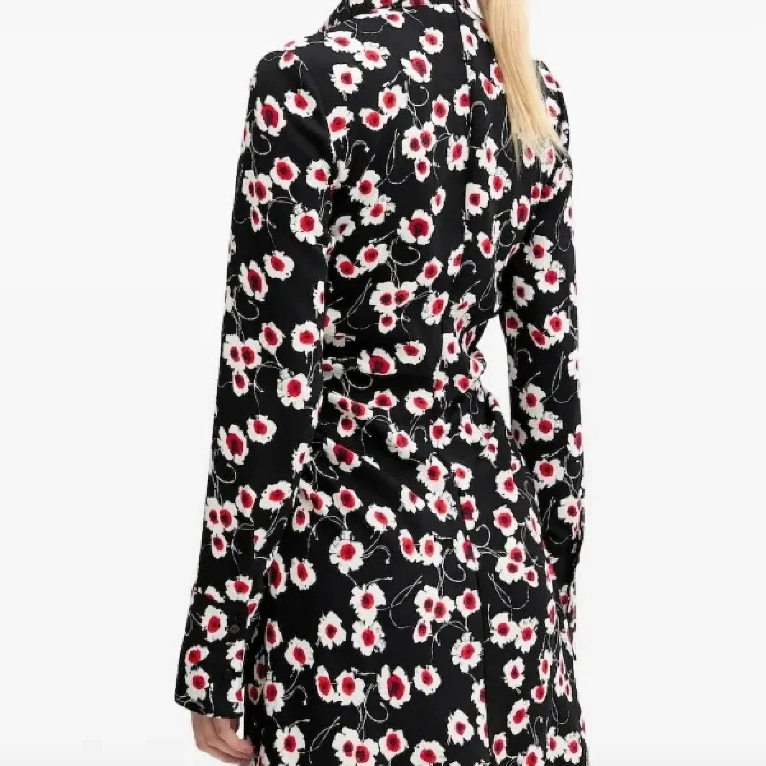 Long-sleeve mini dress, wide lapel collar, side ruching, front zipper closure, and wide shirt-style cuffs with large floral print. Model’s measurements: Height: 175 cm; Waist: 56 cm; Hip: 83 cm Model size: Medium Dress Size: Medium Material: 100% Polyester Wash with dark colors separately Made in China MSRP: $159