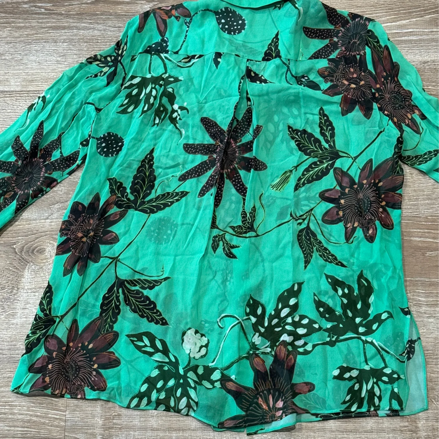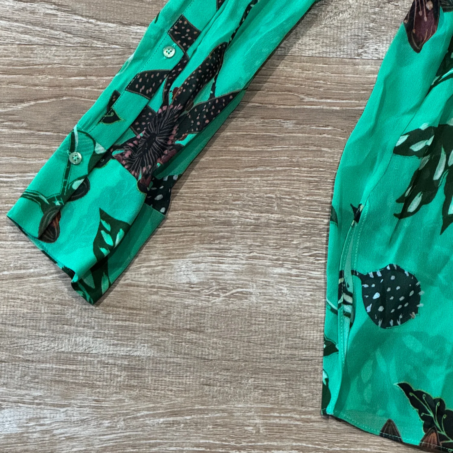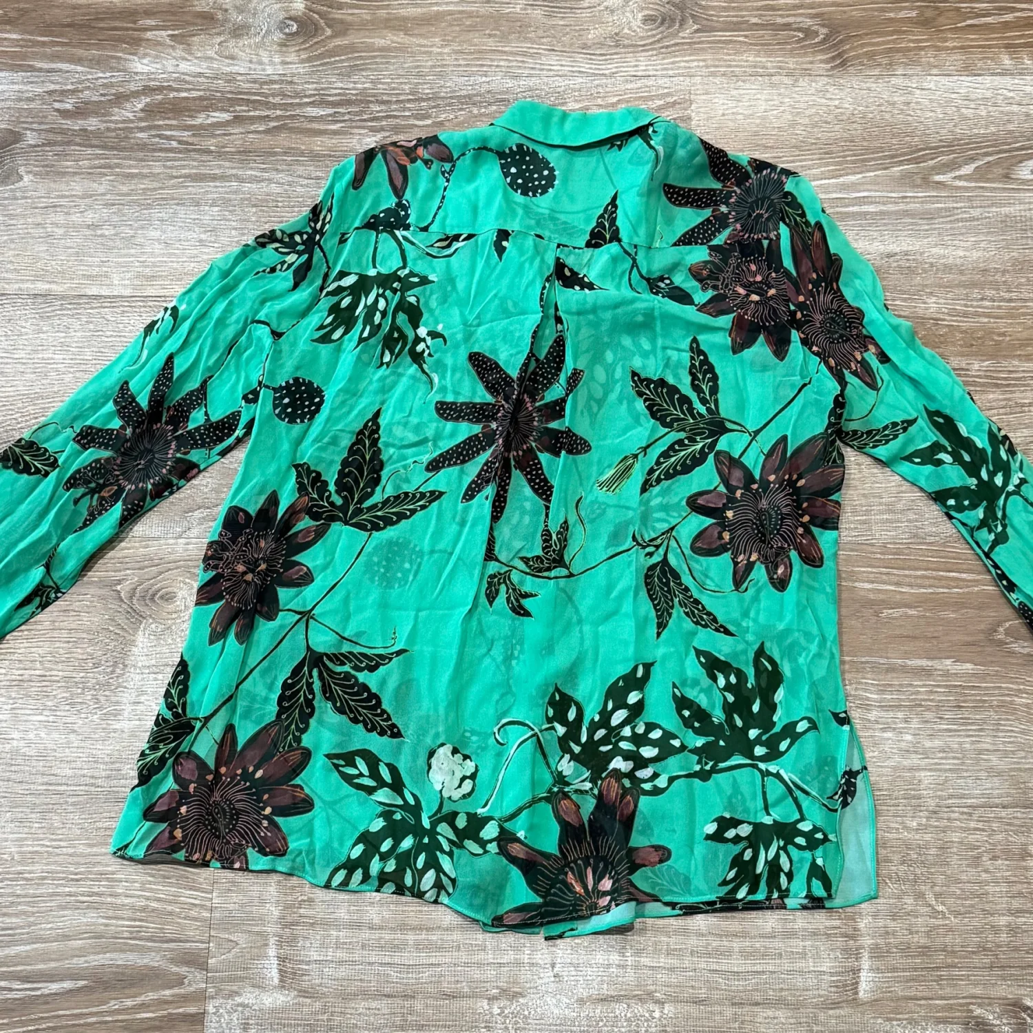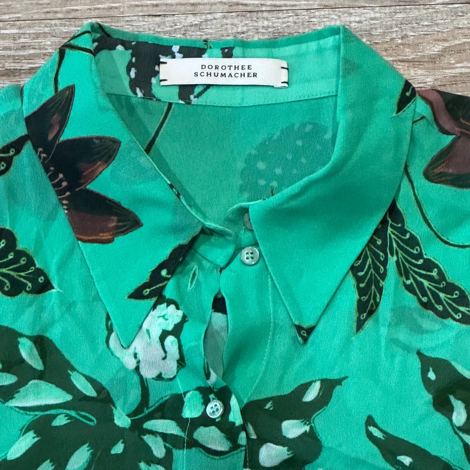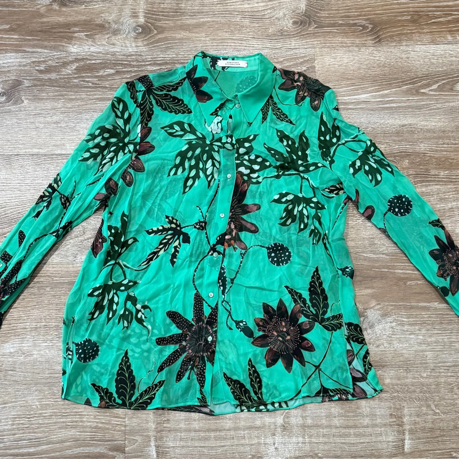 Used great condition like new Add some colour to your wardrobe with this gorgeous green with floral print sheer shirt from German Designer label Dorothee Schumacher. Features a button through front and lightweight material. Size: 4 Small Material: 100% Viscose Underarm pit to pit: approx 20.5” Length: approx 26.5” Very mild fine wash , cold wash , use mild detergent MSRP: €300
