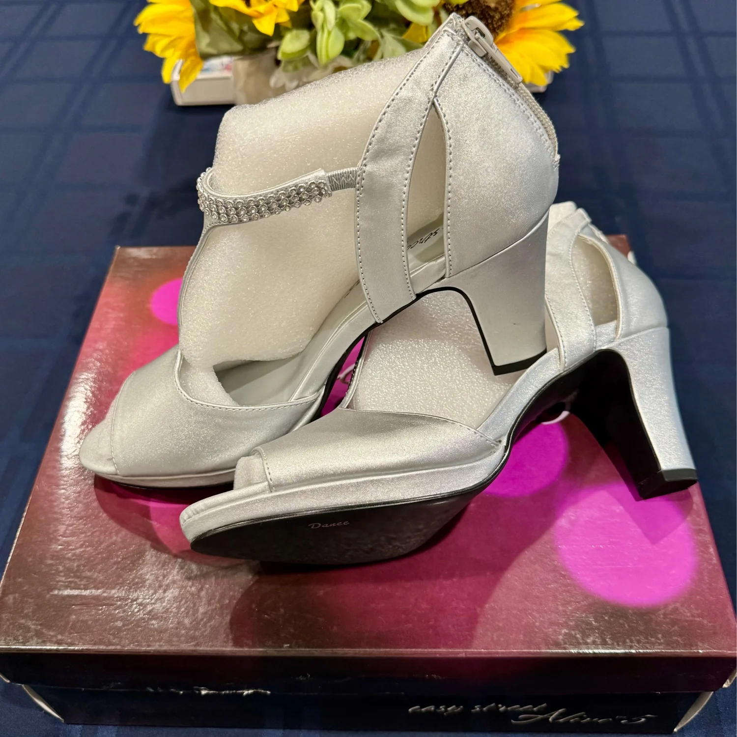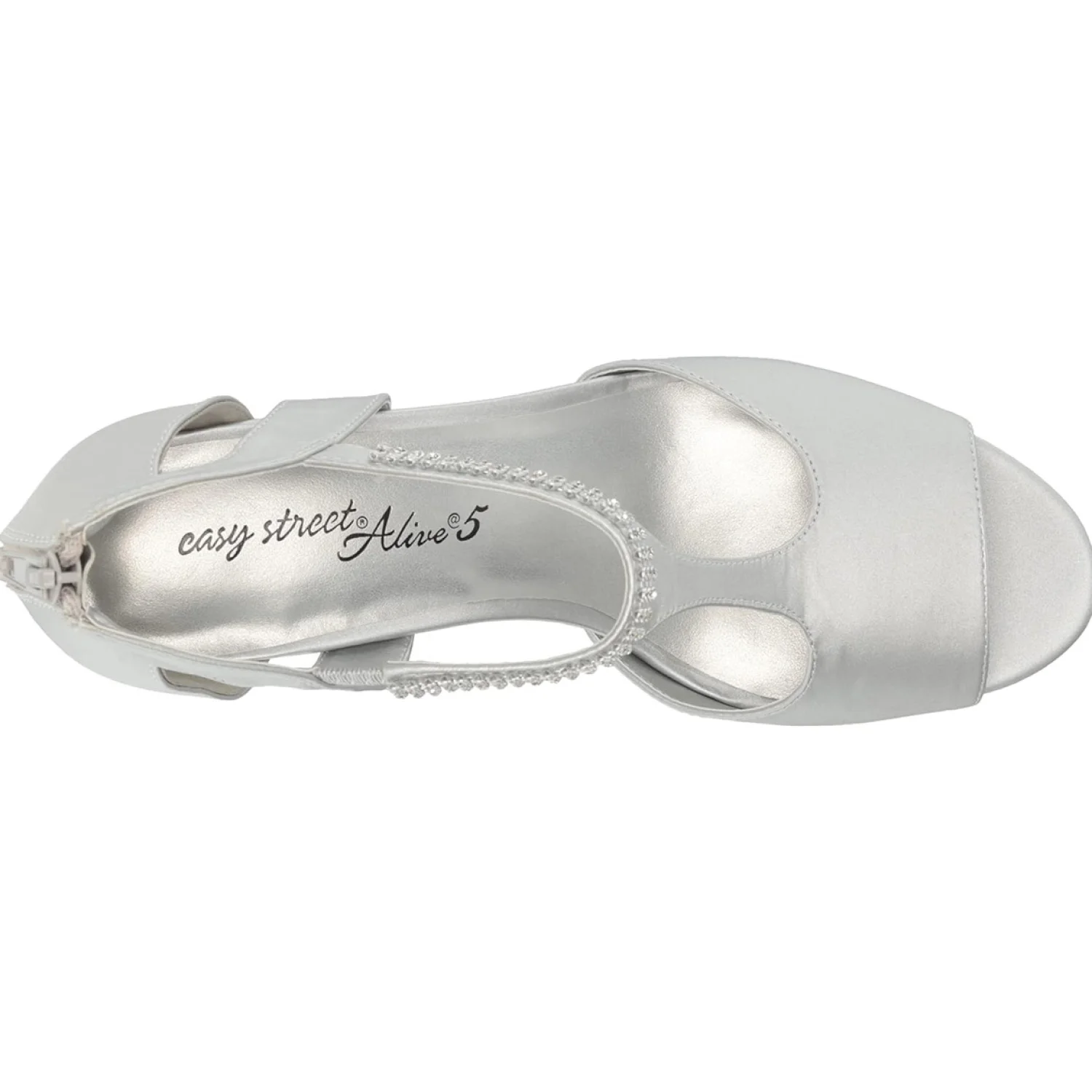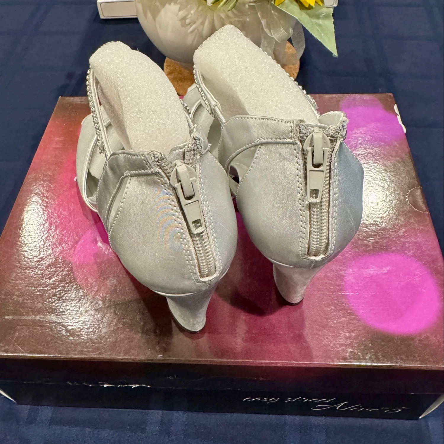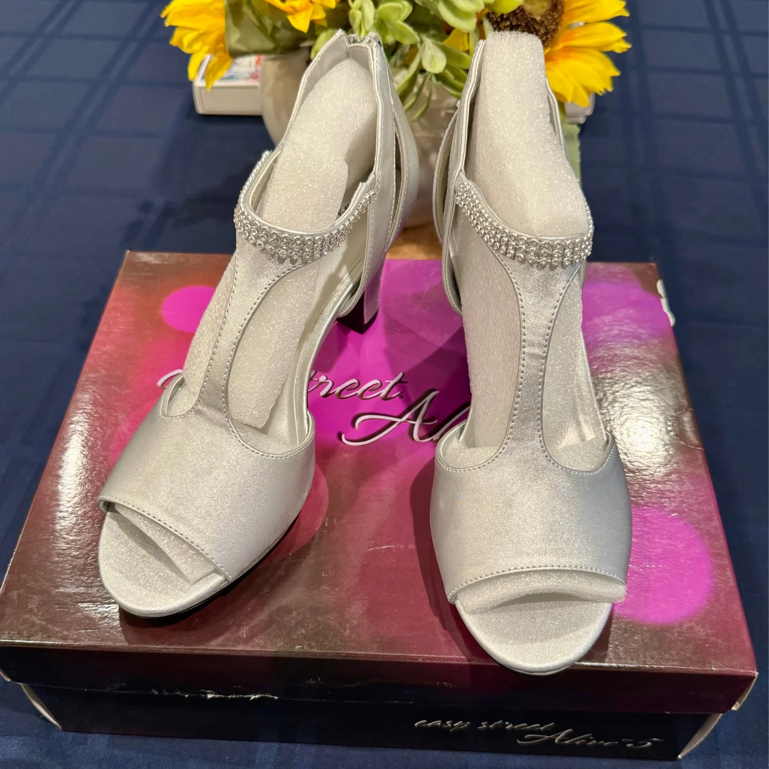 Stand out with the Flash from Easy Street. The t-strap upper design brings a sleekness to your office attire and the stones on the evening colors will bring an elegance to your special occassion outfit. Comfort features include a heel to toe padded insole, platform styling. Back Zipper for easy on/off. Where looking good feels great! Size: 8 Width: Medium Color: Silver Satin Sandal Type: Platform Style Name: Flash Heel Type: Stiletto Heel Toe Style: Open Toe Pattern: Solid Strap Type: T-Strap Sole material: Rubber Outer material: Faux Leather Closure type: Back Zipper 2.25" Dress heel, On trend t-strap upper design Fashionable platform styling Back Zipper closure for easy on/off Classic dress heel Padded insole MSRP: $69.99