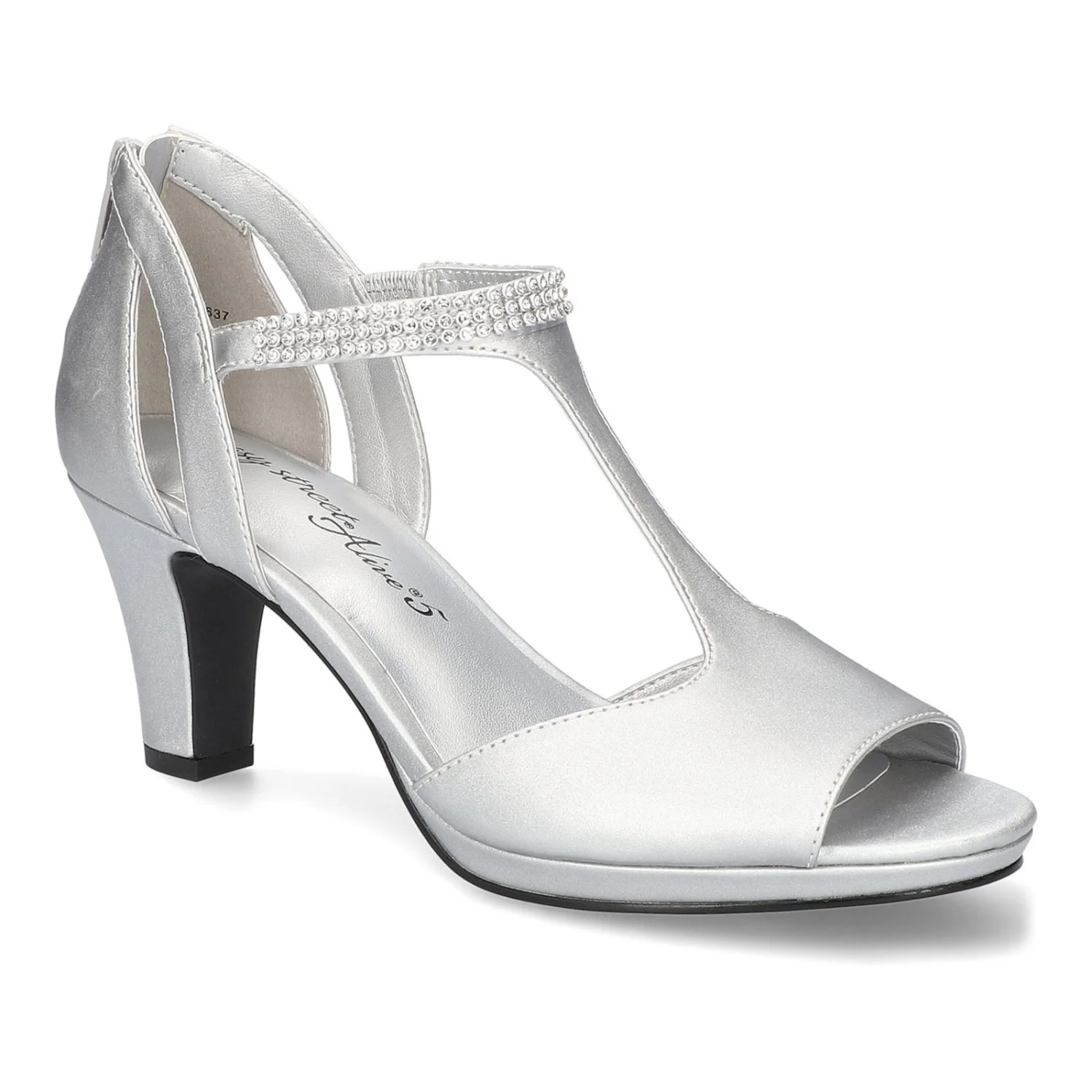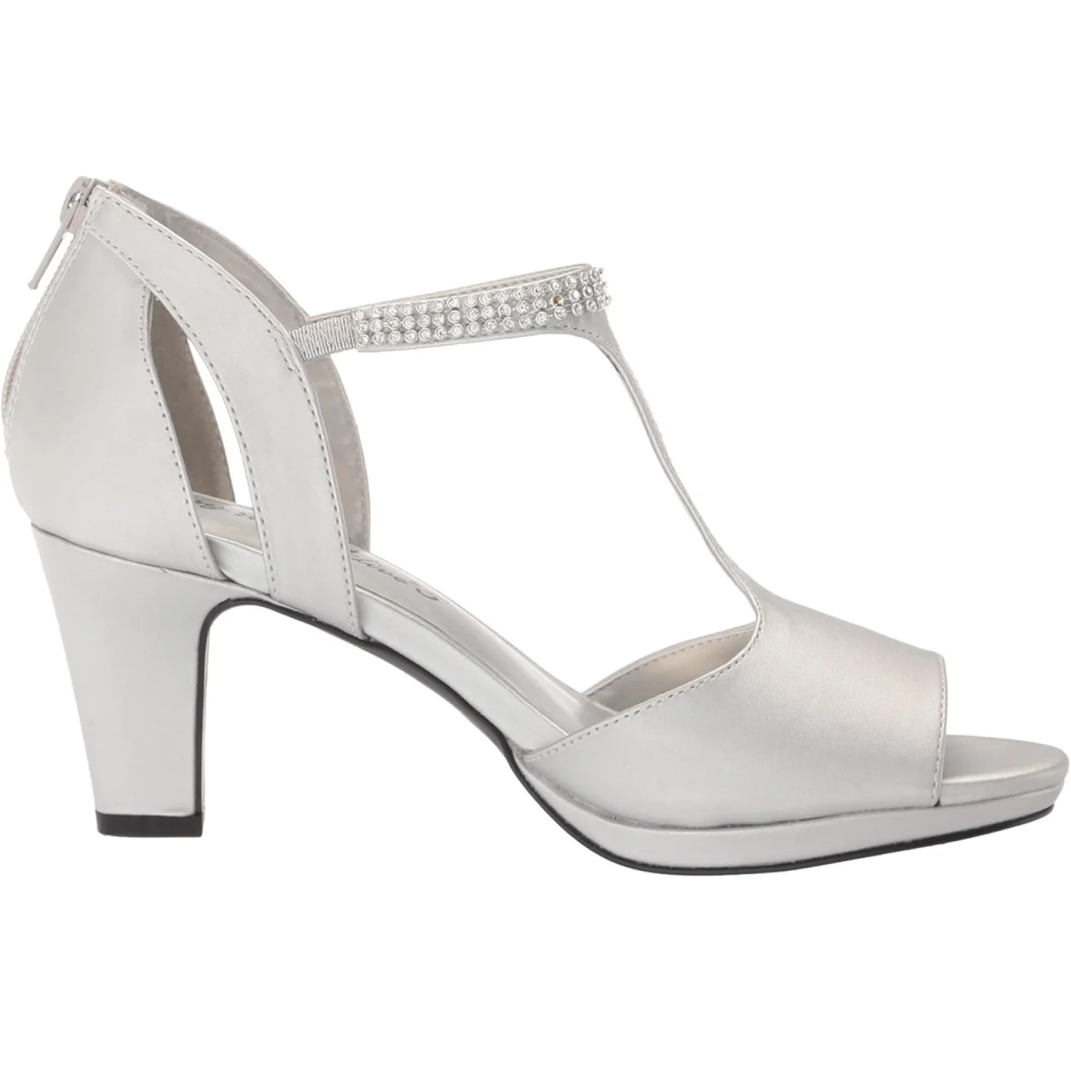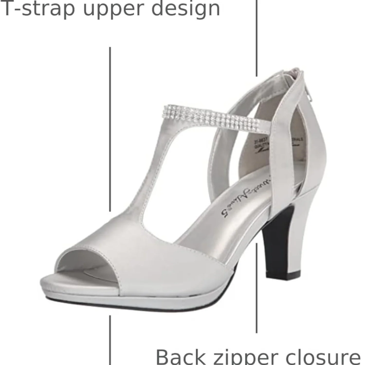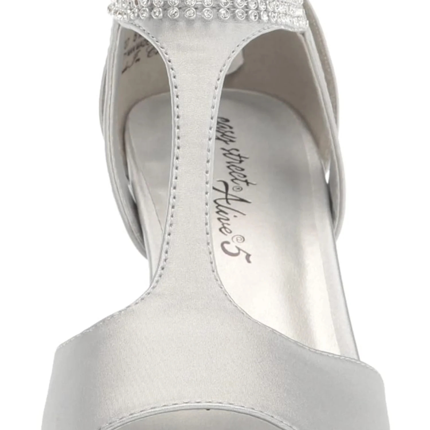 Stand out with the Flash from Easy Street. The t-strap upper design brings a sleekness to your office attire and the stones on the evening colors will bring an elegance to your special occassion outfit. Comfort features include a heel to toe padded insole, platform styling. Back Zipper for easy on/off. Where looking good feels great! Size: 8 Width: Medium Color: Silver Satin Sandal Type: Platform Style Name: Flash Heel Type: Stiletto Heel Toe Style: Open Toe Pattern: Solid Strap Type: T-Strap Sole material: Rubber Outer material: Faux Leather Closure type: Back Zipper 2.25" Dress heel, On trend t-strap upper design Fashionable platform styling Back Zipper closure for easy on/off Classic dress heel Padded insole MSRP: $69.99