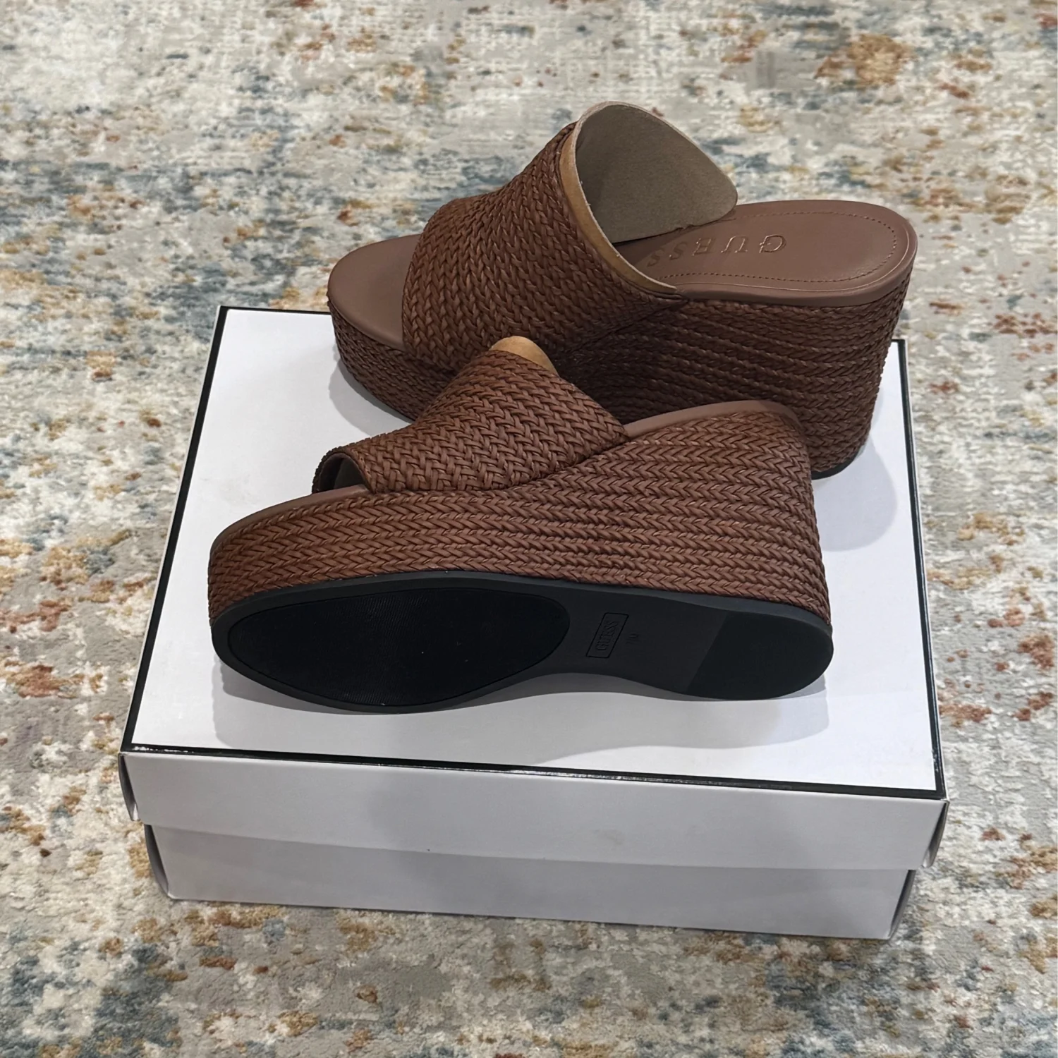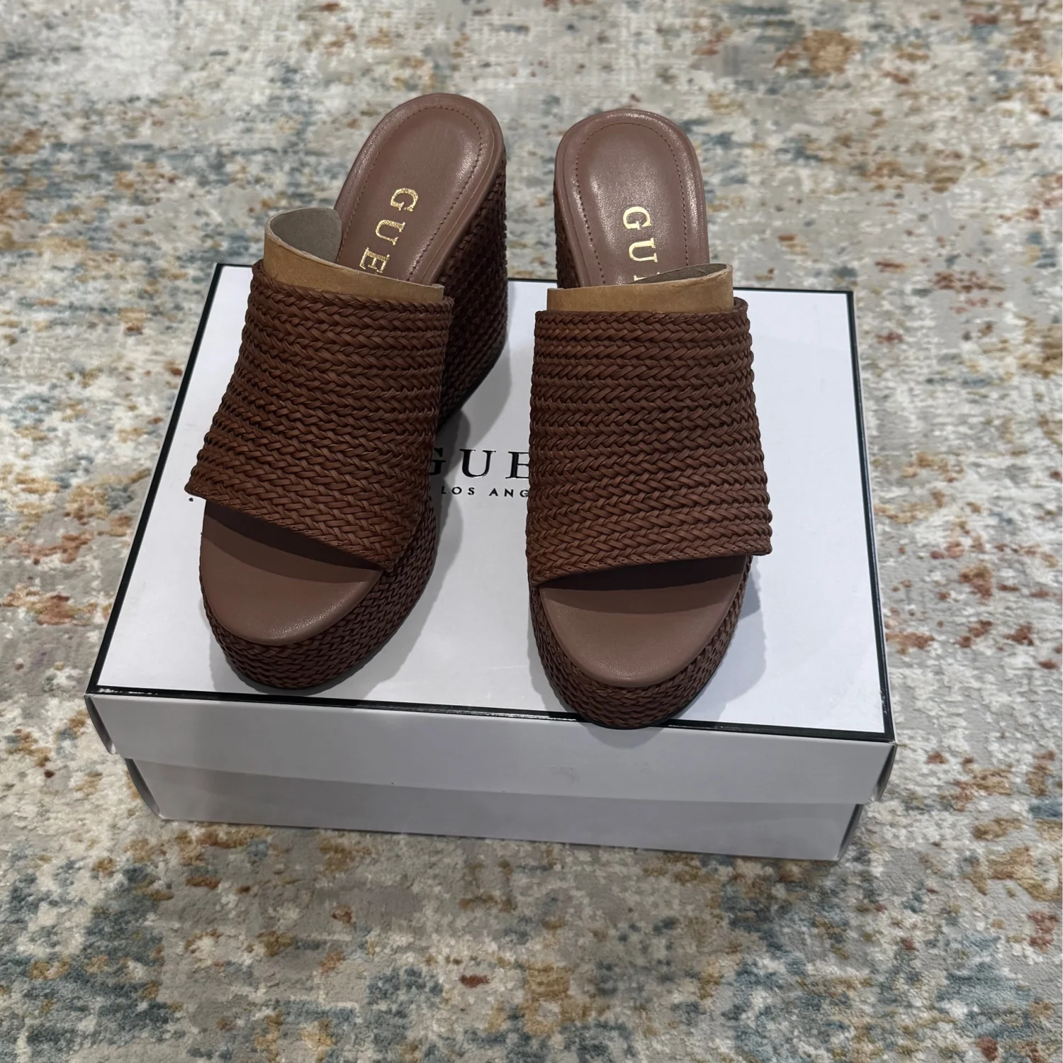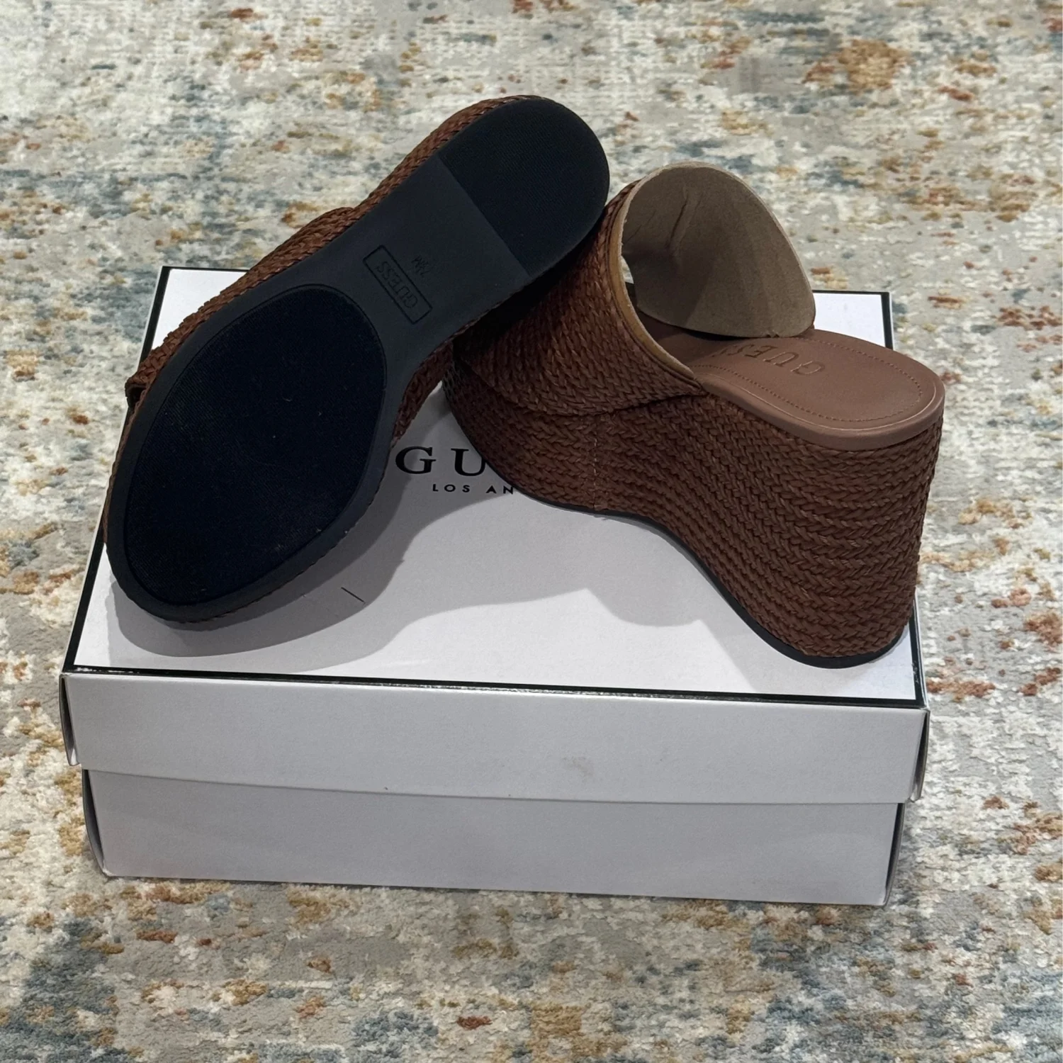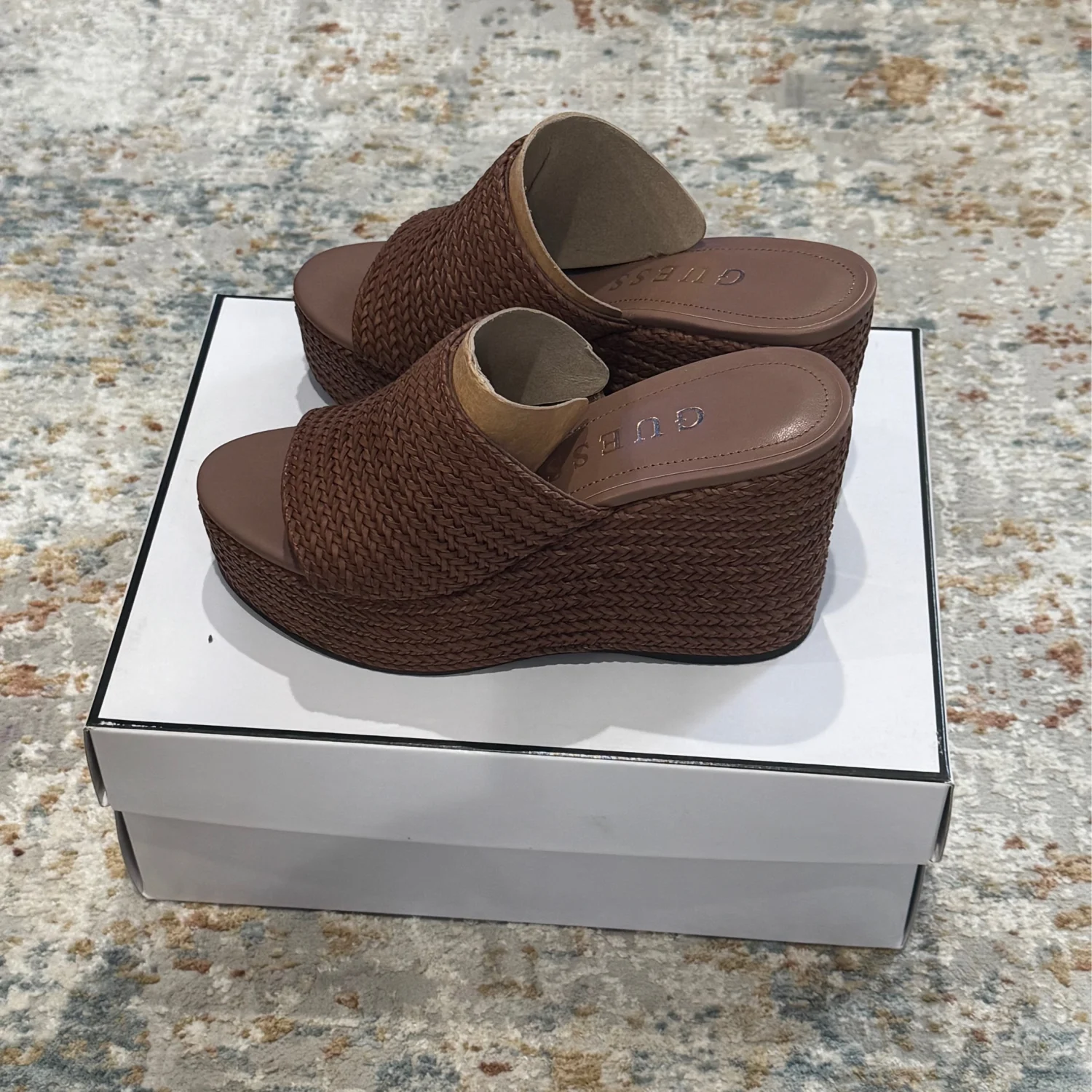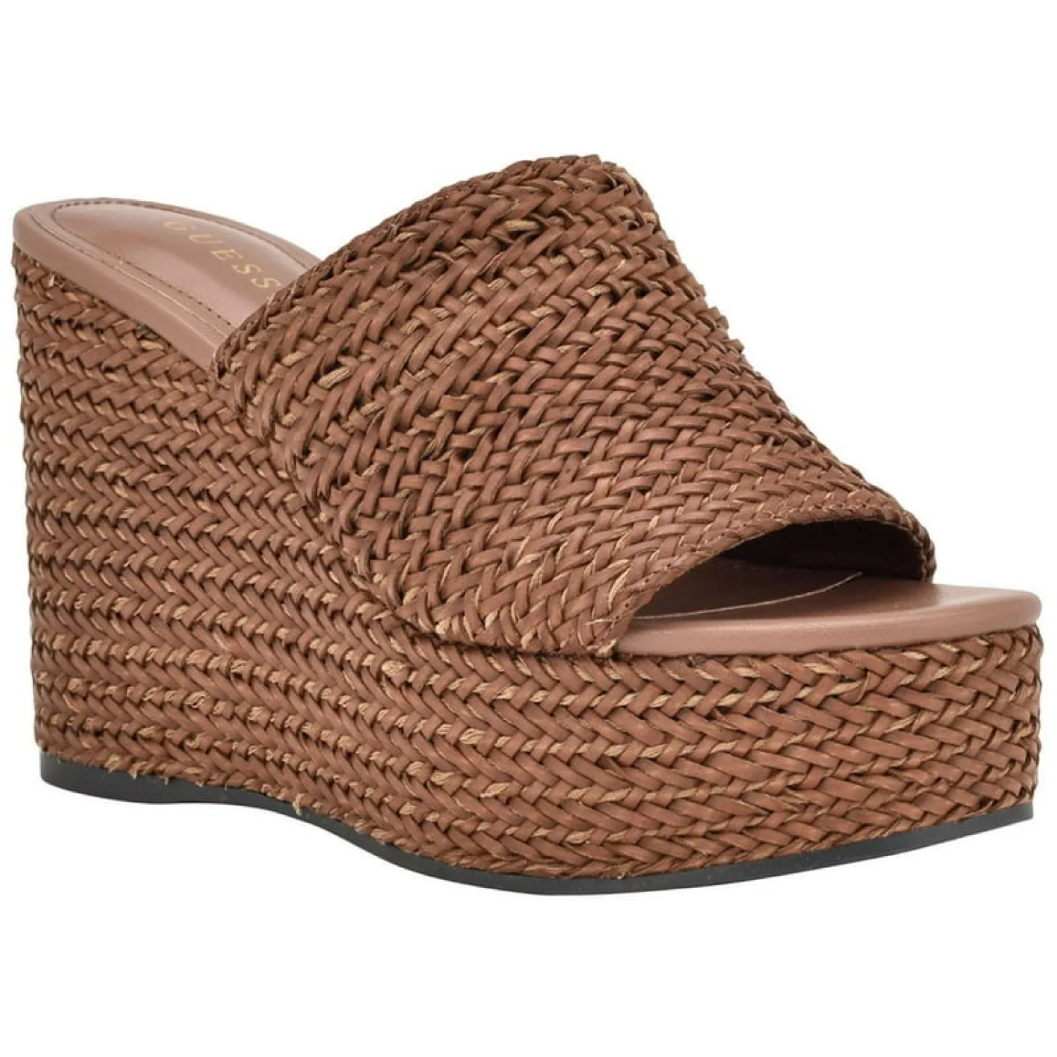 Step out in stunning style with the Yenisa wedge sandal from Guess. Appealing woven details on the vamp band, platform and wedge heel make this slide sandal a head turner from every angle. A synthetic sole with tread pattern offers stability. The GUESS Yenisa sandal is the perfect additional to complete your look for the season. The single band upper with the wearable height makes these your day to night go to sandals. Established 1981, GUESS is a global lifestyle brand and a symbol of a young, adventurous lifestyle. Size: 7.5 Width: Medium Synthetic upper Slip-on Round open toe Synthetic lining Synthetic footbed 1.5" platform, 4" wedge heel Synthetic sole MSRP: $119