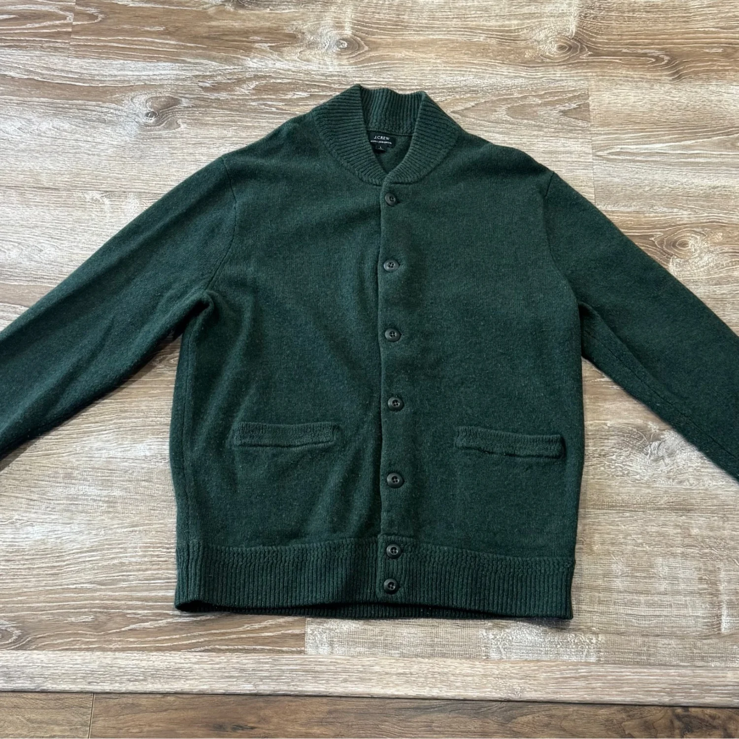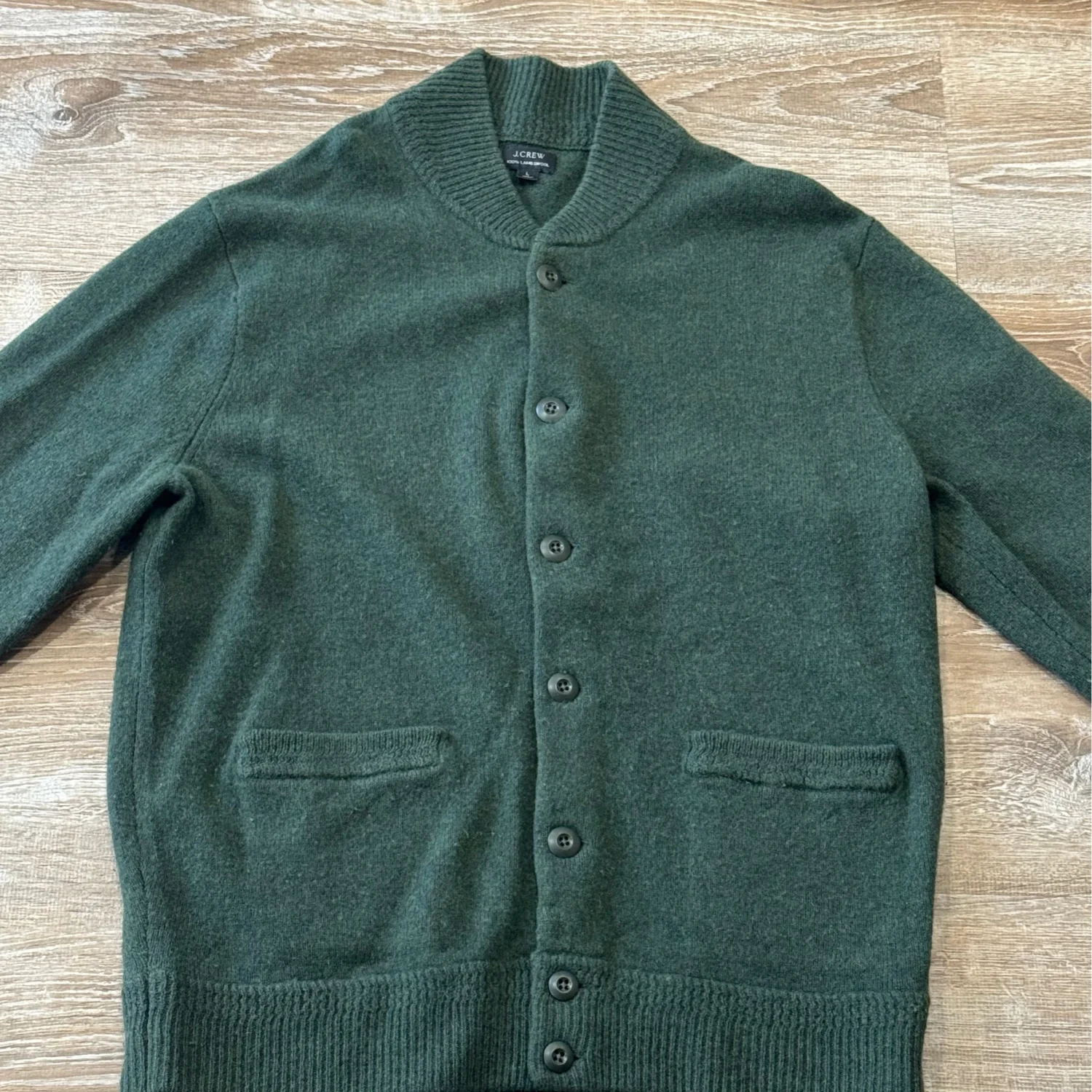 Used good condition J.Crew sweater-jacket hybrid is made with lambswool. Soft, warm and always a good decision when the temperatures drop, lambswool makes the perfect layer. Stay warm and stylish with this green shawl collar cardigan. Perfect for layering, this sweater offers both comfort and elegance. Size: Large Material: 100% Lambs Wool Chest: 41-43” Neck: 16-16.5” Waist: 35-37” Arm length: 34-35” Dry clean Only Made in china