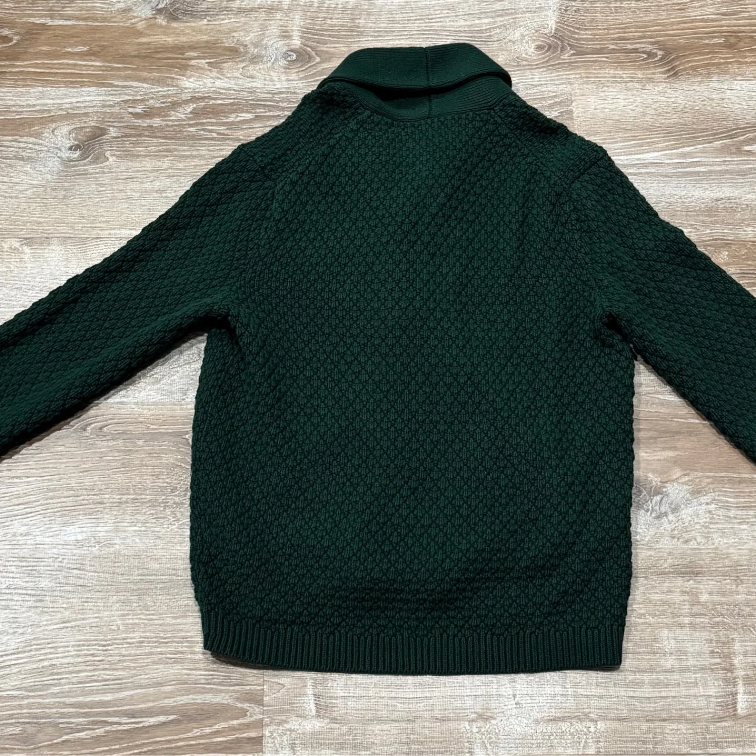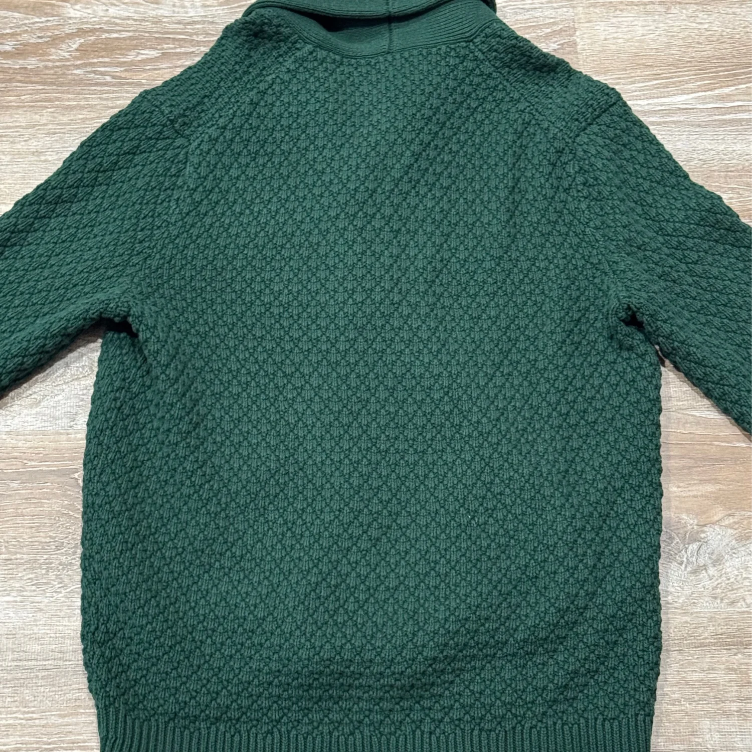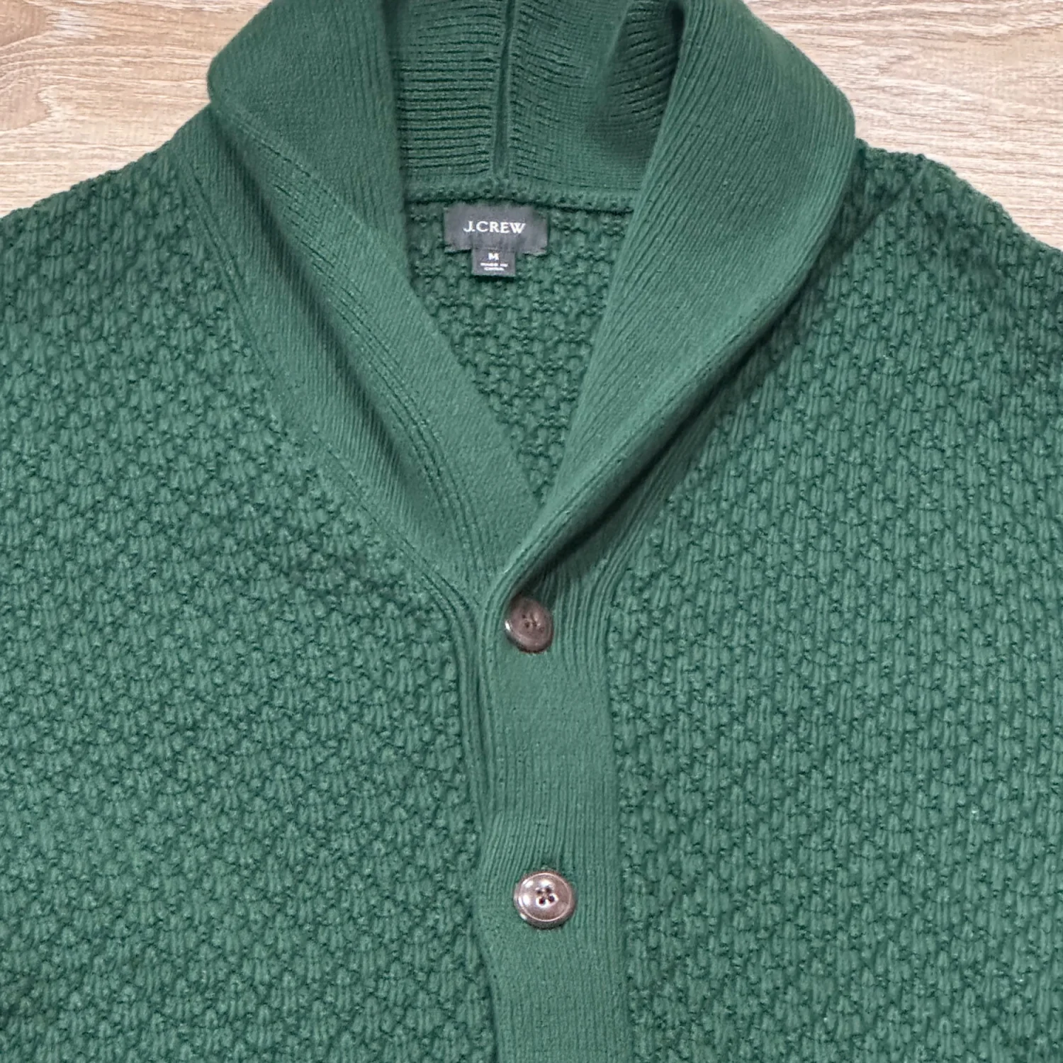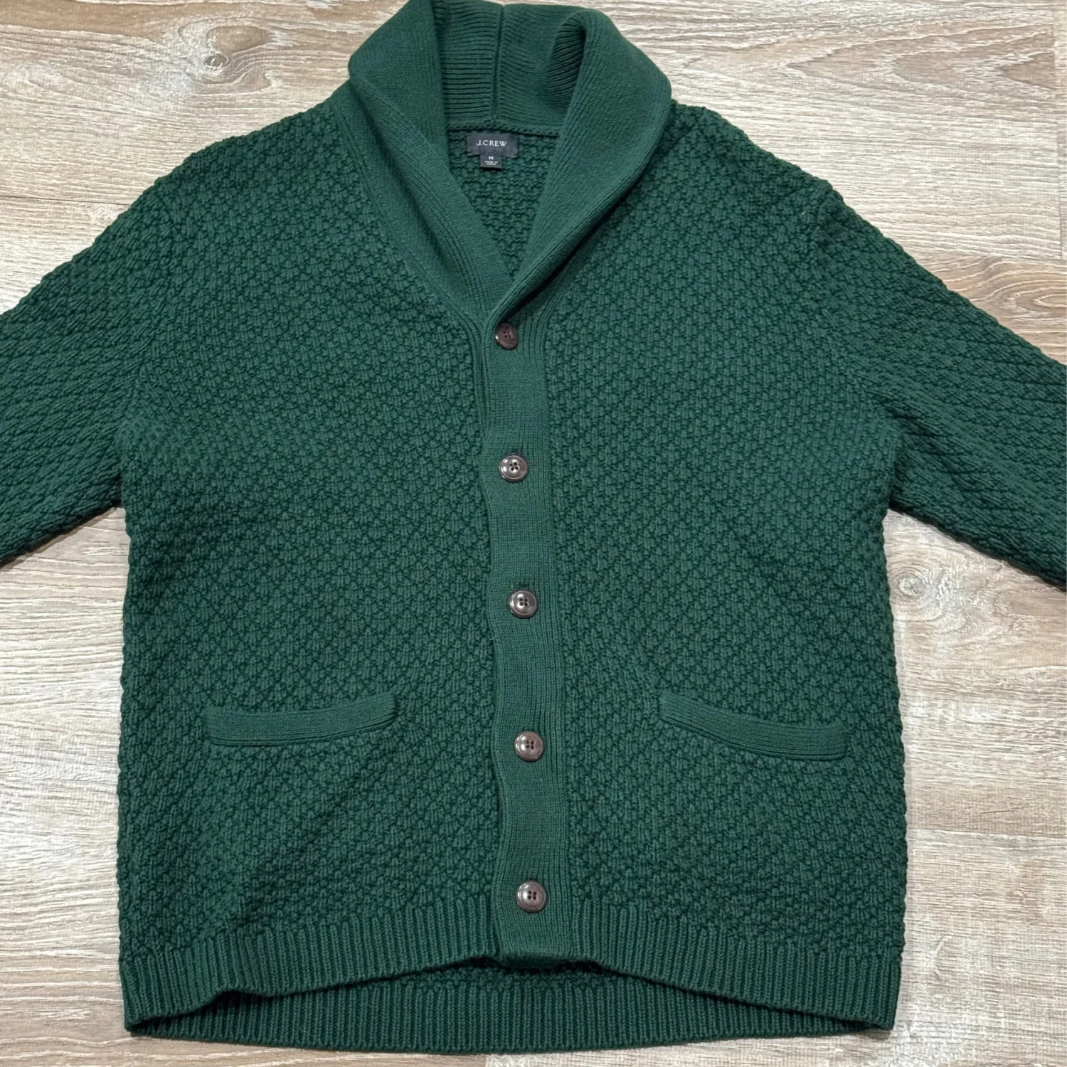 Used great condition like new. The cardigan in the image is a J. Crew men's green shawl collar cardigan sweater. It features a textured checker knit pattern, a wide shawl collar, front patch pockets, and contrasting brown buttons. Size: Medium Material: 100% Cotton Chest Width: 22” Length: 27” Machine wash cold with like colors Made in China