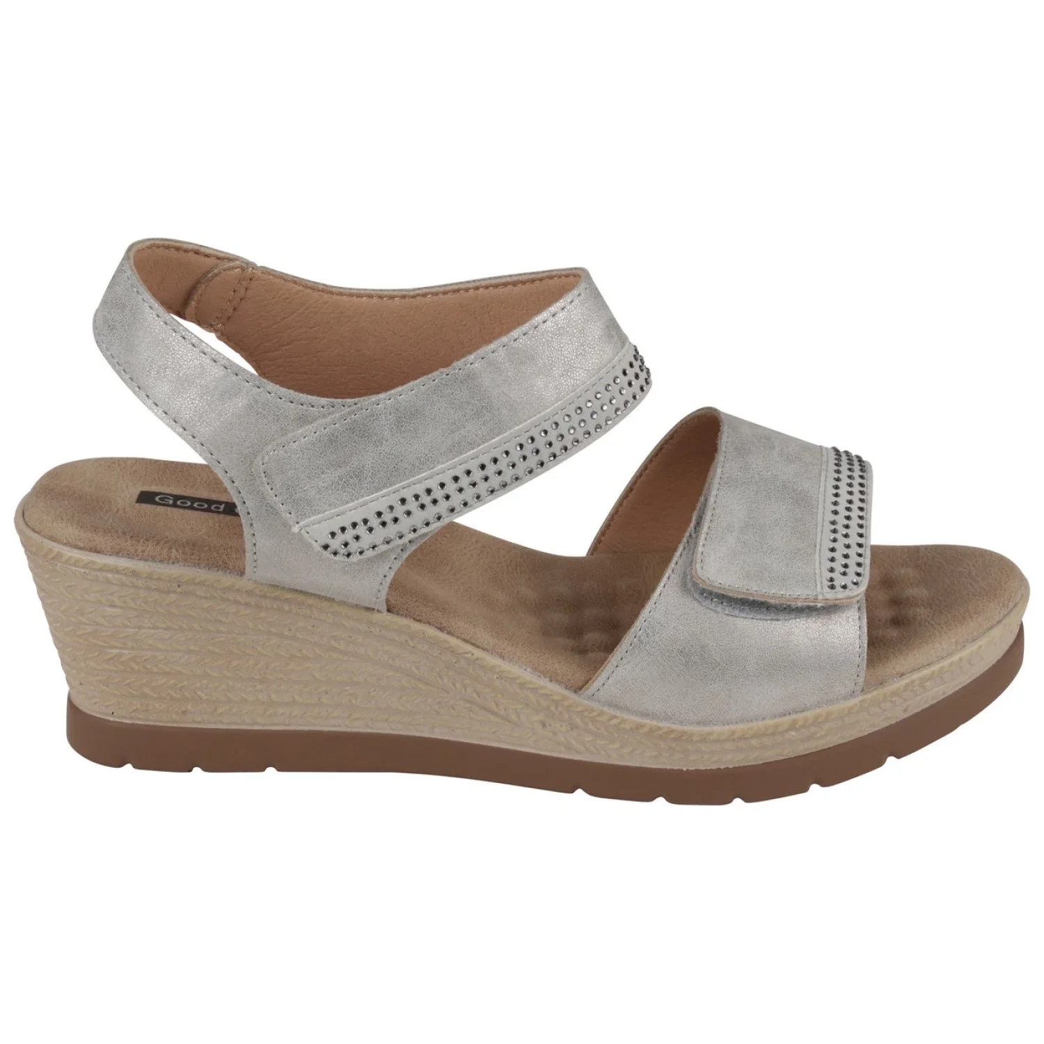 The GC Shoes Jorda slide sandal comes with style and comfort that stays even on a scale. This , double strap slingback sandal gets its lift with a wedge heel that coordinates it beautifully with it's double stay-put upper. Size: 10 2.25" wedge heel, 1.25" platform height Shoe width- medium Stay-put closure Cushioned memory foam footbed for extra comfort, slip-resistant rubber sole Polyurethane upper, synthetic lining, rubber sole Round open toe Stay-put rhinestone detail Polyurethane Hand Wash Imported MSRP: $60