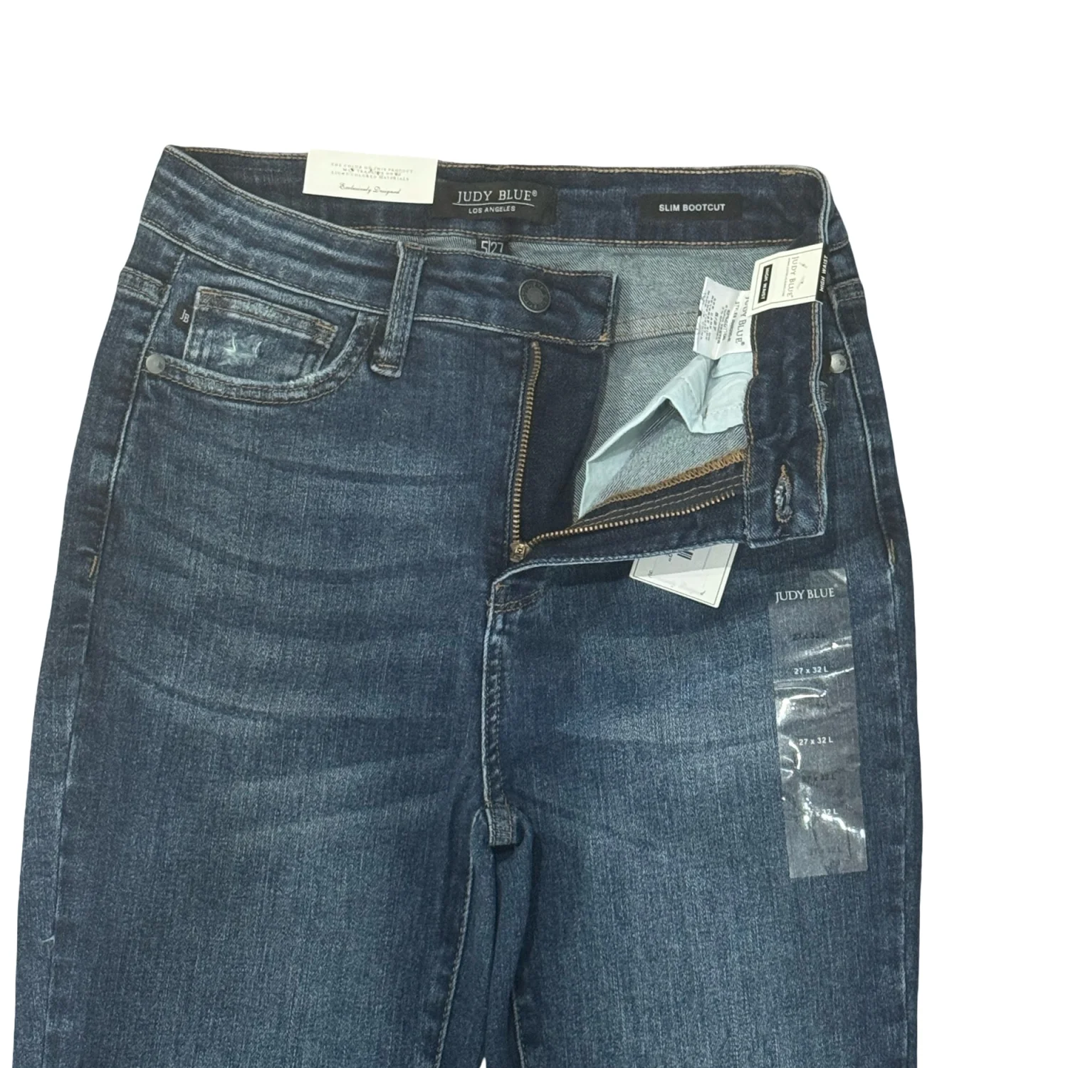 Judy Blue Classic dark blue jeans with a flattering high waist and slight whiskering. Soft stretch denim for comfortable all-day wear. Versatile style that pairs easily with tops and heels. Includes subtle fading details for a lived-in look. Size: 5/27 Waist: 27” Length: 41” Inseam: 31” High waisted Elastic waist Color: Dark blue Button and zipper 5 pockets Slim Bootcut Material: 92% cotton 6% polyester 2% spandex Hand wash cold , wash dark colors separately Made in China MSRP: $85!