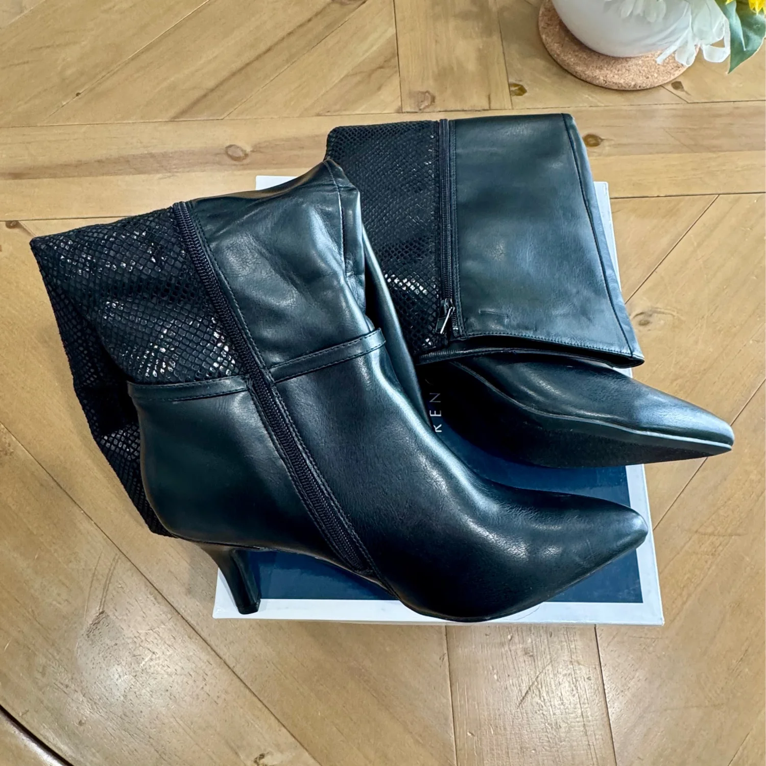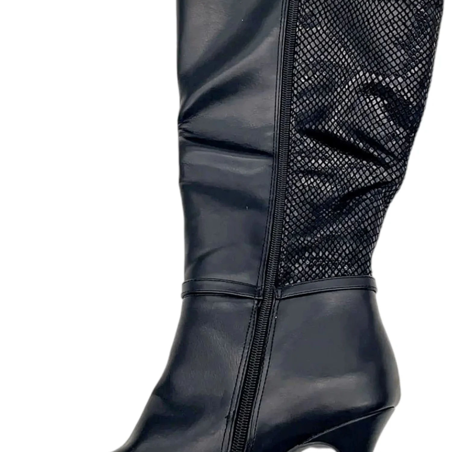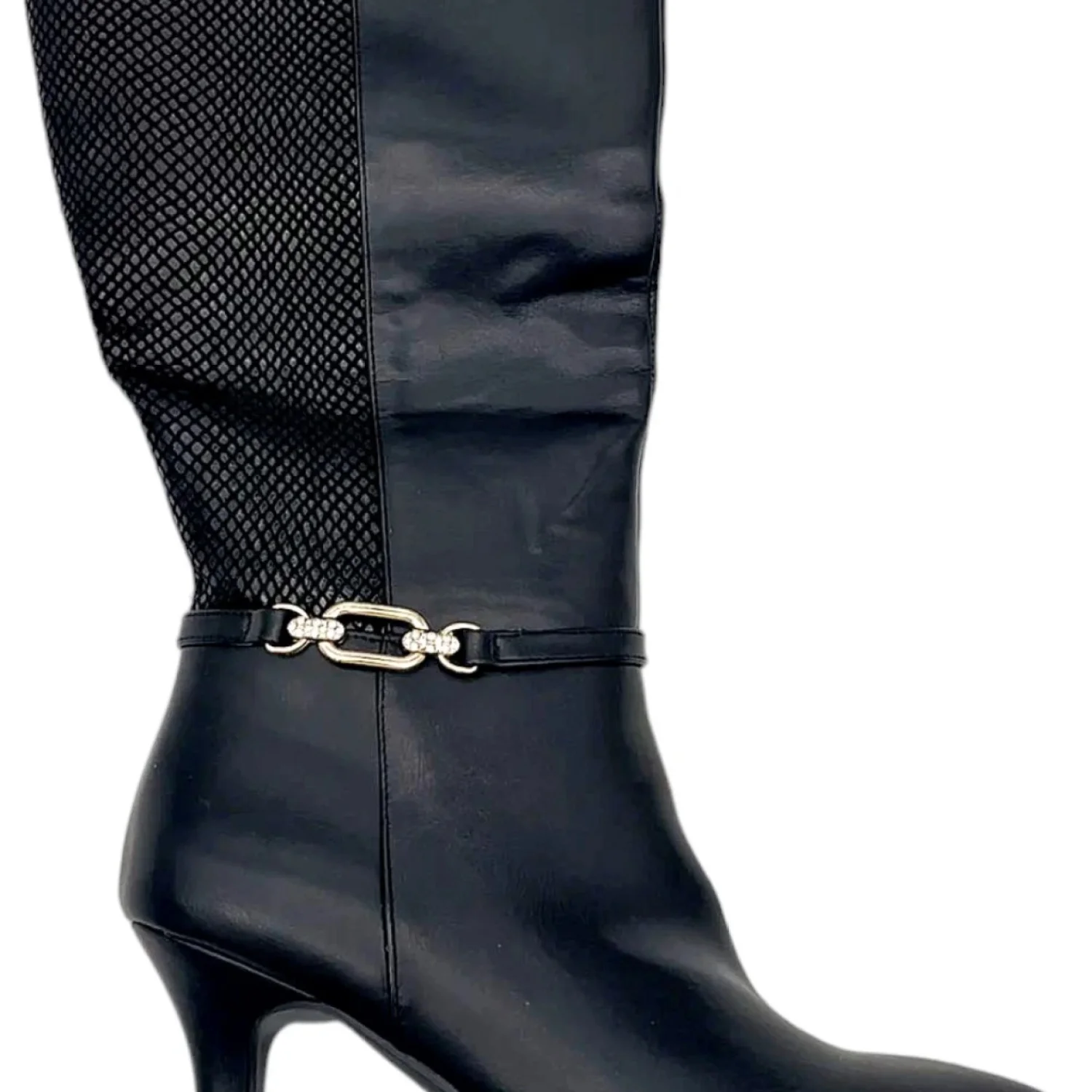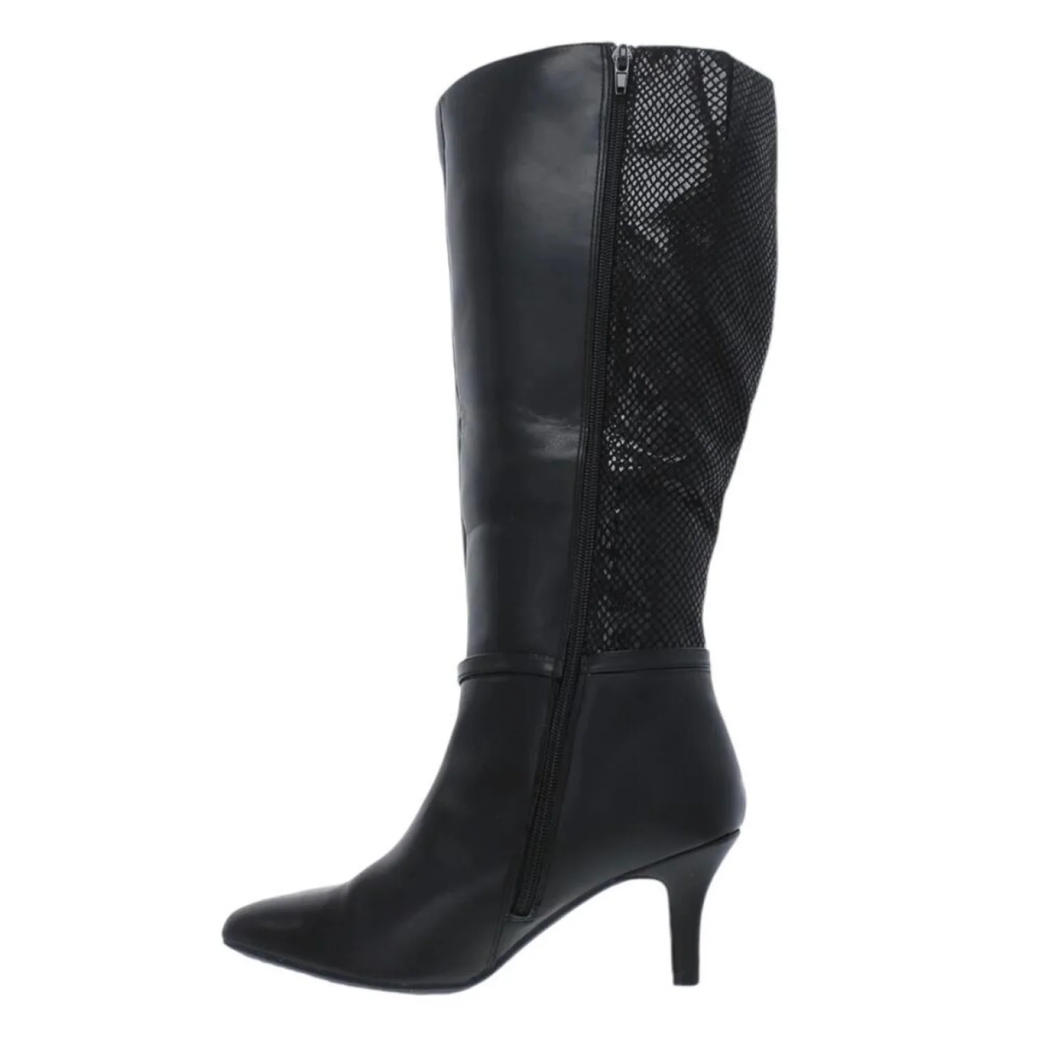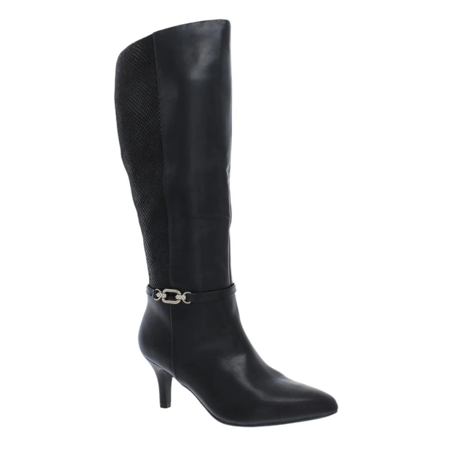 Step out in style with these elegant black knee-high boots. Perfect for any occasion, these boots offer both comfort and sophistication.Women's Freylyn Buckled Knee High Dress Boots from Karen Scott. Slender straps and metallic buckles secure a sleek silhouette in these stiletto boots. 3" stiletto heel Almond toe Inside zipper Faux leather fabric upper fabric lining manmade sole. Color Black with snake print on back half. Size: 11 Width: Medium Retail $100