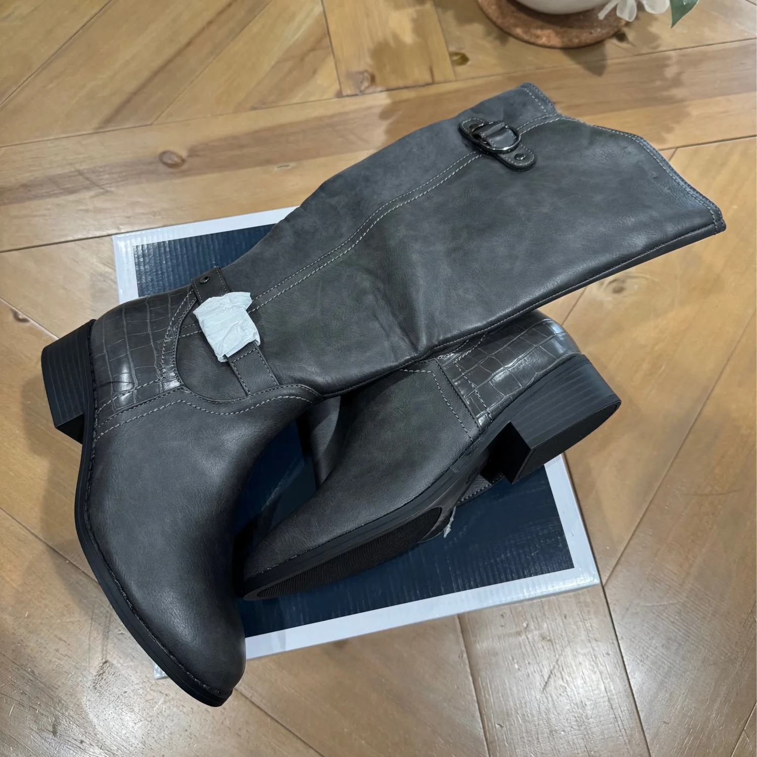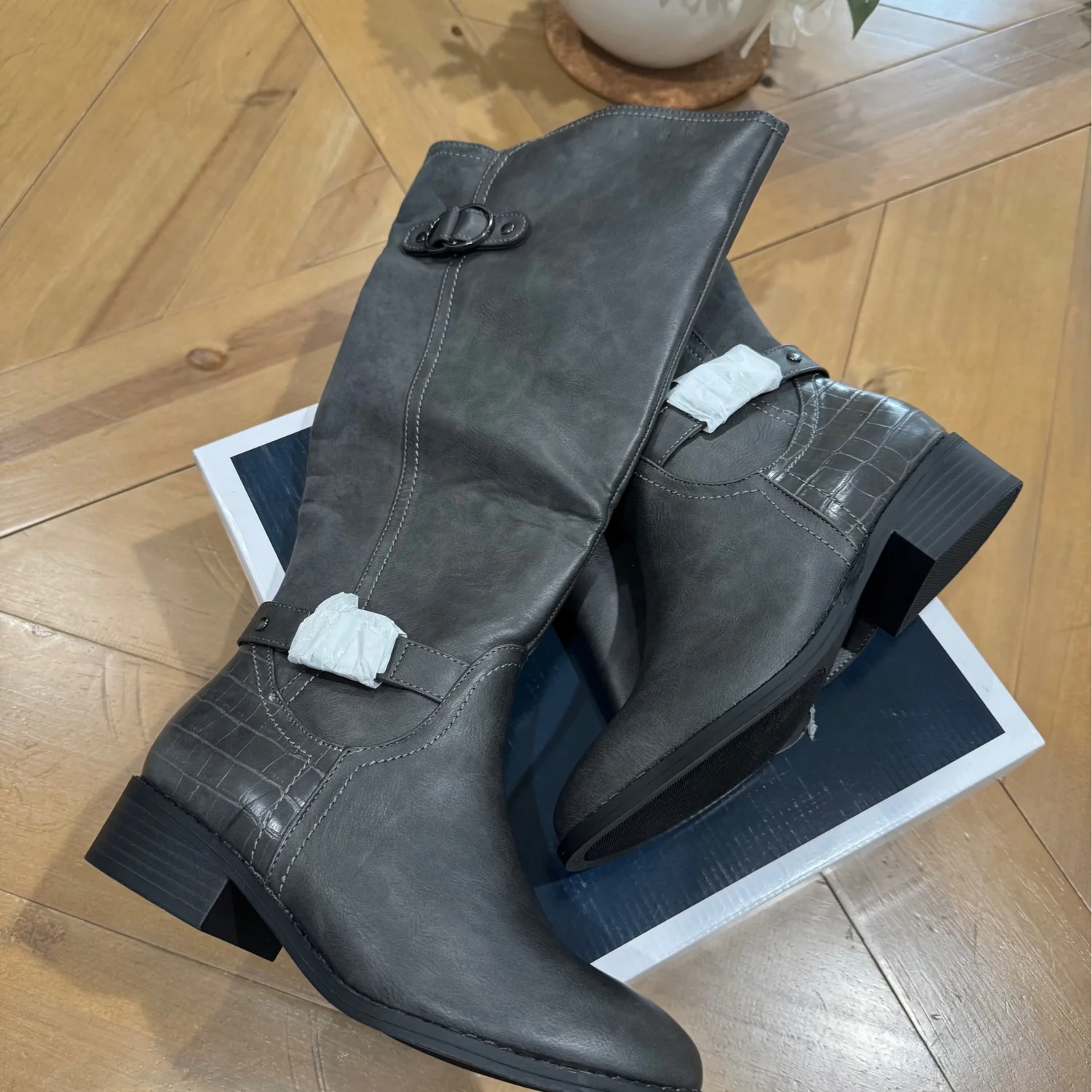 Step out in style with these elegant gray knee-high boots. Perfect for any occasion, these boots offer both comfort and fashion. Size: 6.5 Width: Medium 1-1/2" block heel Round-toe riding boots with inner ankle zipper closure Buckled straps at shaft Manmade upper fabric lining manmade sole Comes in original box MSRP: $100