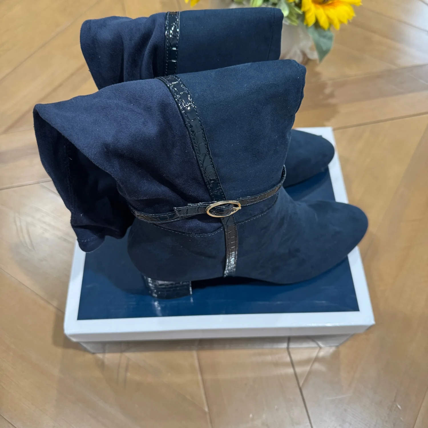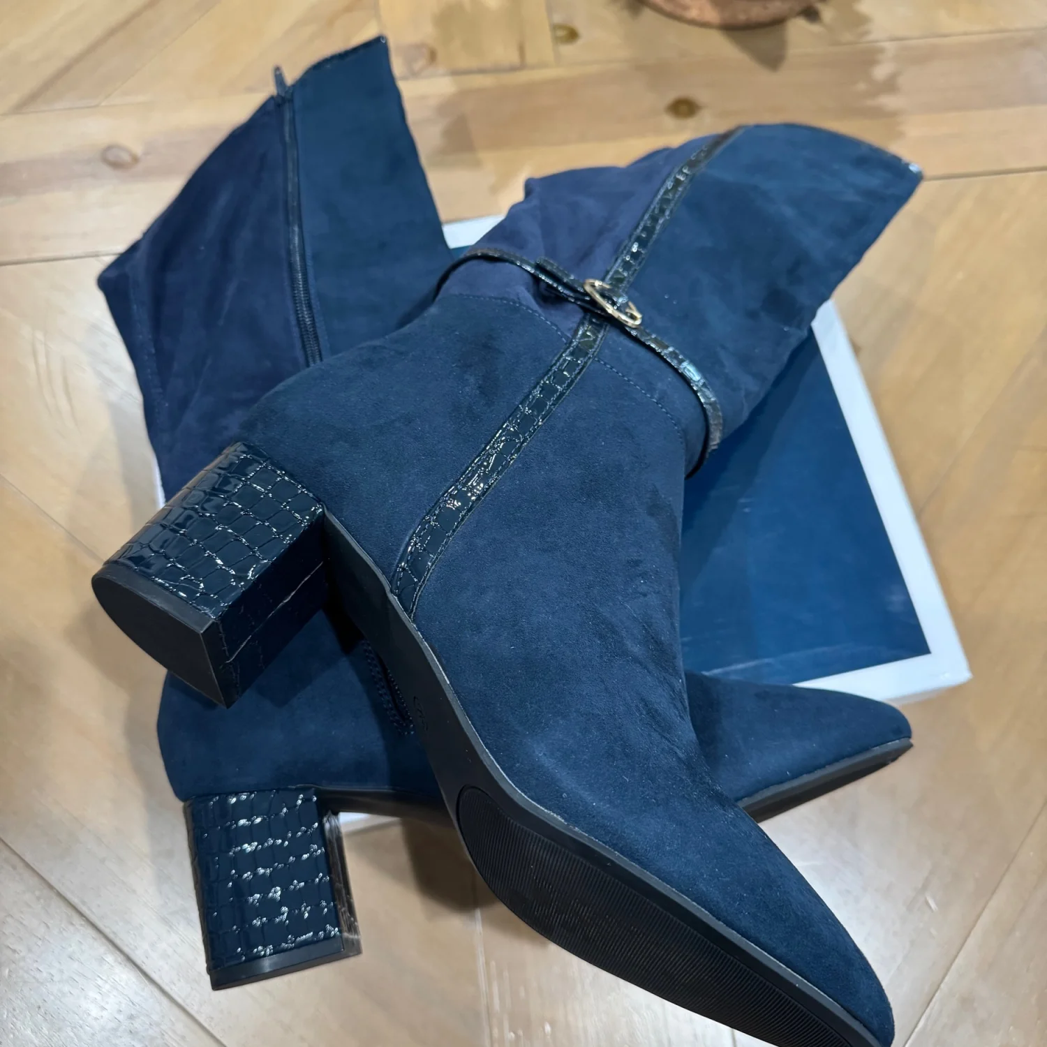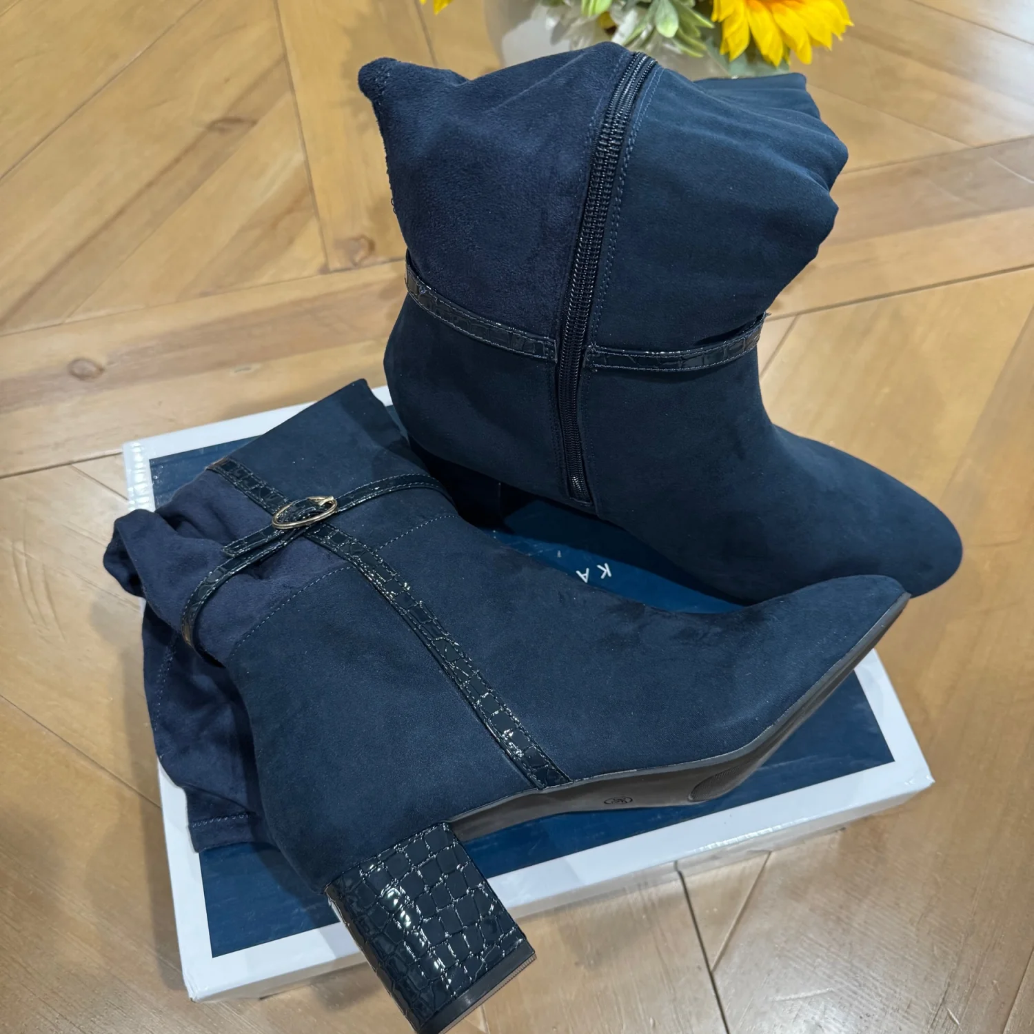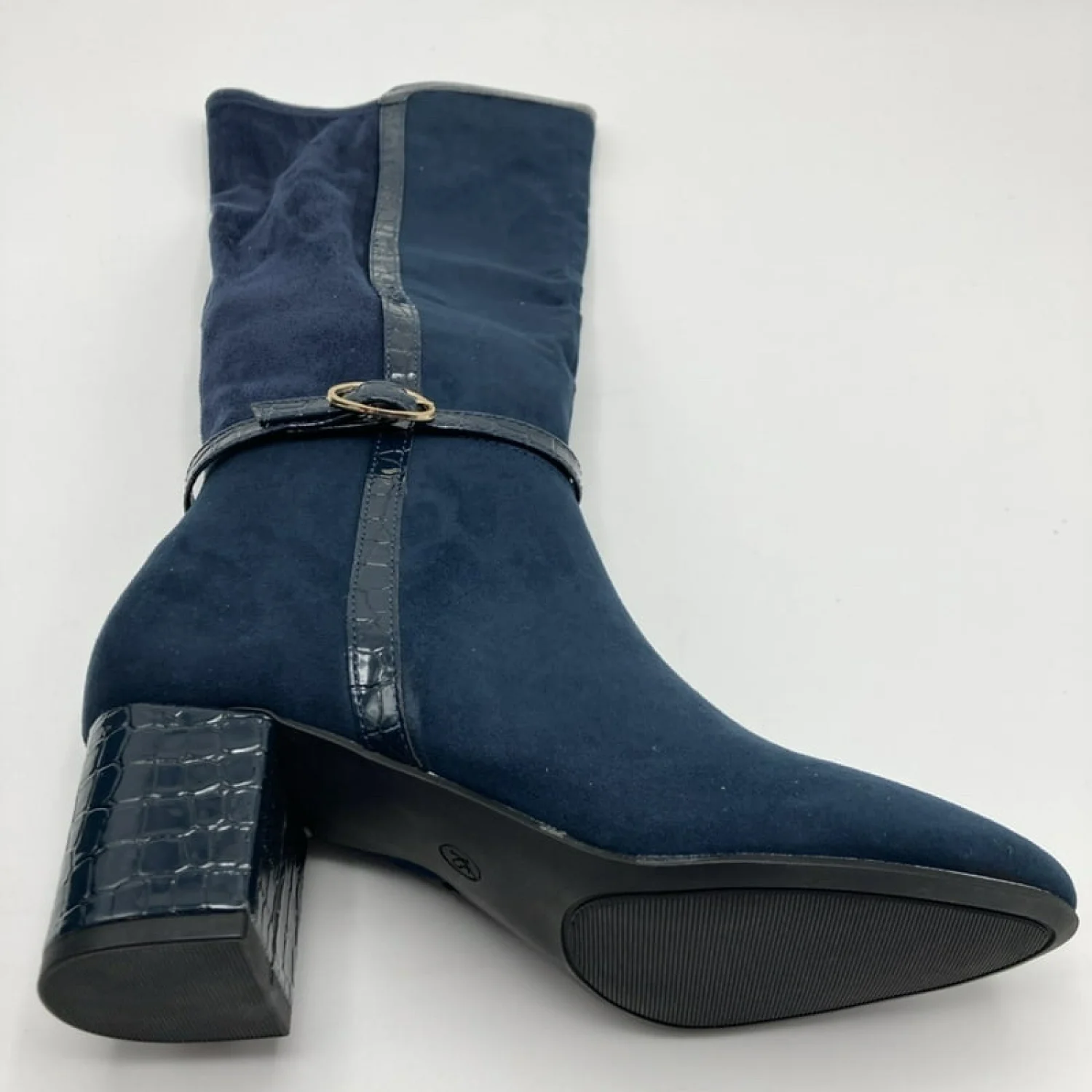 Stylish Design: These Karen Scott Women's Micro Isalee Buckled Zip Dress Boots feature a modern design with a round toe and a mid-height block heel, offering a trendy and versatile look. Knee-High Shaft: The boots are designed with a knee-high shaft, providing extended coverage and a sophisticated silhouette suitable for various occasions. Navy Hue: Presented in a navy blue color, these boots offer a standout addition to any wardrobe Durable Construction: Crafted with a manmade upper material and a comfortable fabric lining, these boots ensure both durability and quality for lasting wear. Seasonal Versatility: Ideal for fall, winter, and spring Buckled Zip: The boots incorporate a buckled zip feature Size: 12 Width: Medium 2" block heel Shaft height: 15-1/4"; Circumference: 13-3/4" Round toe Functional inside zip Buckled ankle strap Manmade upper jersey fabric lining manmade sole MSRP: 95