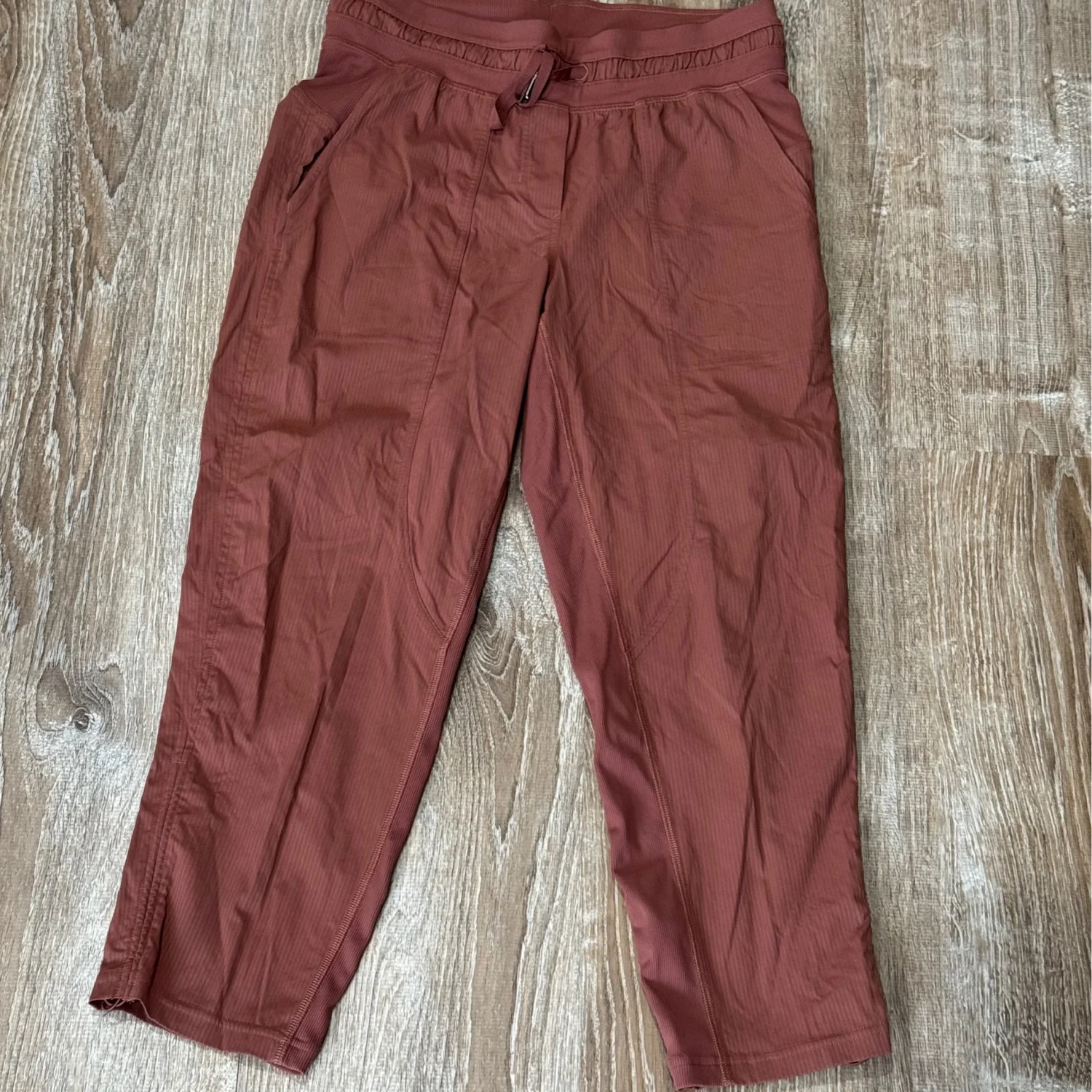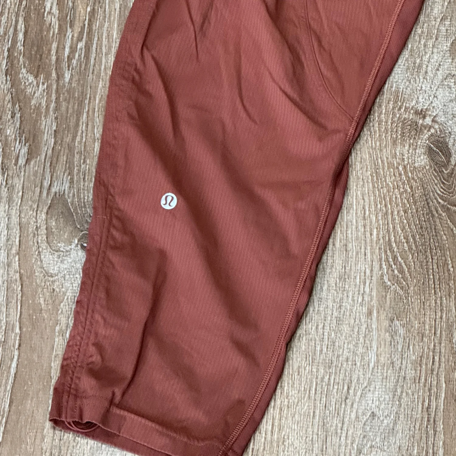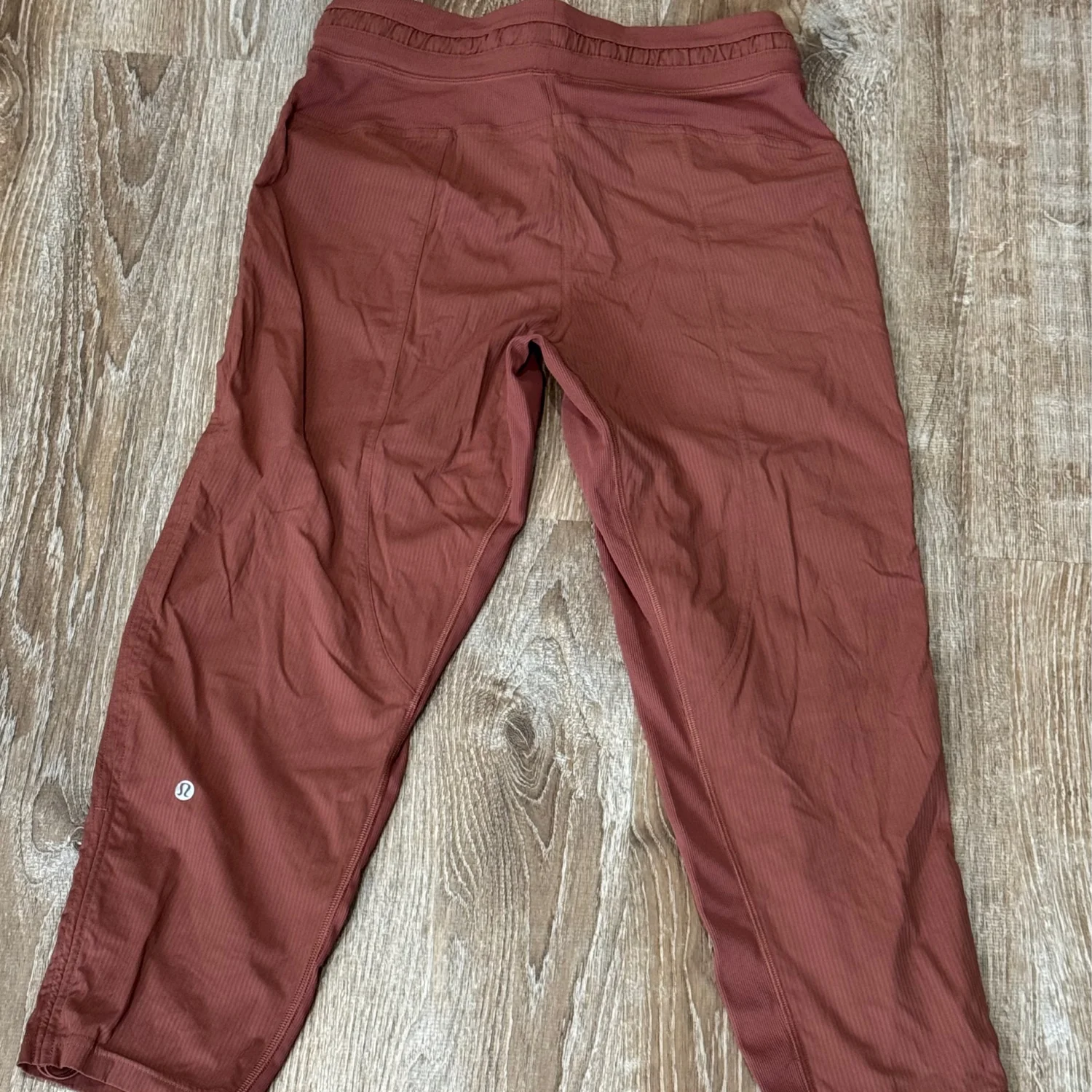 Used great condition Lululemon Dance studio crop pants. We designed these comfy crops to easily layer as you head to and from the studio Woven for strength and no-bulk performance, lightweight Swift fabric is two-way stretch and sweat-wicking to move with you and stay out of your way Size: 6 Material body: 94% nylon 6% Elastane Waistband: 88% Nylon 12% Elastane two-way stretch lightweight woven for strength Color: Red dust Designed for: On the Move Drawcord: Customize the fit with the drawcord in the waistband Media pocket: Lets you keep your tunes on hand Mobility: Gusset is placed to allow increased mobility Adjustable cuff: Adjustable cuffs let you lock in heat Rise: Mid rise Wash with like colors Made in Vietnam MSRP: $90