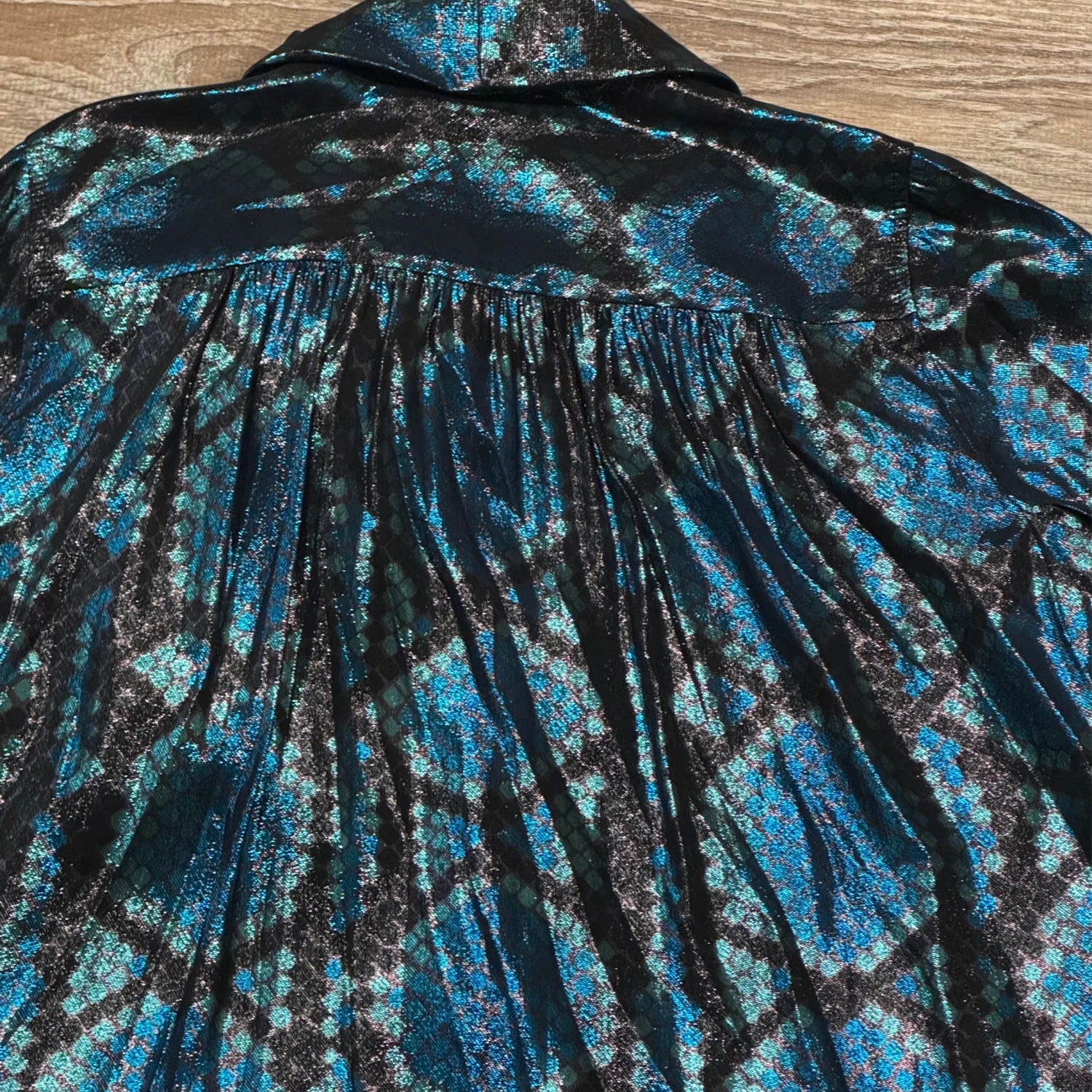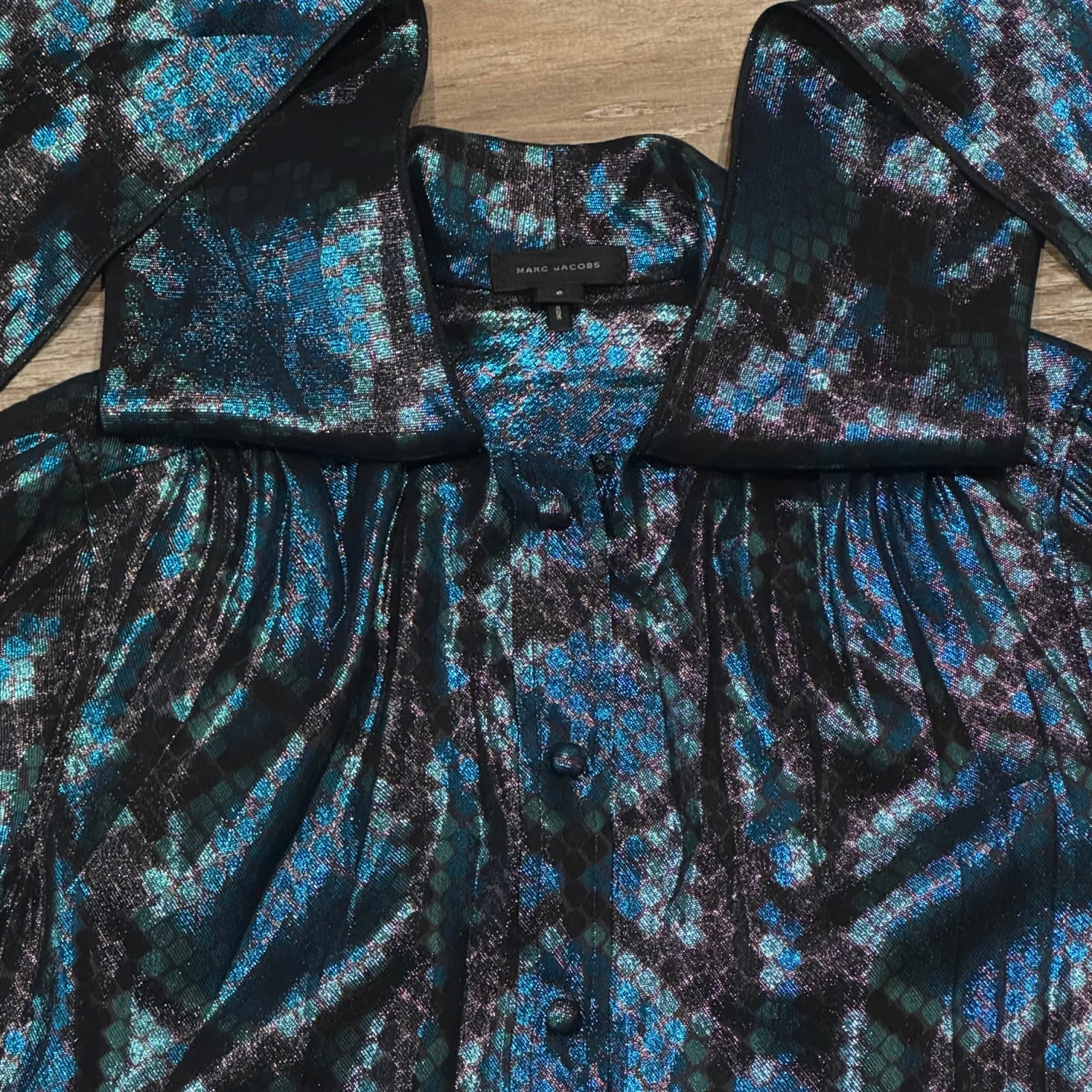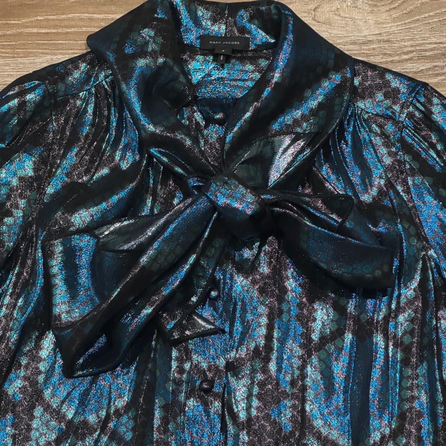 Great condition like new Marc Jacobs blouse. This elegant women's top features a striking blue and black pattern, perfect for any occasion. The stylish design adds a touch of sophistication to your wardrobe. Marc Jacobs has been at the top of the fashion stratosphere almost from the time the first look came down the runway in 1986. He's been credited with stylizing the so-called grunge aesthetic and has also turned out flawlessly ladylike suits and dresses. His design range is as impressive as his ability to influence trends Size: 6 Bow tie front Underarm pit to pit flat approx: 20” Length: 26” Material: 65% Silk 35% Polyester Dry clean only Made in Usa MSRP: $395