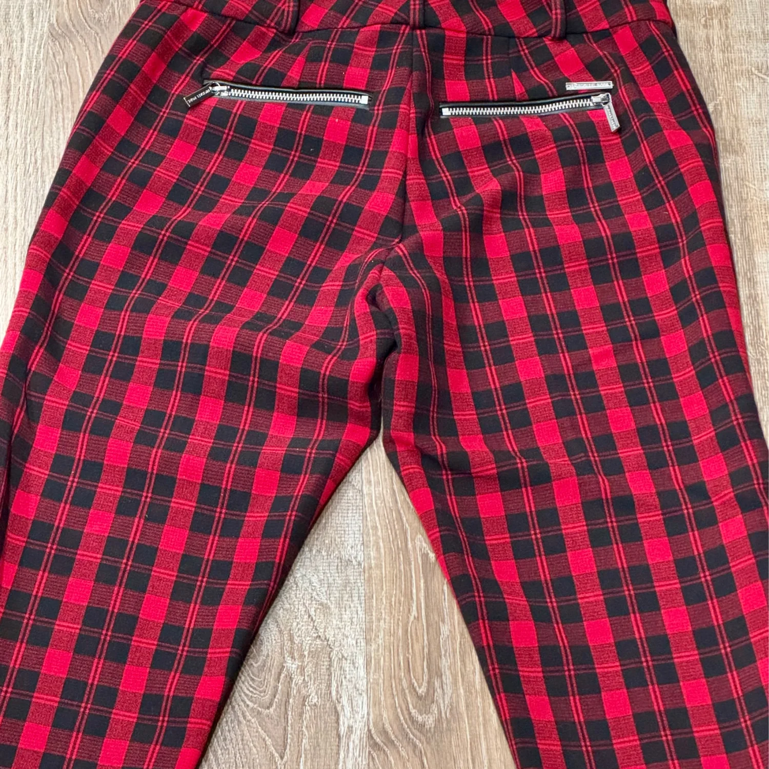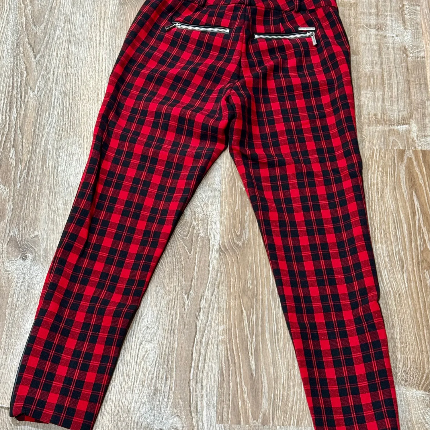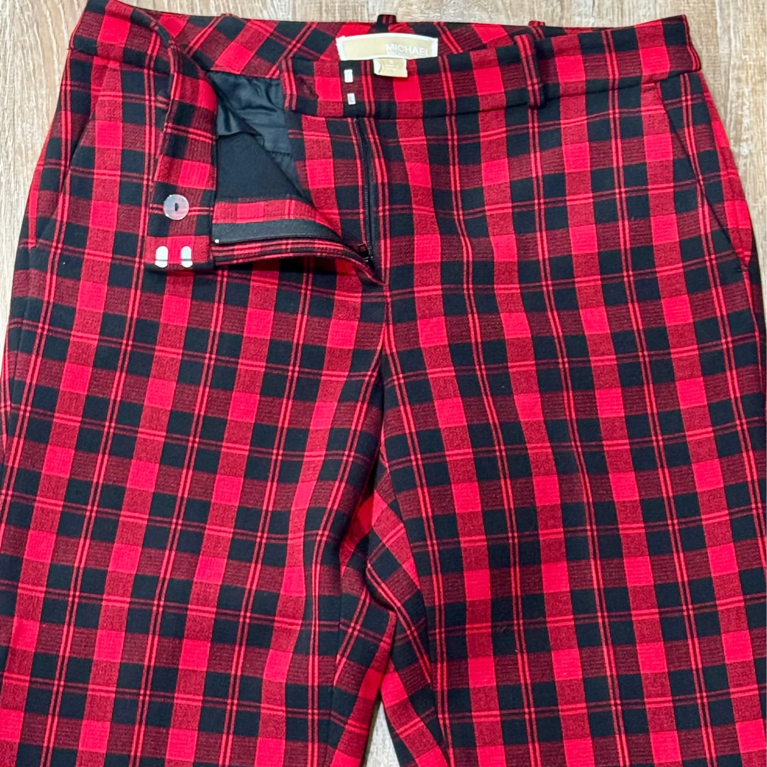 Used great condition Michael Kors Stylish plaid bottoms in vibrant red and black. Perfect for any occasion. •Size: 8 Medium •Material: 66% Polyester 30% Rayon 4% Spandex •waist flat: 15” •Length: approx 37” •Rise: 8” •Inseam: 29” •Style: Skinny Leg •Color: Red & Black •Pattern: Plaid •Hand wash cold with like colors •Made in China •Zipper Accents