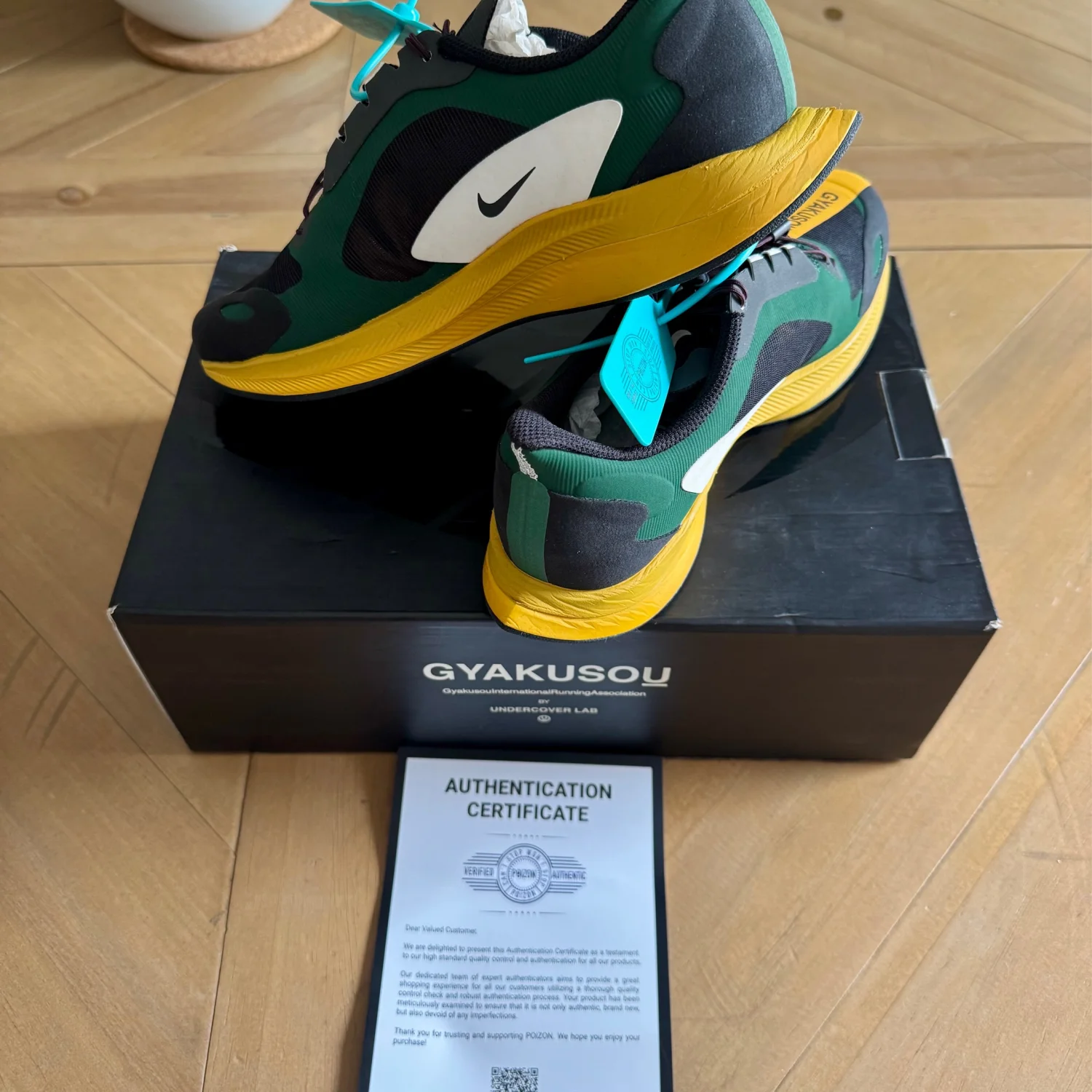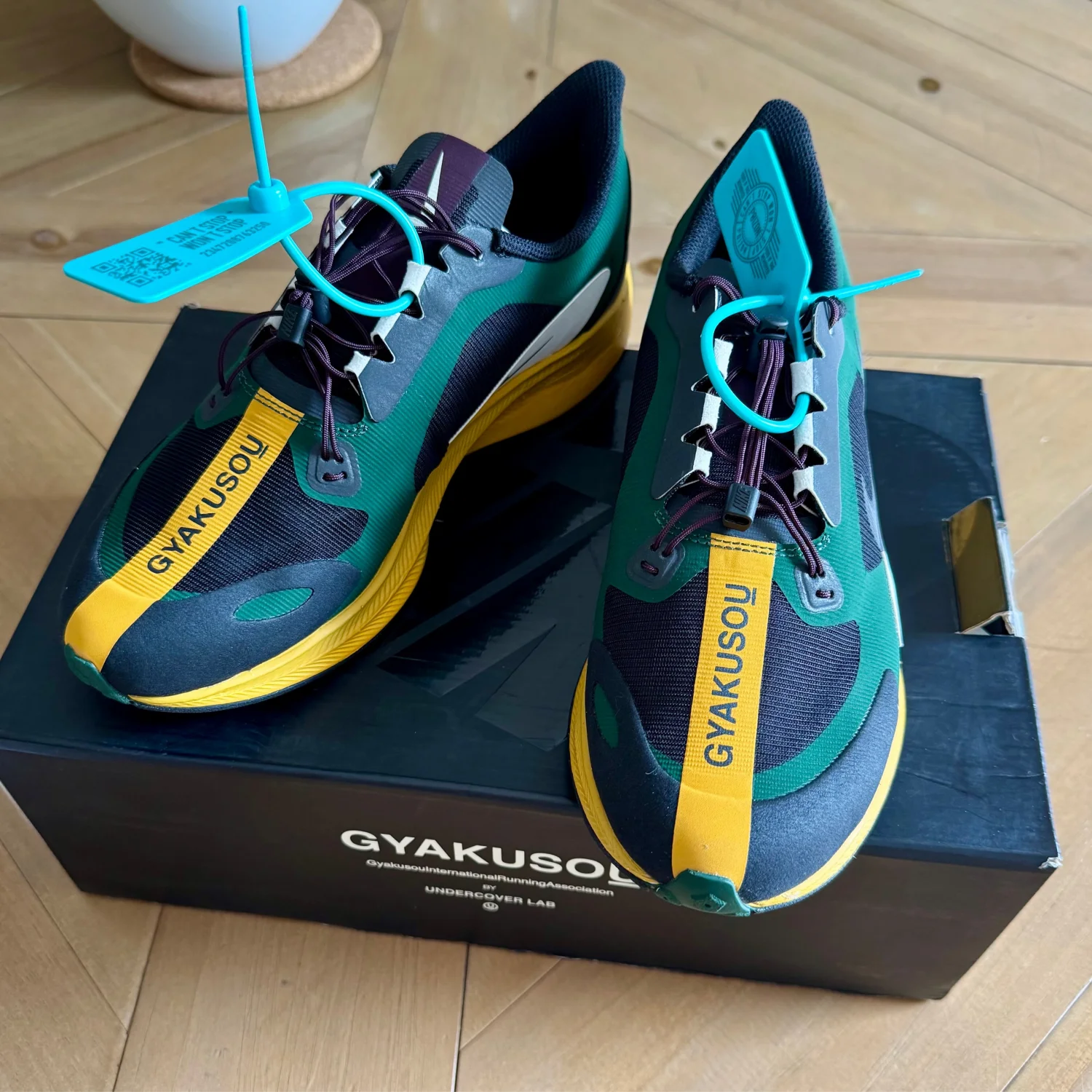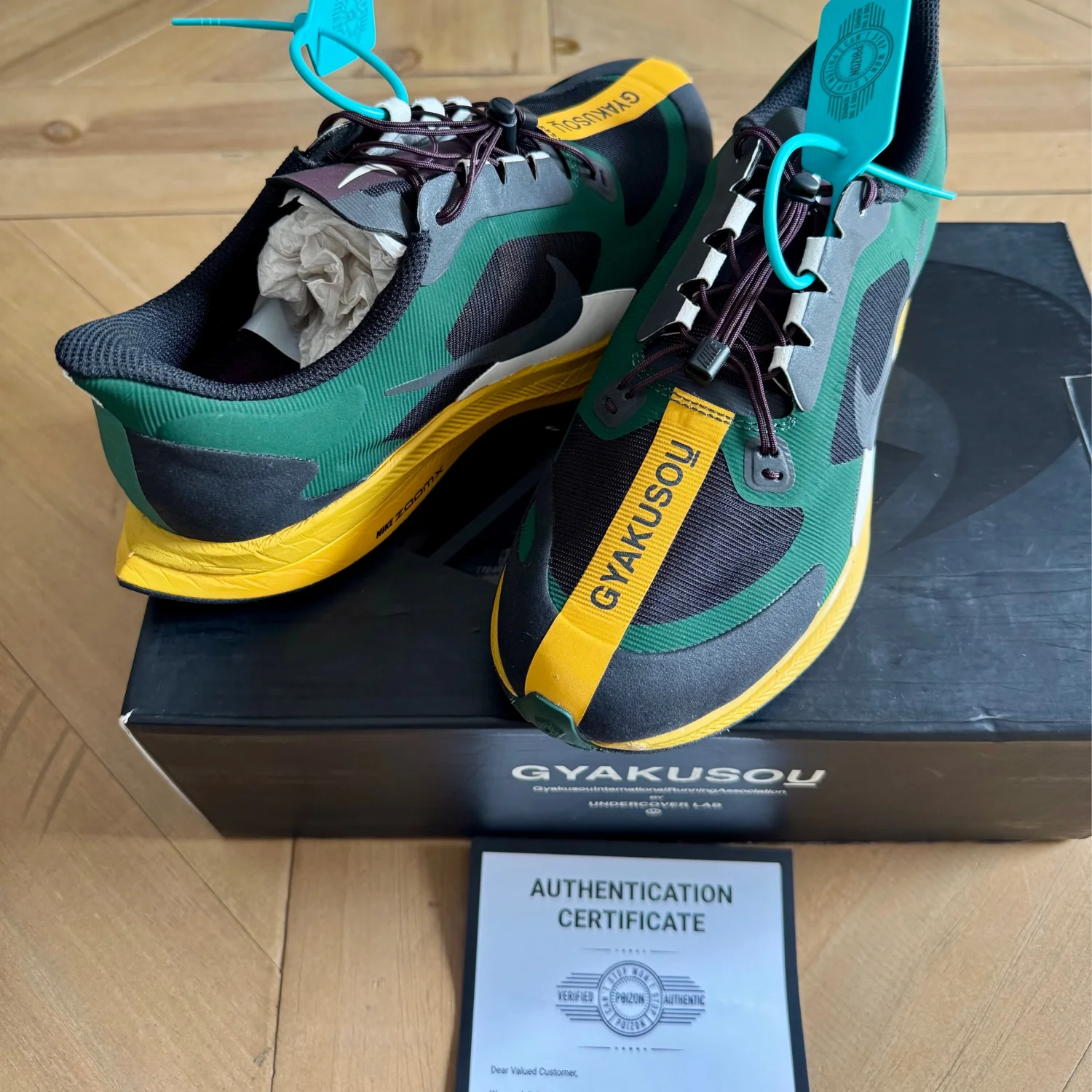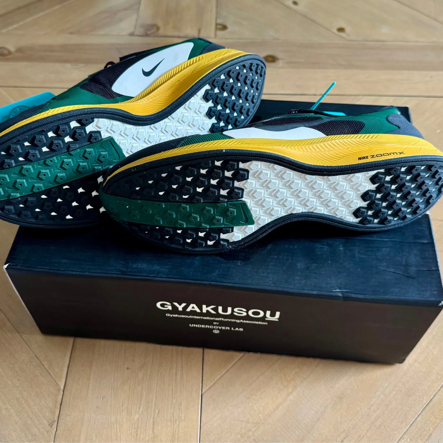 The Gyakusou x Zoom Pegasus Turbo 'Fir Black' re-imagines the precision lines and lightweight design of the Zoom Pegasus Turbo for spring 2019. Designed by Undercover's Jun Takahashi, the running shoe features a Black upper with Fir Green panels and a Gold Dart midsole and outsole. Released on February 28th, 2019, the shoe maintains the distinct beveled heel design, streamlined engineered upper, and ZoomX foam cushioning. Size us 6 , uk 5.5 , euro 38.5 , Department: For Men Type: Athletic Brand: Nike Style: Sneakers Style Code: BQ0579-300 SOLE MATERIAL Rubber Sole Made in China Retail Price: $400