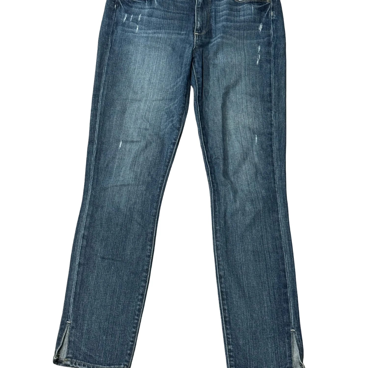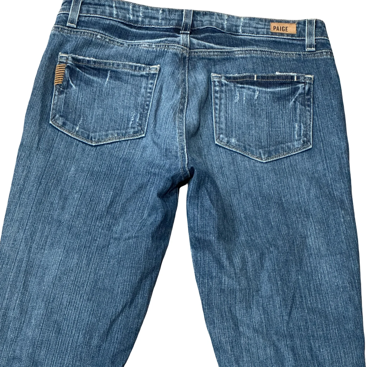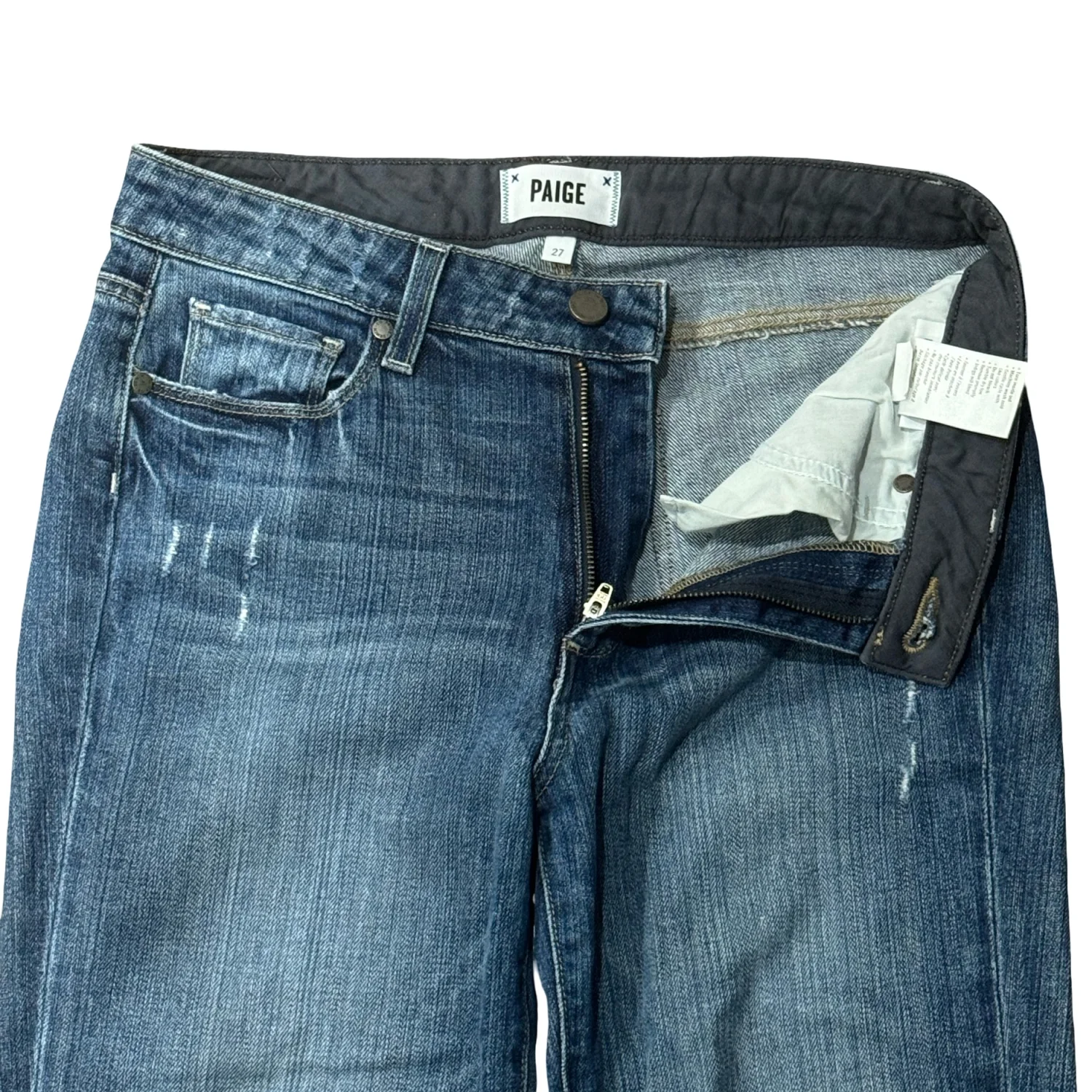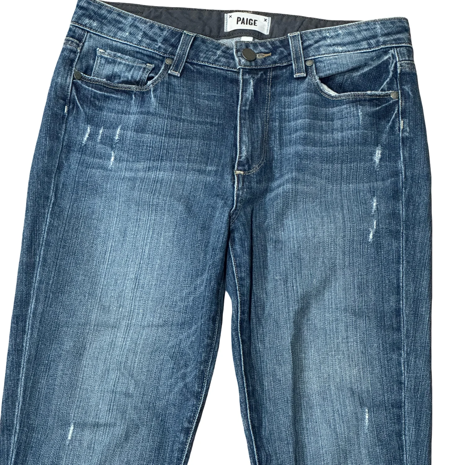 PAIGE skinny ankle jeans in a classic medium blue wash. Designed for comfortable all-day wear with subtle distressed details. Versatile style that pairs easily with casual or dressy tops. Includes front and back pockets for everyday convenience. • Size: 27” • Material: 98% cotton 2% Elastane • Length: 38” • Leg opening flat: 6” • Rise: 9” • Inseam: 29” • Pull-on styling • Hoxton Ankle Peg • Machine wash cold with like colors • Made in Usa