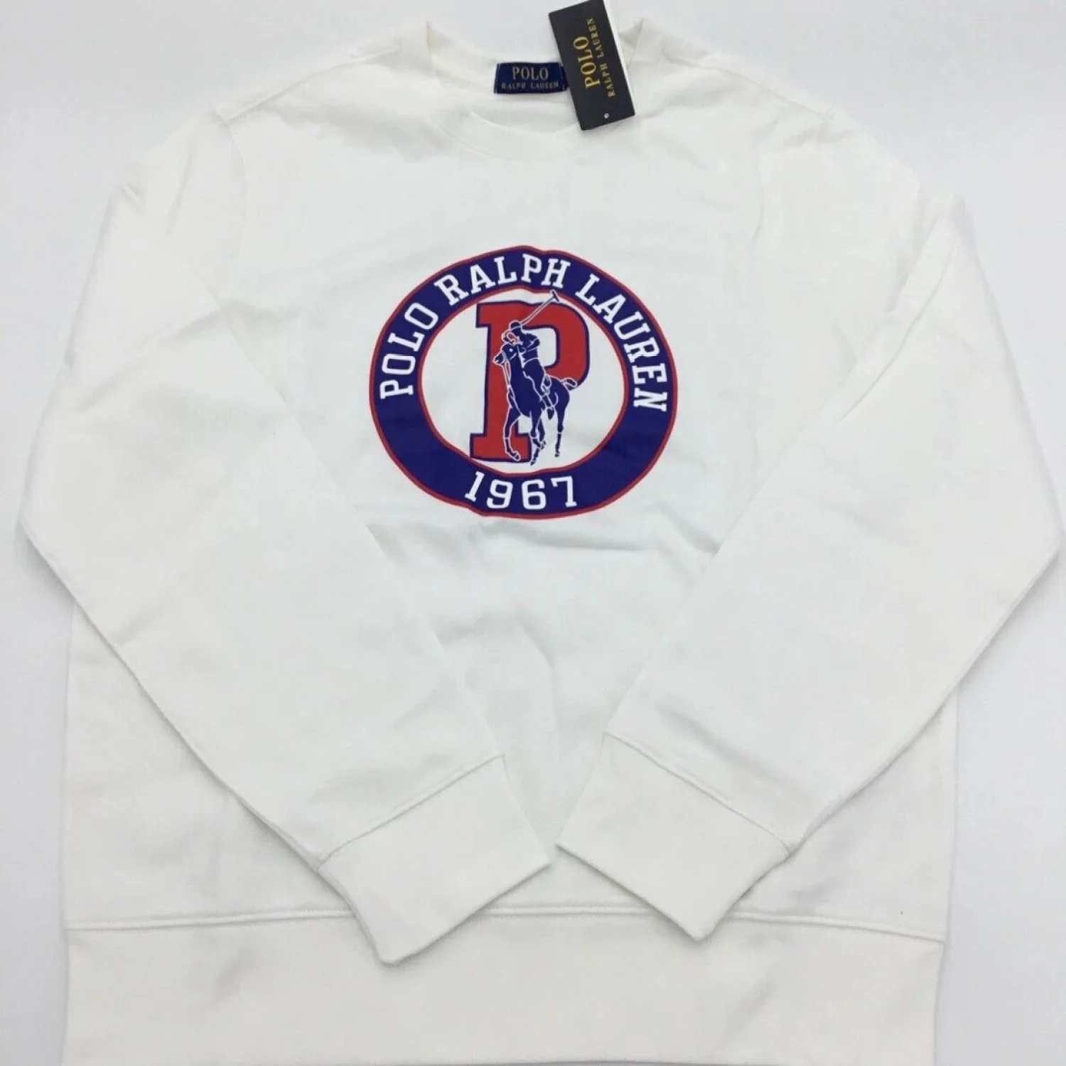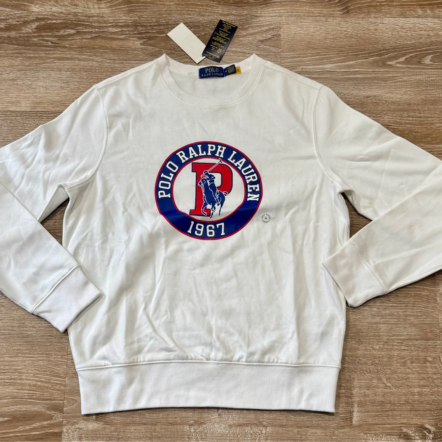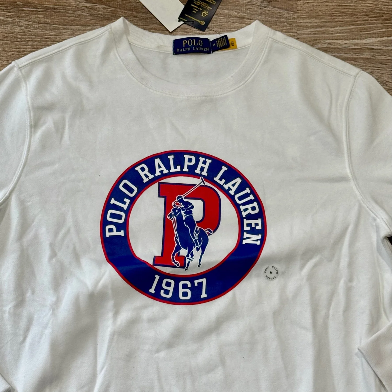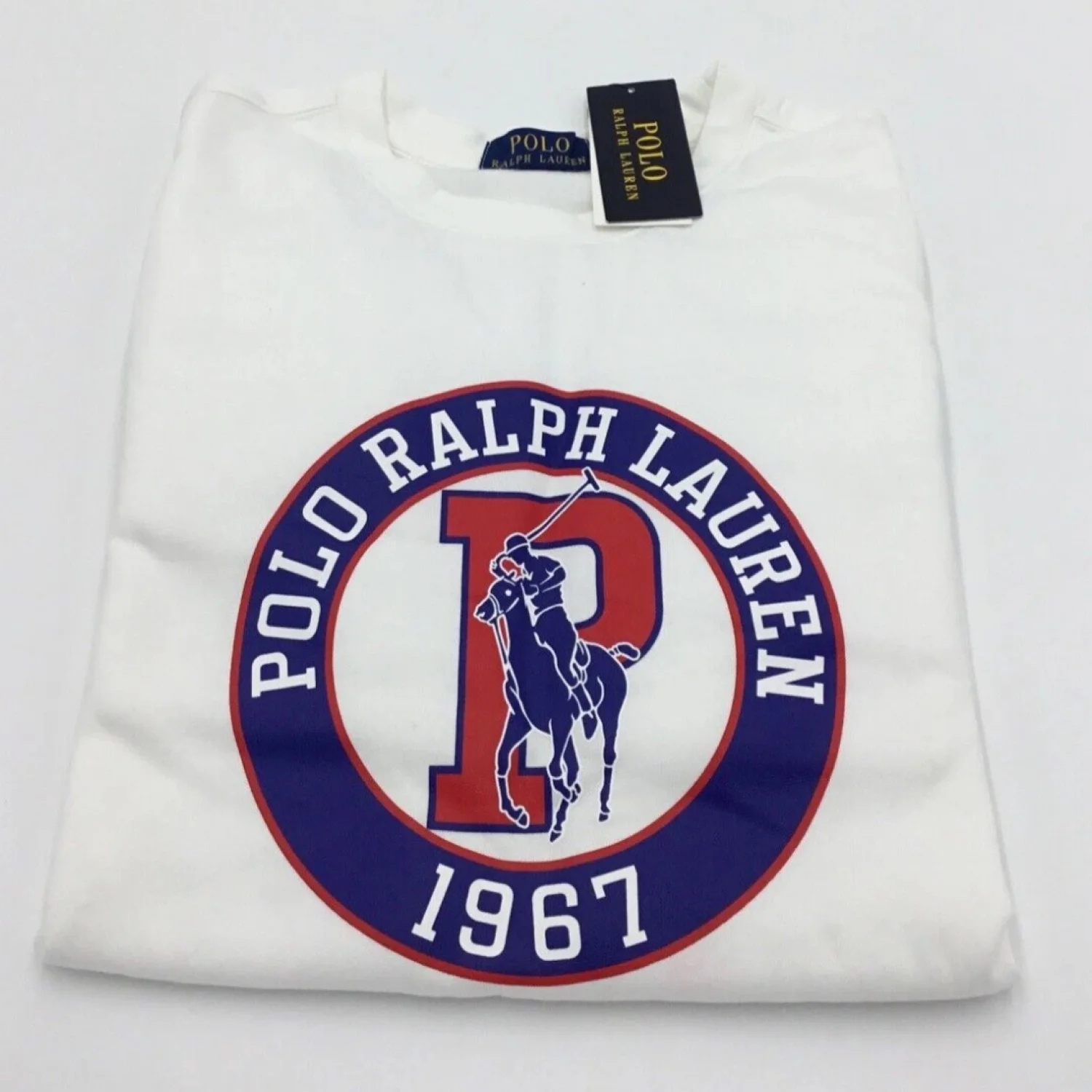 White Polo Ralph Lauren T-shirt with bold graphic design 1967. Features red and blue accents. Size: Medium Material: 67% Cotton 33% Polyester Machine wash cold , turn inside out Made in Guatemala MSRP: $138
