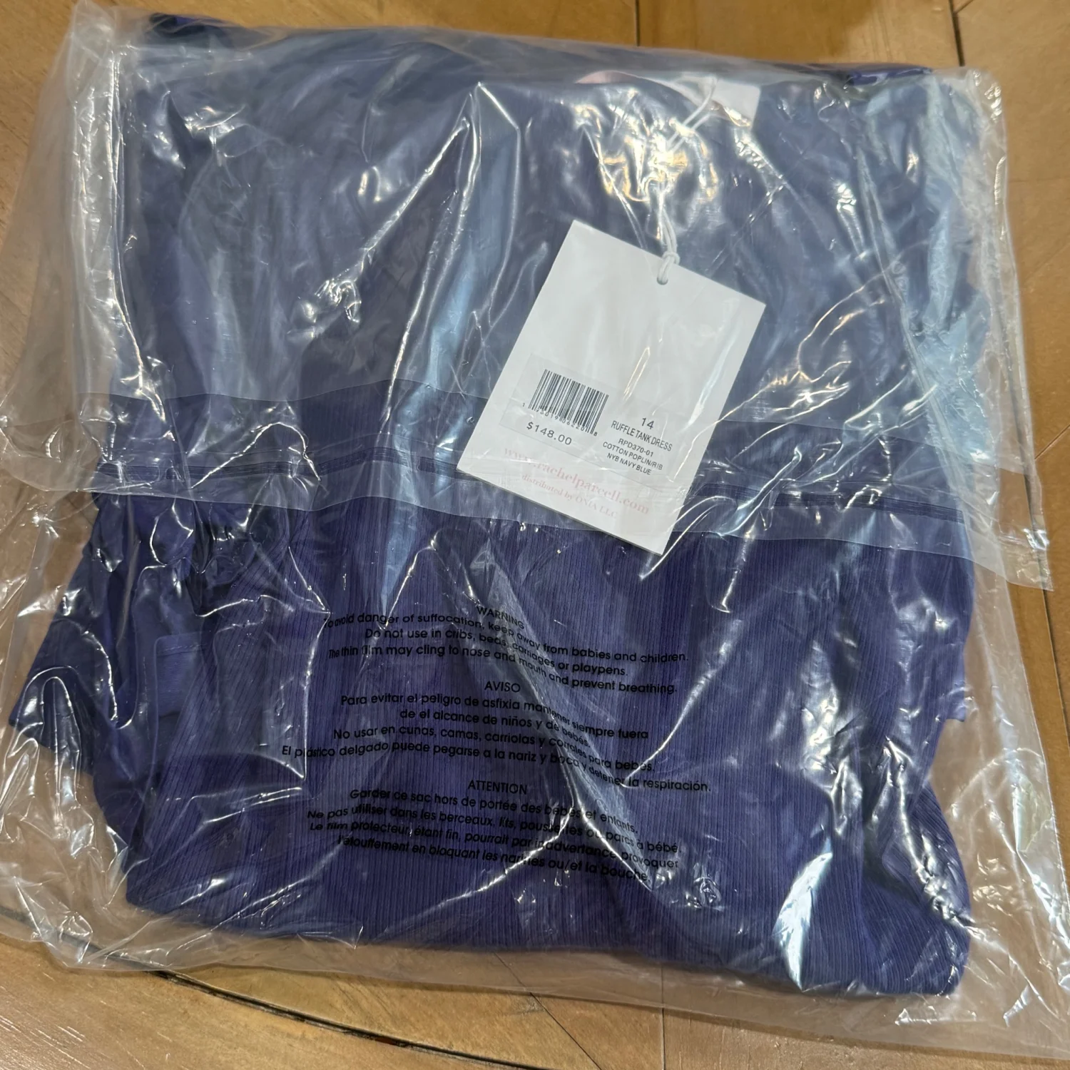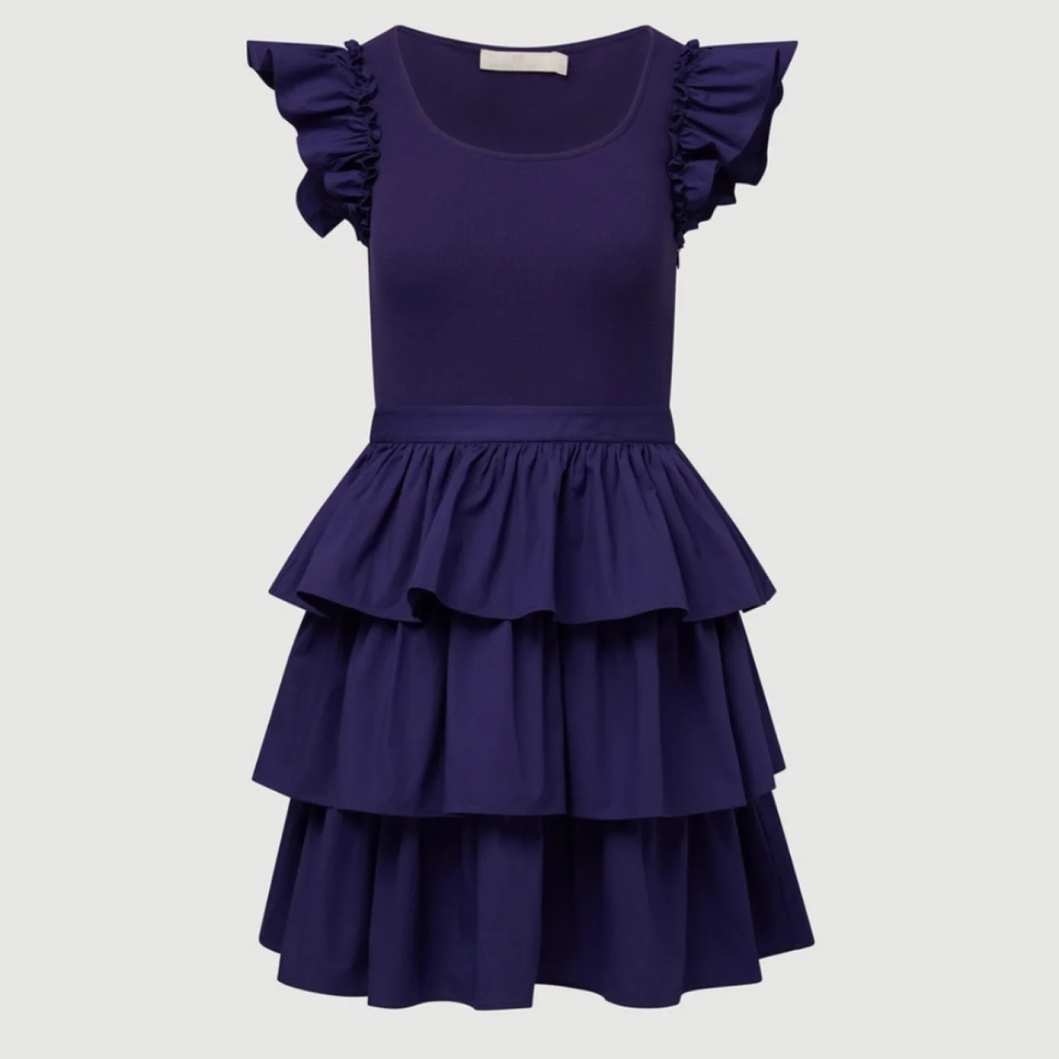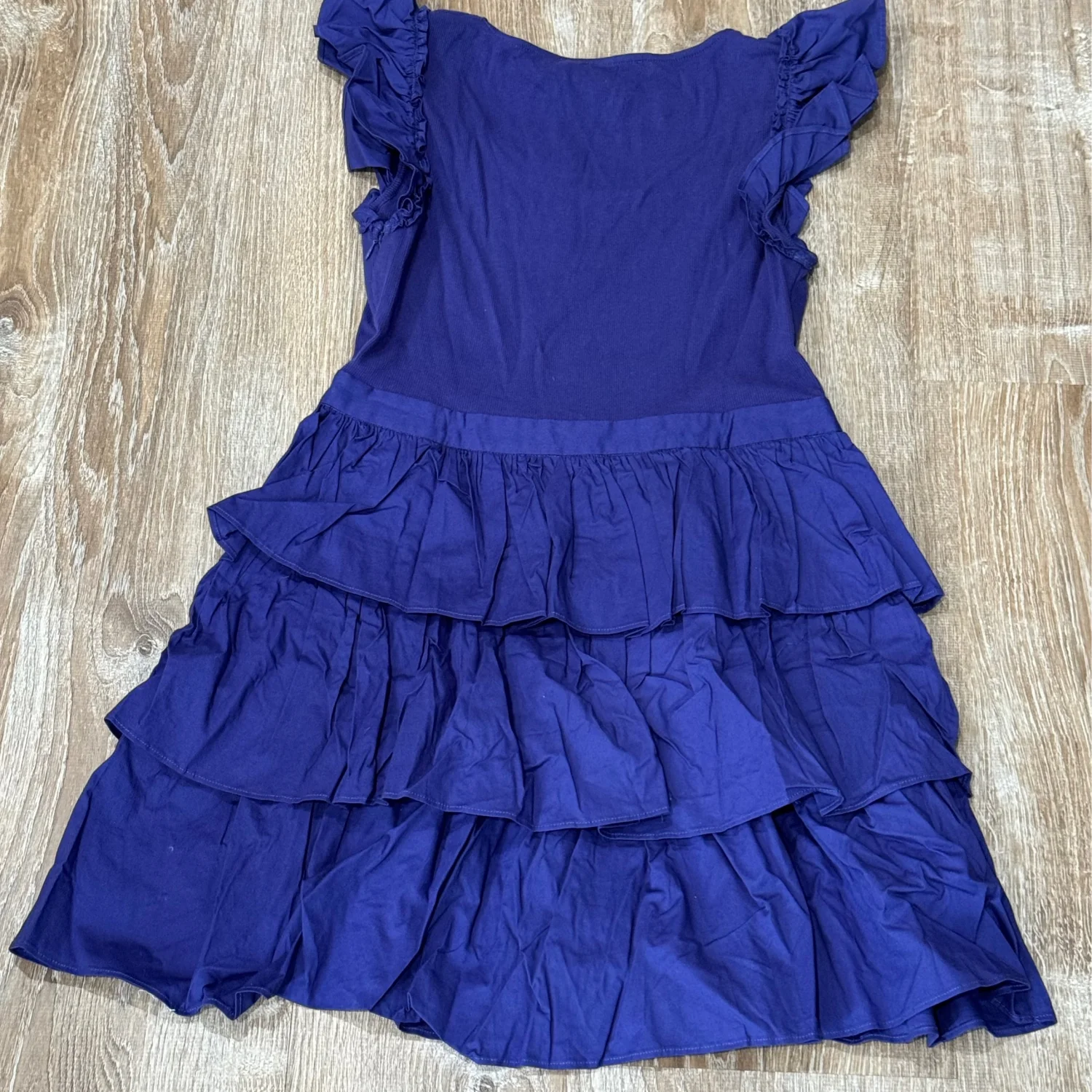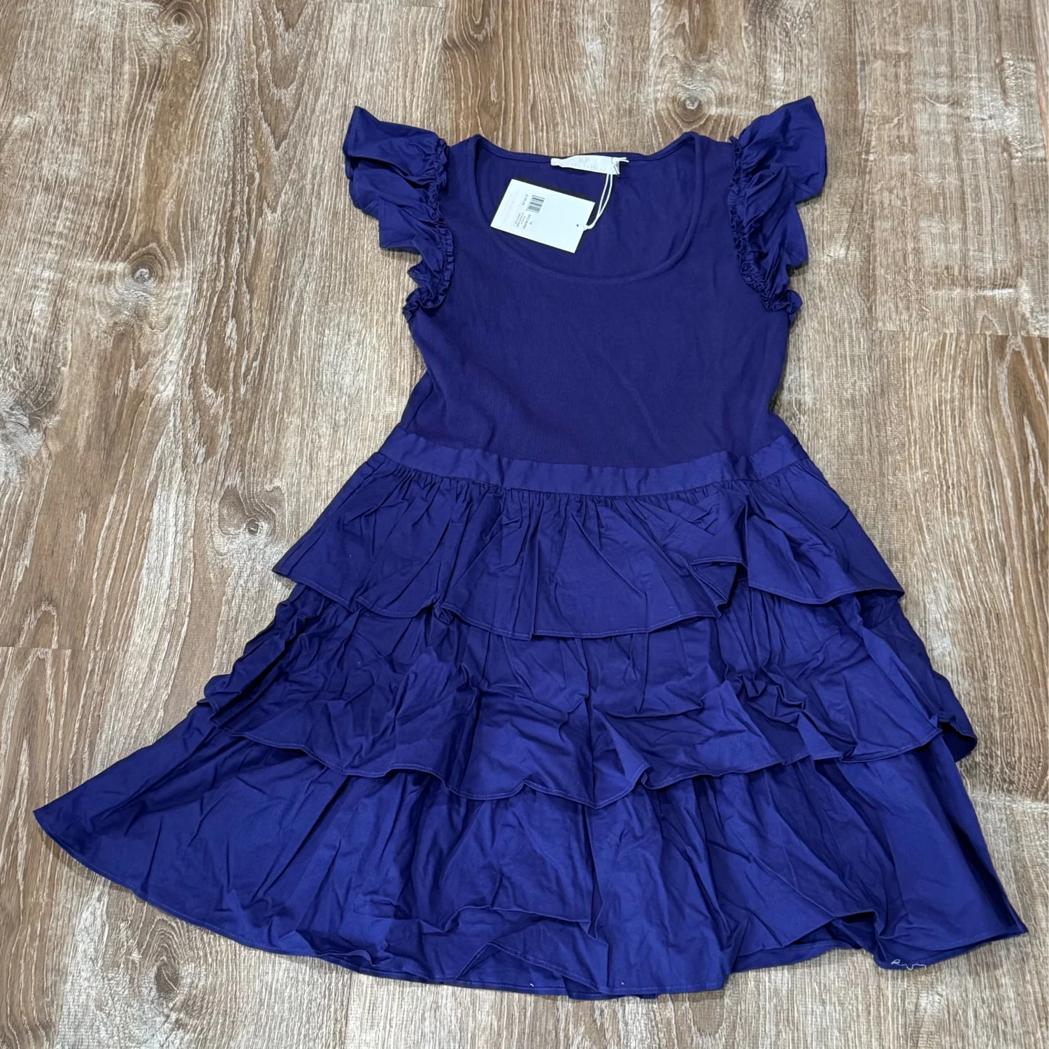 Step out in style with this elegant navy blue ruffle dress. Perfect for any occasion, this dress features a flattering silhouette and eye-catching ruffle details. A must-have addition to your wardrobe. This ruffly tank dress marries a ribbed bodice featuring cap sleeves with a banded waist and mini skirt, cut from tiers of cotton poplin. Size: 14 Ruffle sleeve Ribbed fabric at bodice Cotton poplin at skirt Multi tiers Mini length Material: 97% Cotton 3% Spandex Machine wash in gentle cycle with like colors. Do not bleach. Tumble dry low. Iron cool. Made in China MSRP: $148