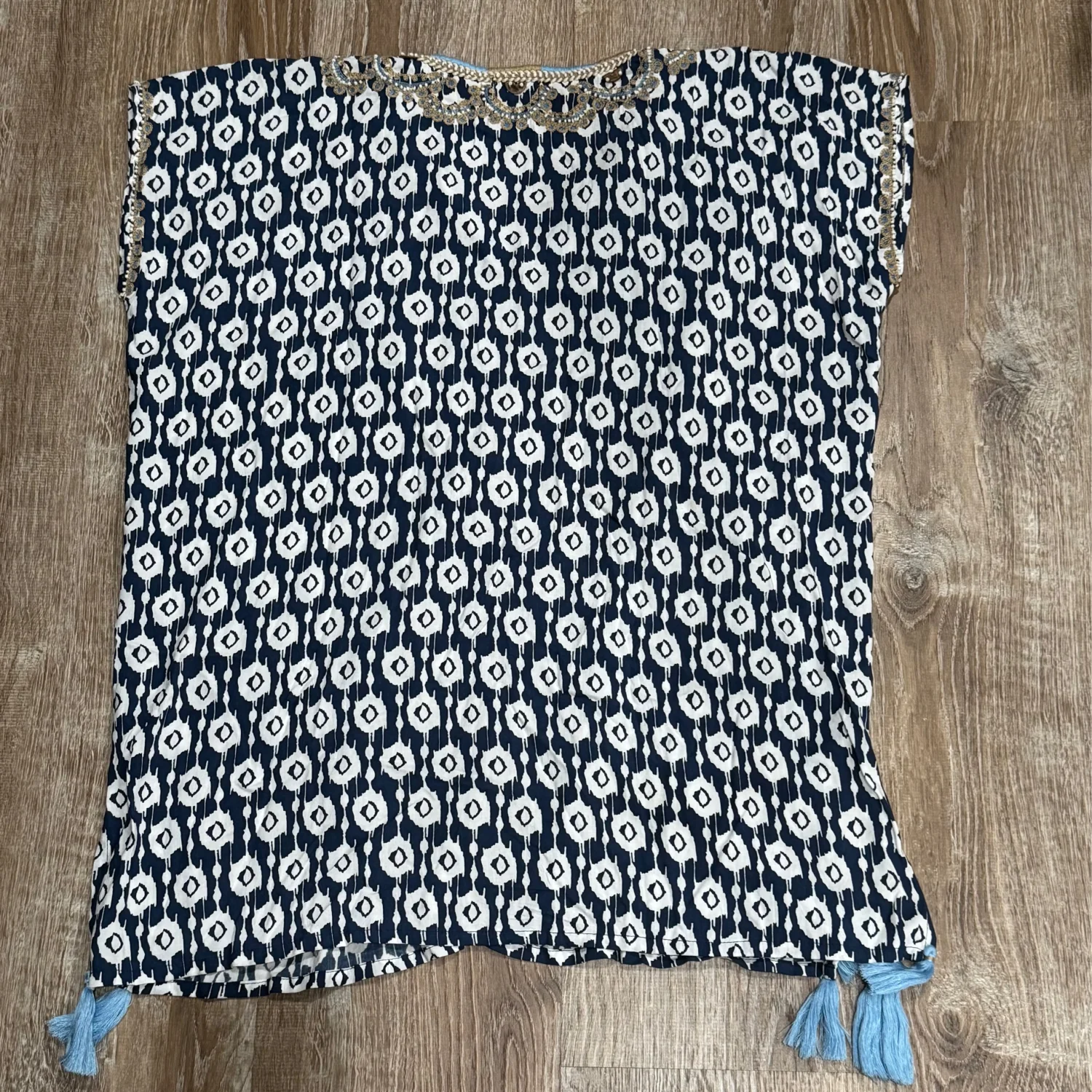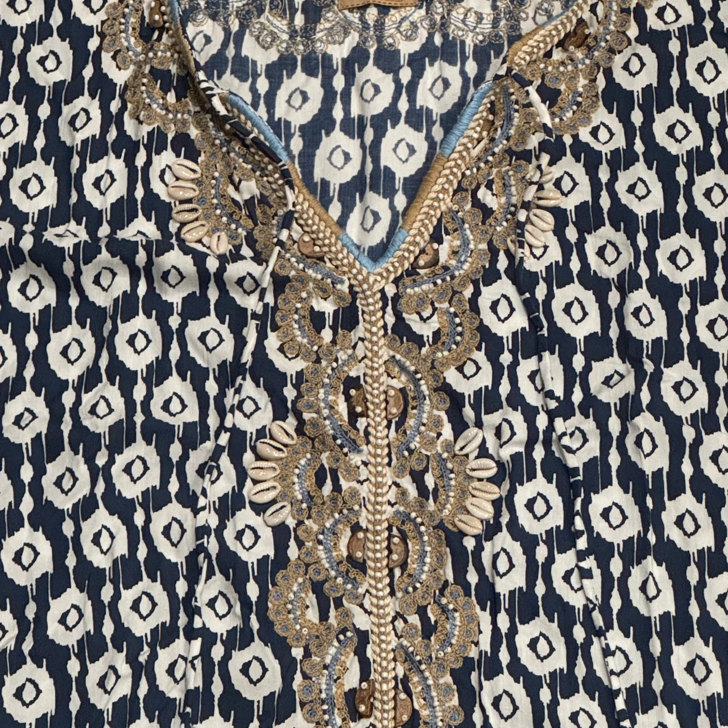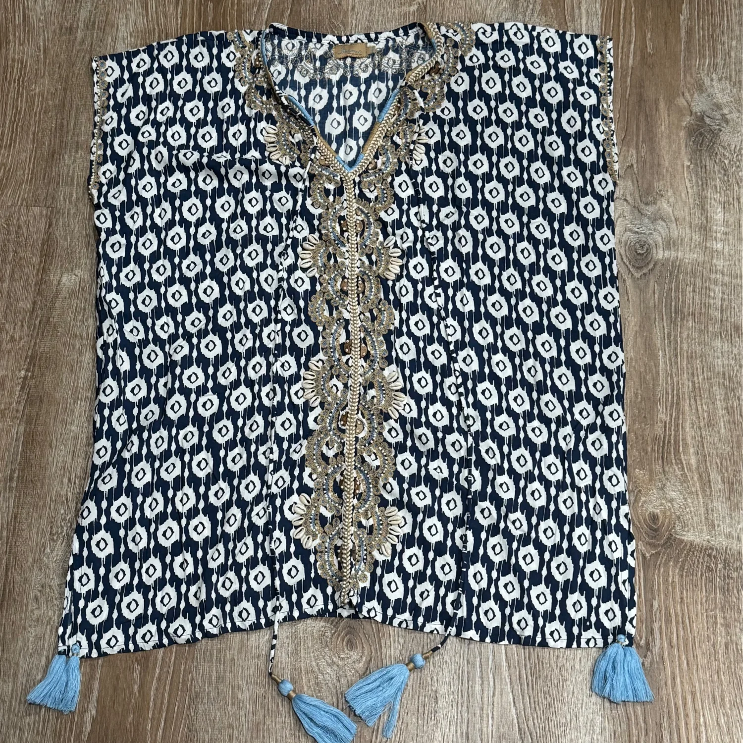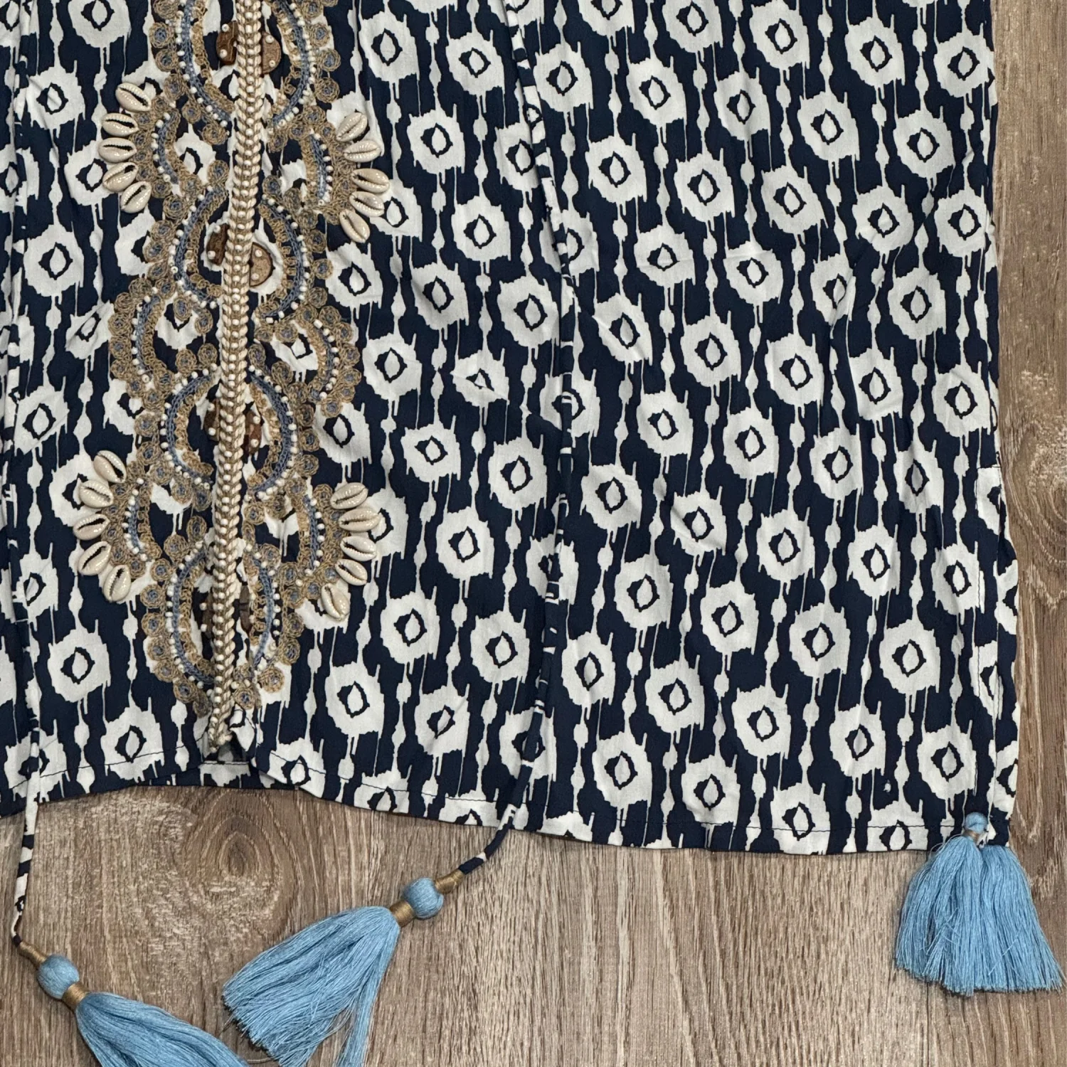 Used great condition like new Stylish blue and white patterned top featuring decorative tassels. Perfect for casual wear. Skemo shell bead shirt Womens tassle embroidery sleeveless blouse drawstring. This is the coolest shirt on the rack. Heavily discounted. Size: Xsmall Relaxed wear Material: 100% Rayon Length: approx 29.5” Underarm pit to pit: approx 25.5” Hand wash in cold water Handmade made in Indonesia
