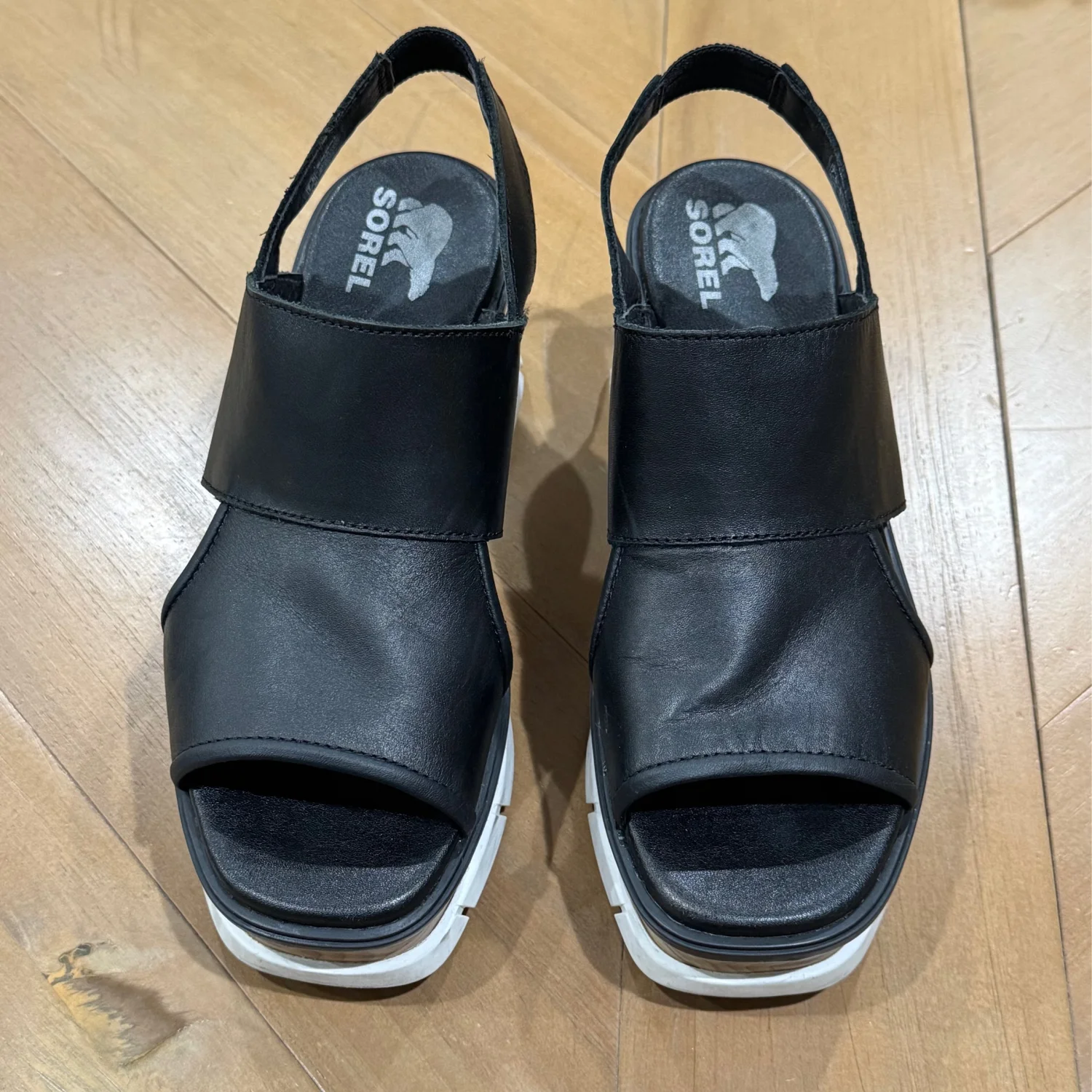 Used good condition Englin's Fine Footwear presents the women's 'Joanie III Slingback Wedge Sandal' from Sorel. Part retro slingback, part wedge, all style. SOREL’s latest Joanie features a faux wood or EVA platform that brings walkable height, next-level comfort, and major ‘70s vibes with a modern twist. The slip-on upper is grounded by a lightweight rubber sole for maximum wearability. Upper: A contemporary canvas upper with a graphic seasonal print. Full grain leather strap with gore detail on back heel adjustability and ease of entry. Synthetic lining. Footbed: Soft PU-like EVA footbed for extra comfort underfoot. Synthetic topcover. Metallic SOREL logo. Midsole: Molded BPU-PU wedge wrapped in EVA. 1 1/4 inch off-set. Outsole: Molded high-traction rubber in a new forward motion design with lightweight ground contact EVA. Size: 7.5 Heel Height: 3 in. Platform Height: 1 1/2 in. Made in China MSRP: $130