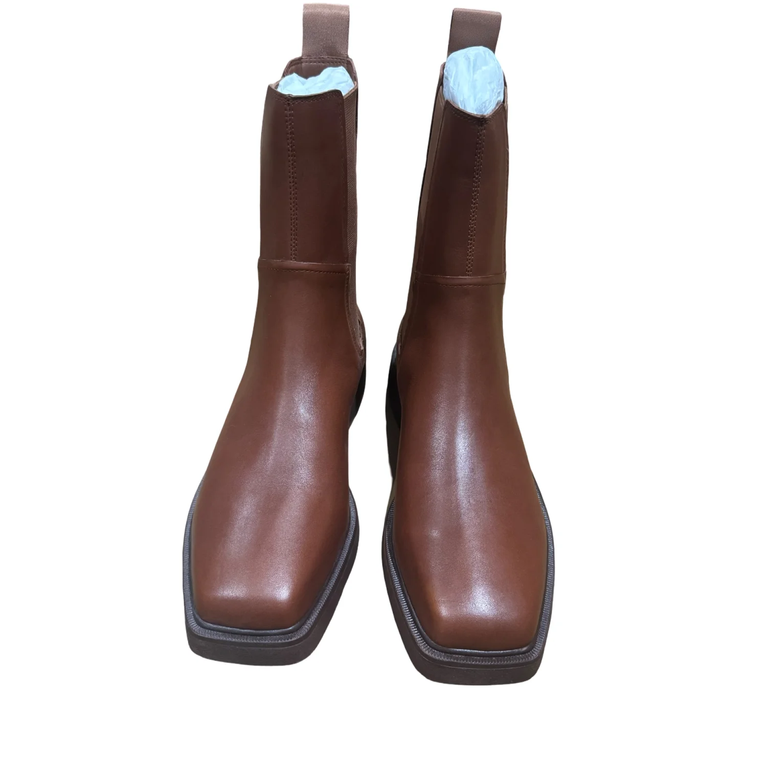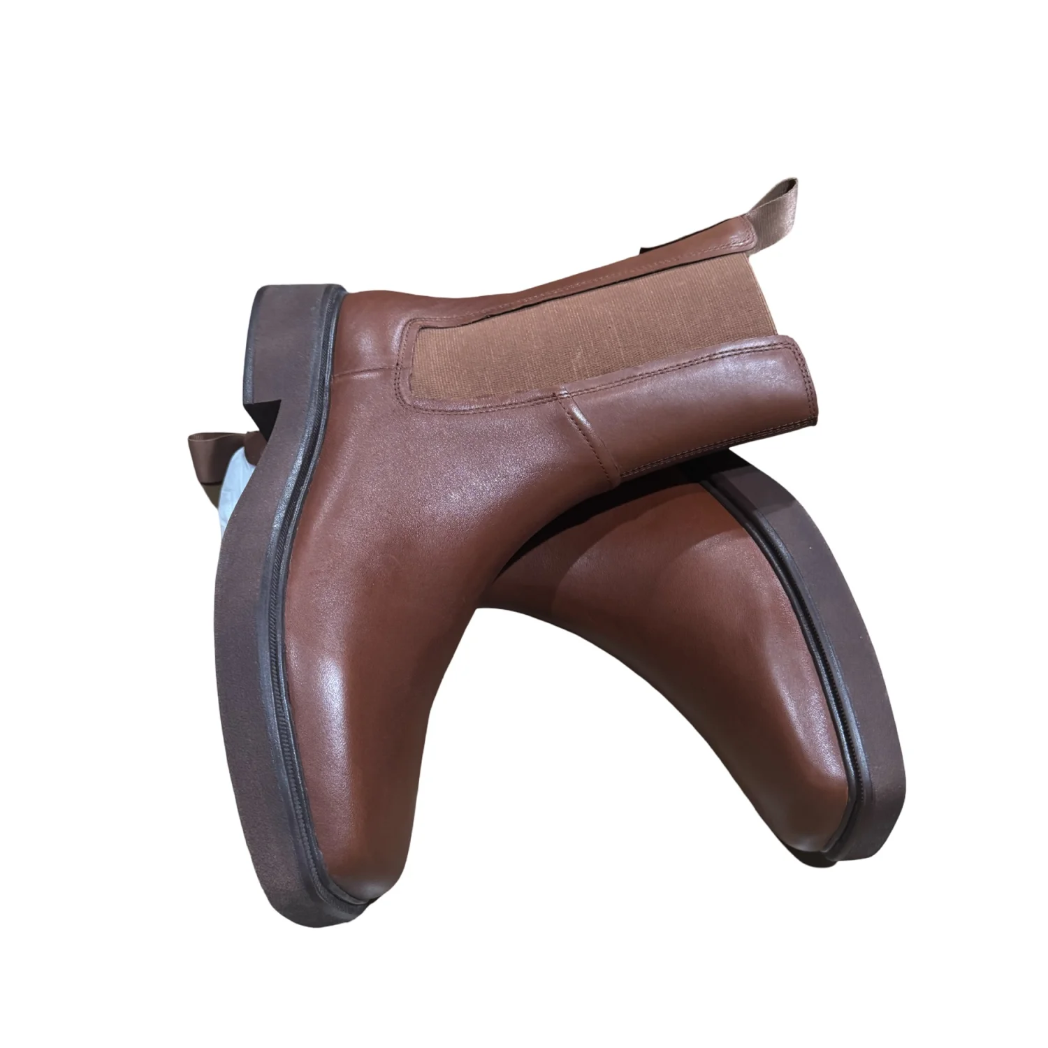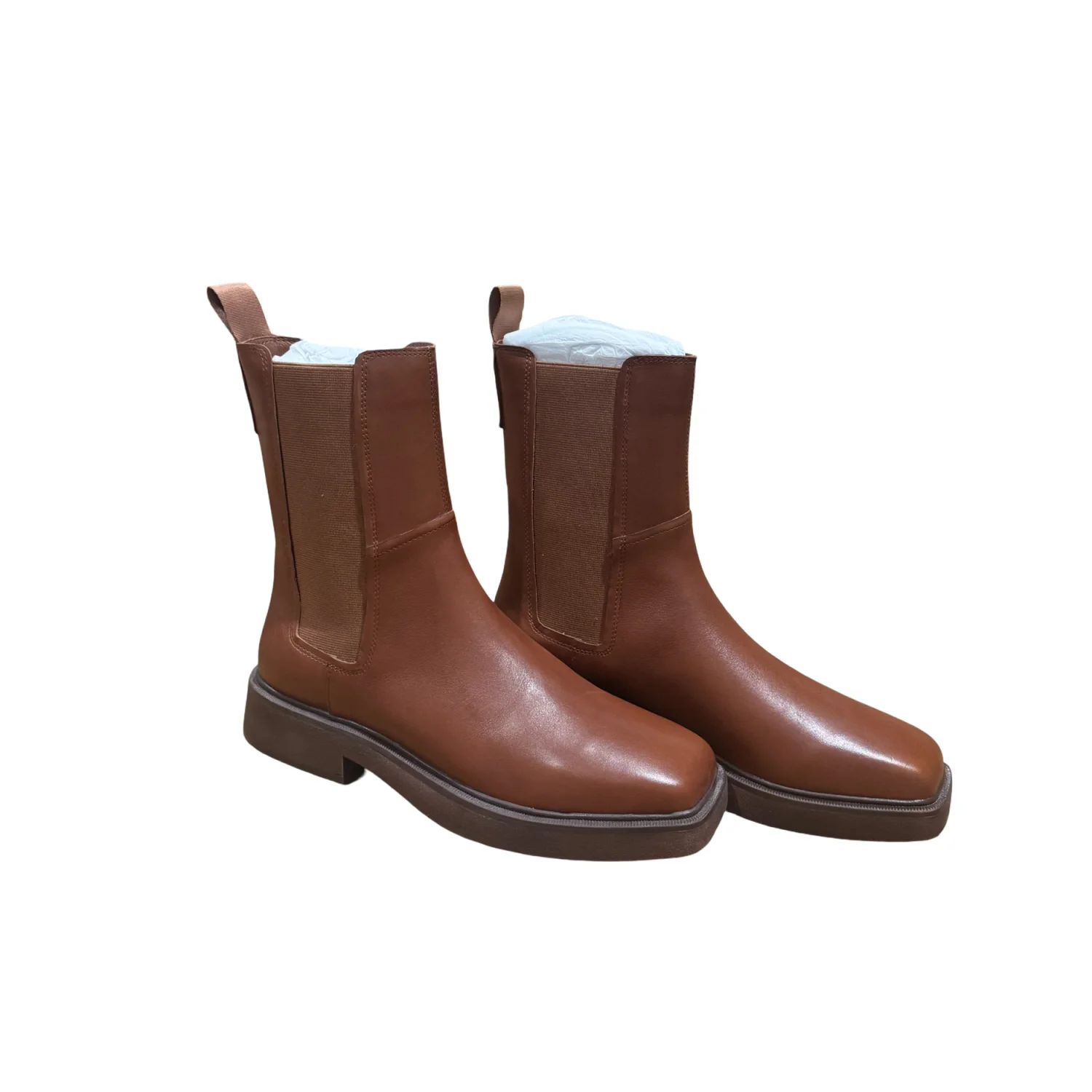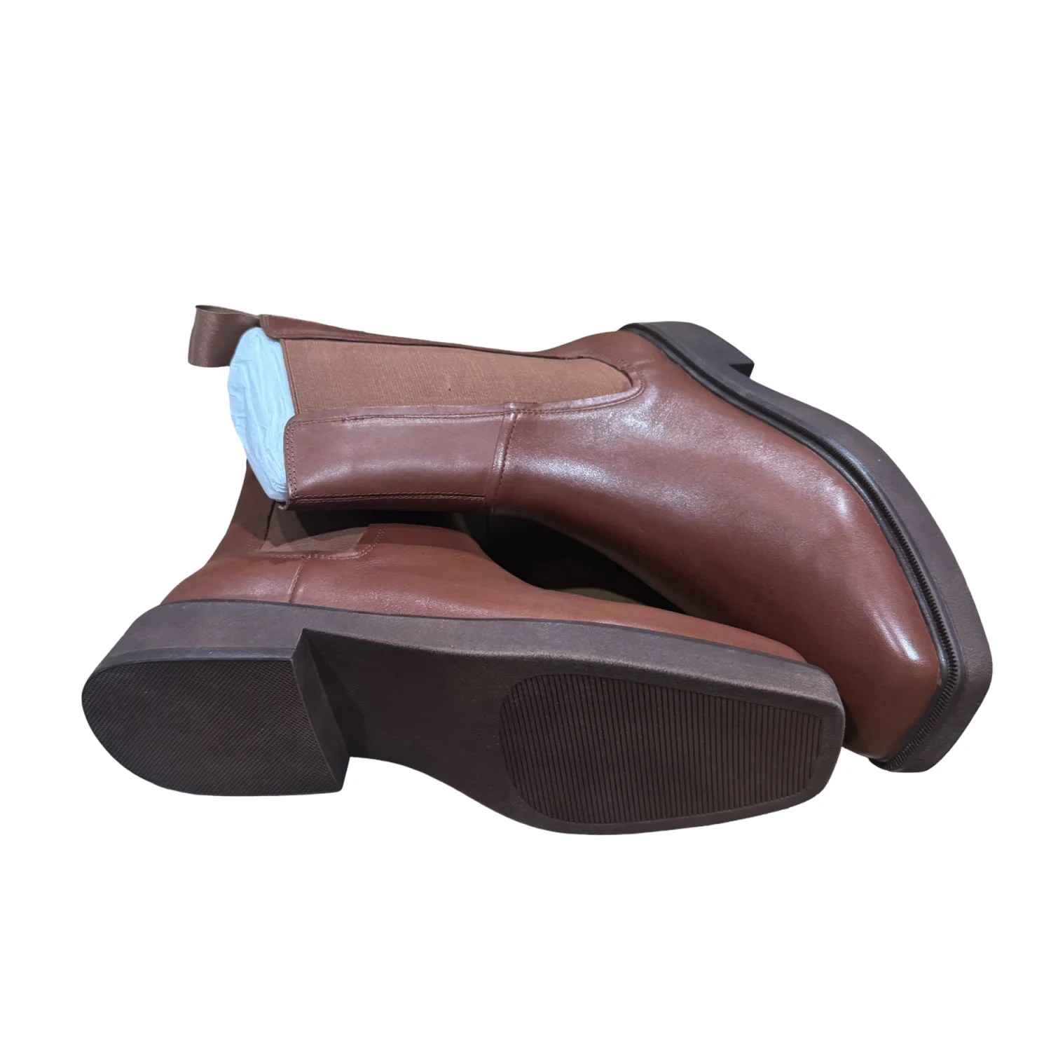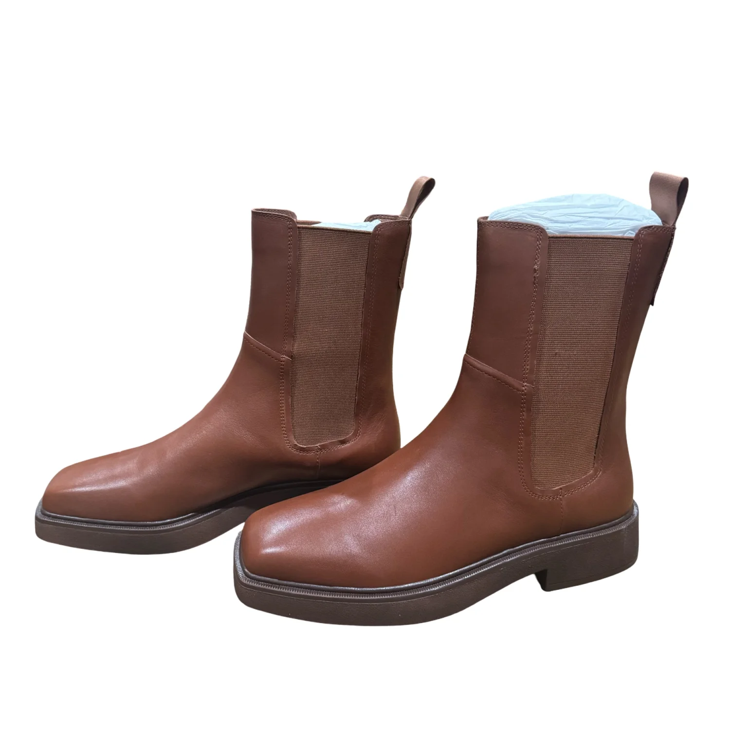 Timeless Cognac Chelsea boots with elastic side panels for easy slip-on wear. Smooth leather upper delivers a polished look and durable construction. Cushioned insole and rubber sole provide comfortable all-day support. Versatile Cognac color pairs well with casual and dress outfits. Size: 10 Upper material: Leather Lining: Fabric Sole: Rubber Insole: Cushioned Outsole: Manmade Ankle Boots Made in China