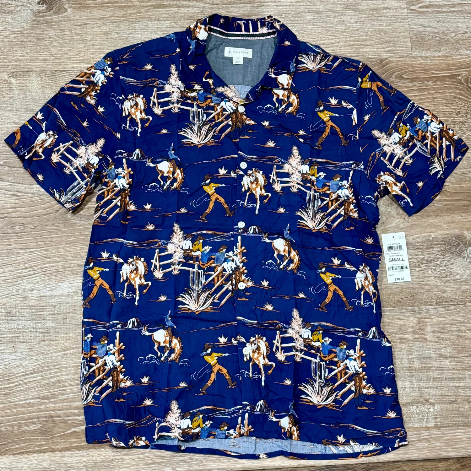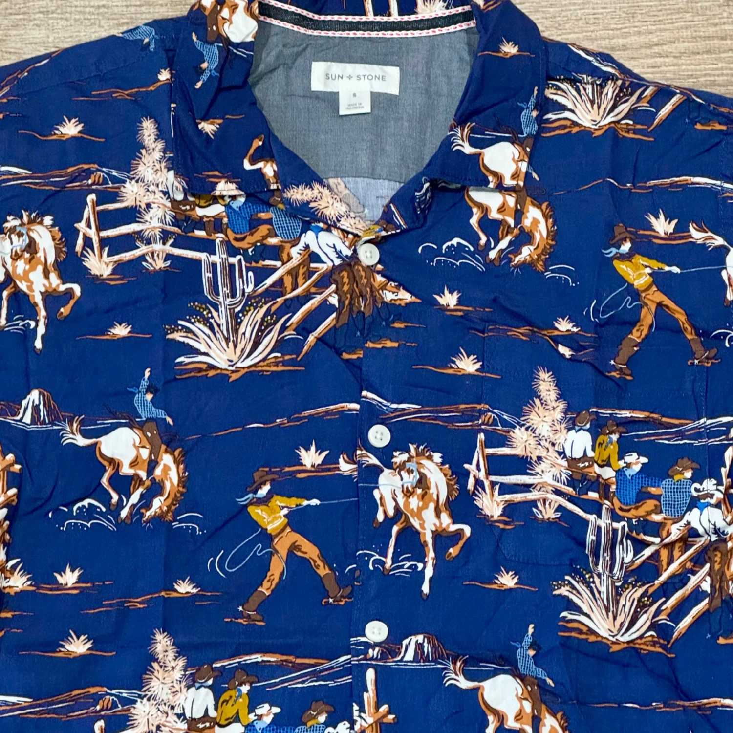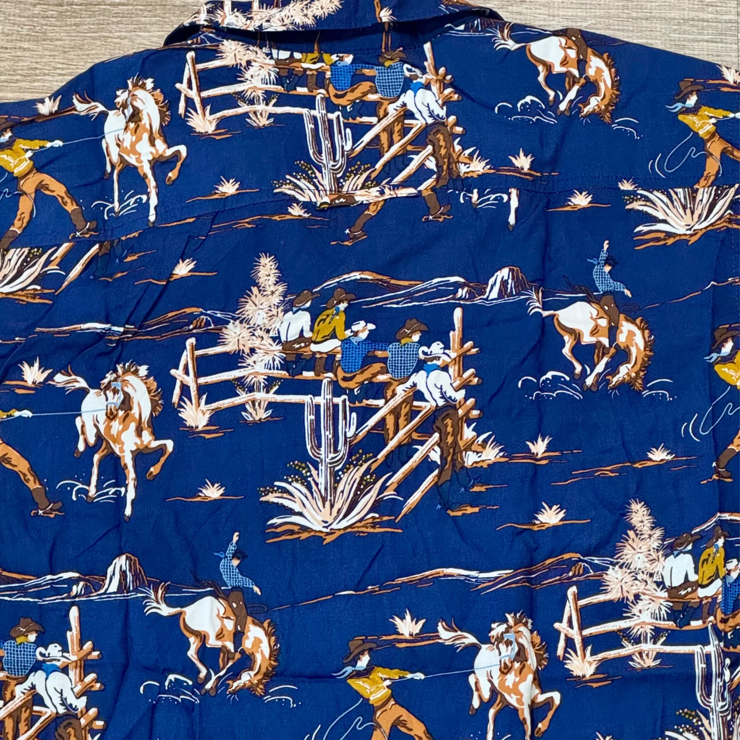 Stylish men's shirt featuring a vibrant blue color with a unique western print. Perfect for casual outings or themed events. Size: Small Material: 100% Rayon Underarm pit to pit approx: 19.5” Length approx: 26.5” Machine wash cold gentle cycle with like colors Made in Indonesia MSRP: $40