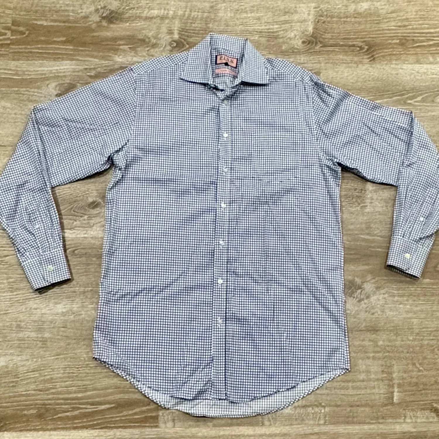 Used great condition Thomas Pink Jermyn Street London Men’s Dress Shirt Blue white check. Sharing the same design DNA as other Thomas Pink shirts, our Traveler shirts have been created as the perfect travel companions. Traveller shirts are made from long-staple cotton and woven to be crease-resistant. This means they can be worn straight from your luggage but will also stay crisp and sharp from departure to arrival and long after. Blending the convenience of an easy-care shirt with the tailoring excellence you expect from Thomas Pink, our Traveller shirts take the toil out of touring. Size: 15.5-36 small Underarm pit to pit flat: 21.5 - 22” Length front: 32.5” Length back: 34” Traveller classic Material: 100% cotton Wash dark colors separately Made in Indonesia MSRP: $175