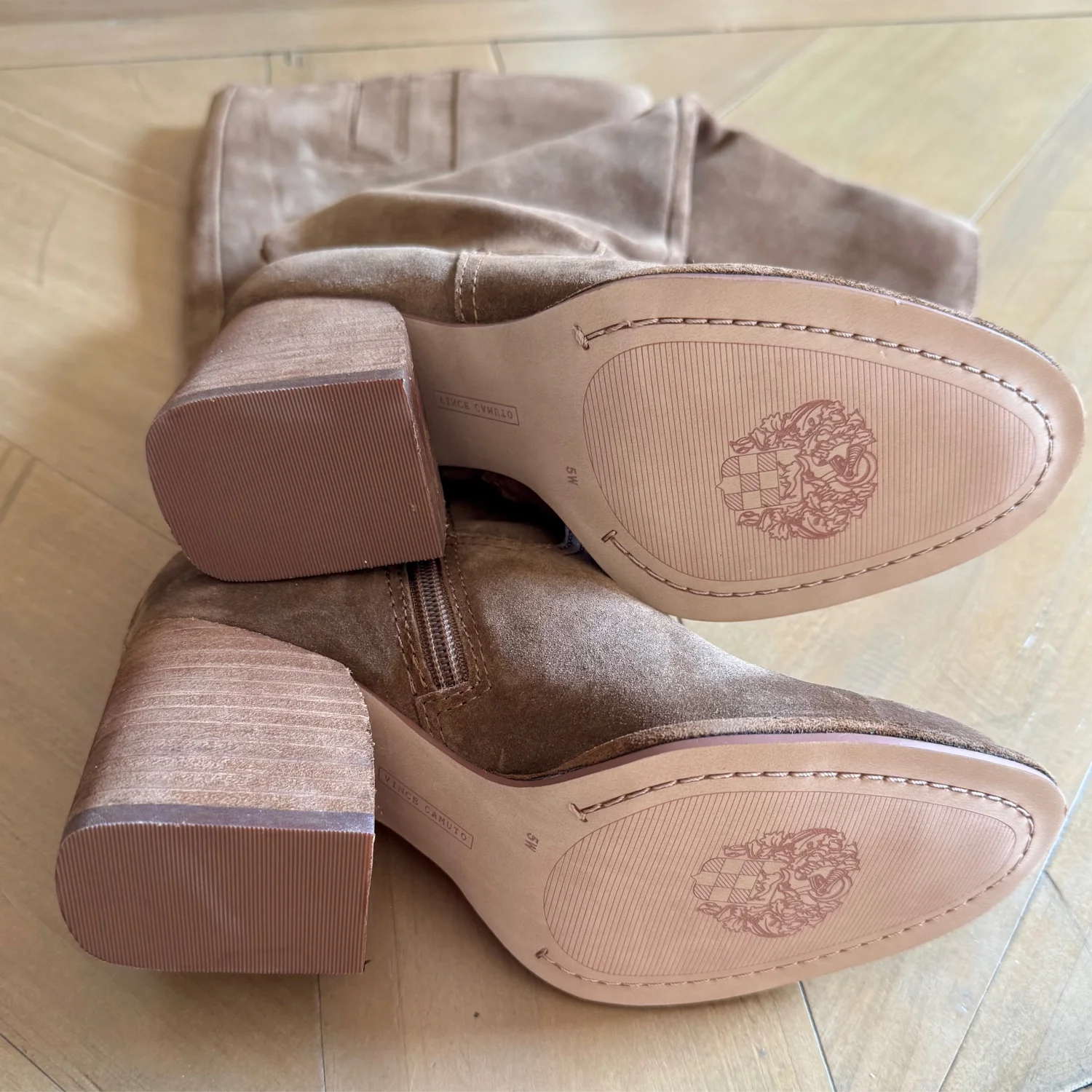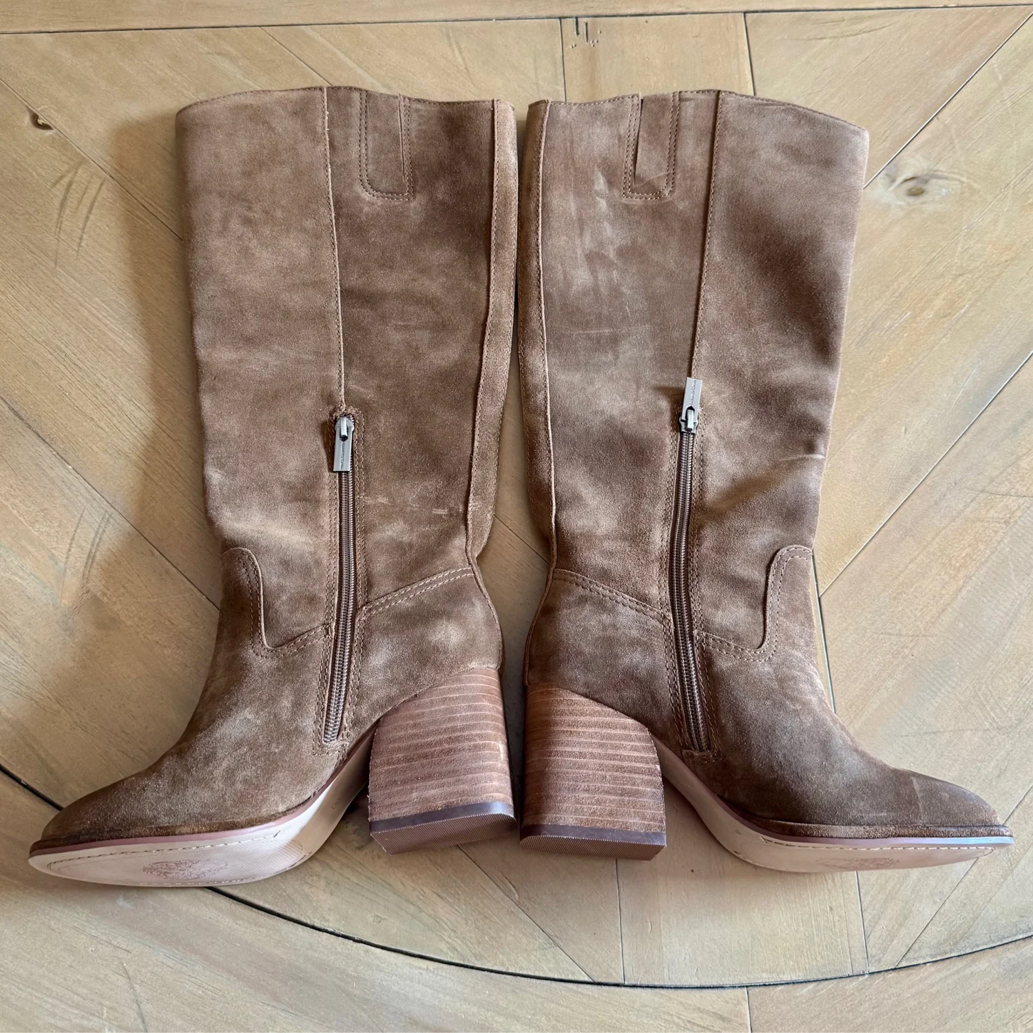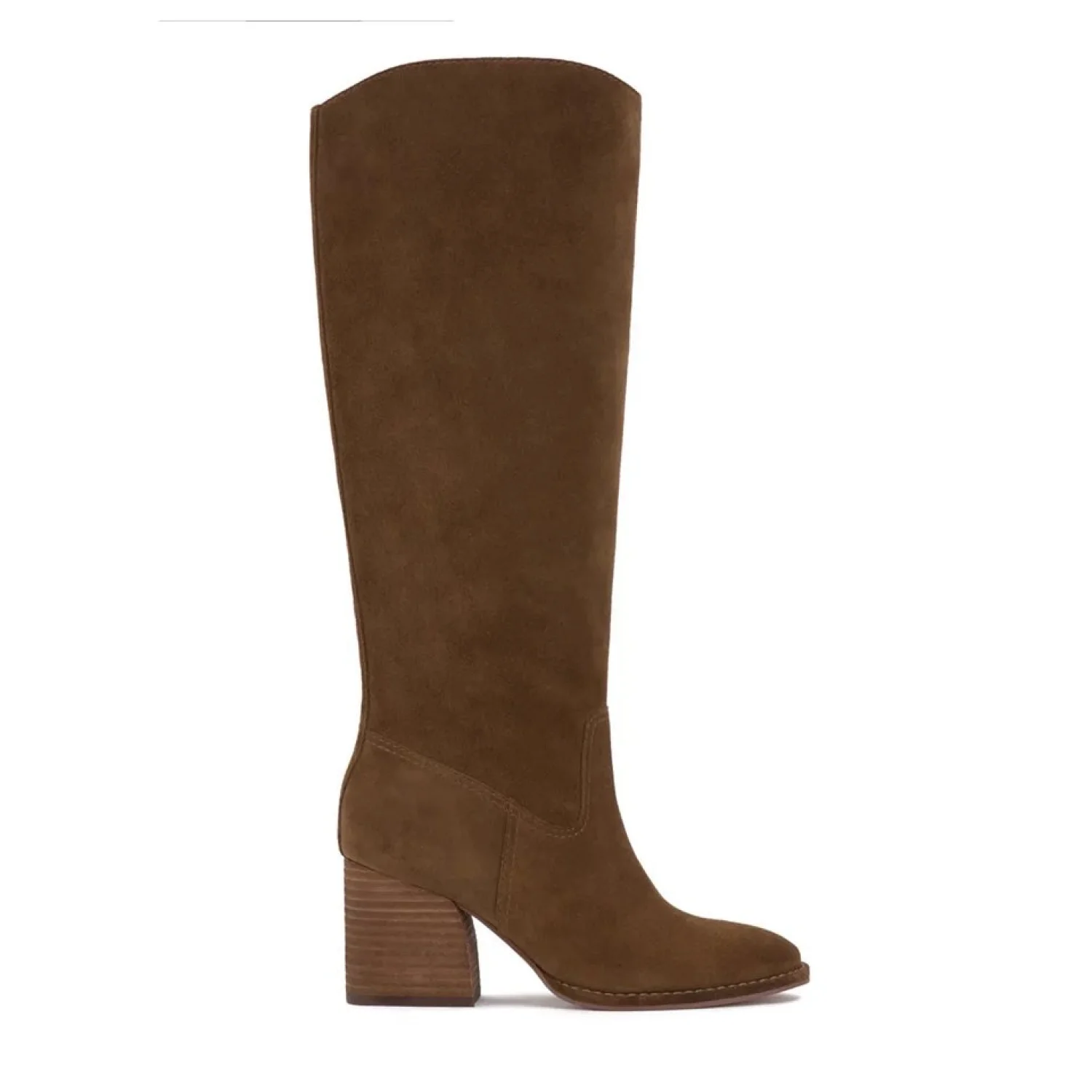 Elegance meets effortless style in the Vince Camuto Leila boot. A smooth leather upper offers durability. The asymmetrical topline, classy round toe, and stacked block heel stylize the zipper boot. Size: 5 Width: Wide Color: Reishi Brown Leather upper Pull-on Inside zipper closure Round toe Fabric lining Approx. 15" shaft height Approx. 14.6" calf circumference 2.8" stacked block heel Synthetic sole Imported MSRP: $239