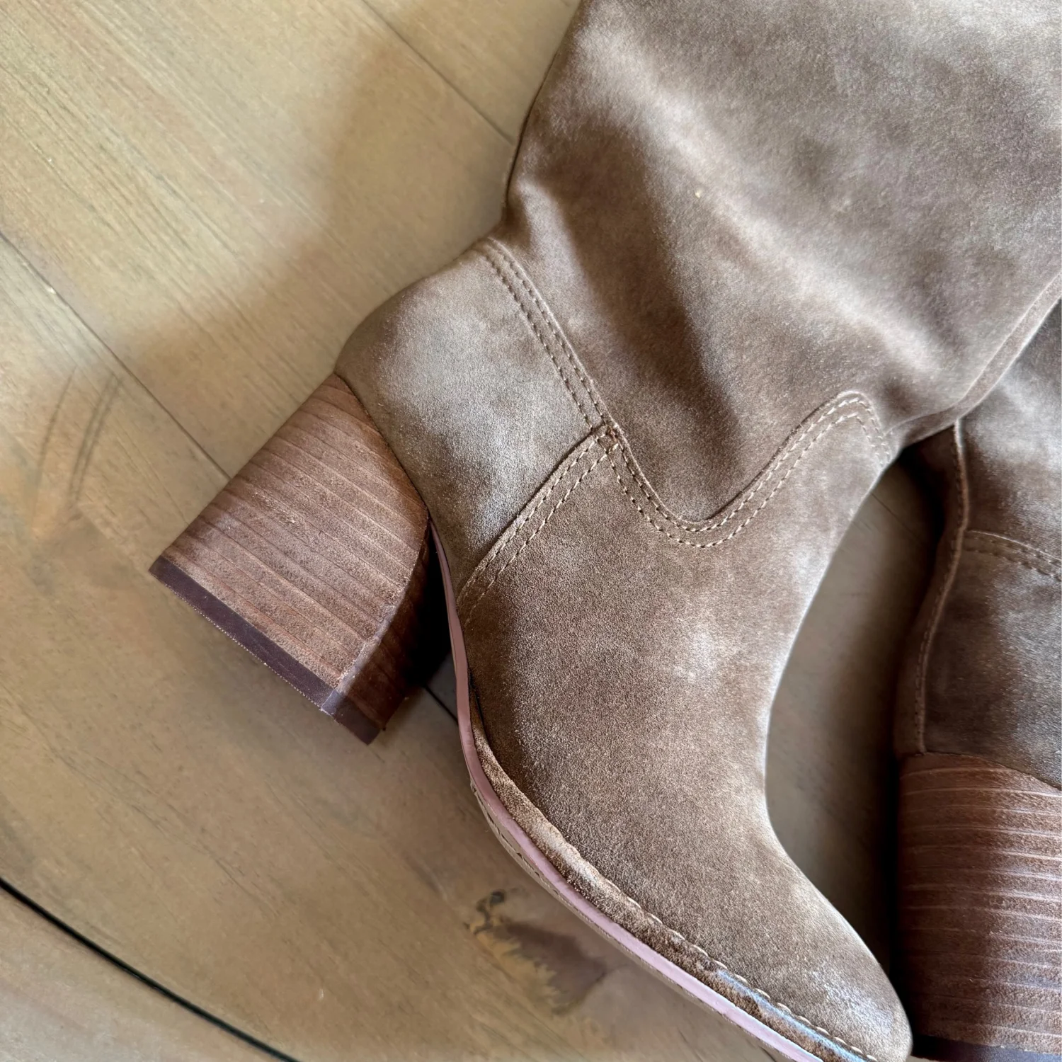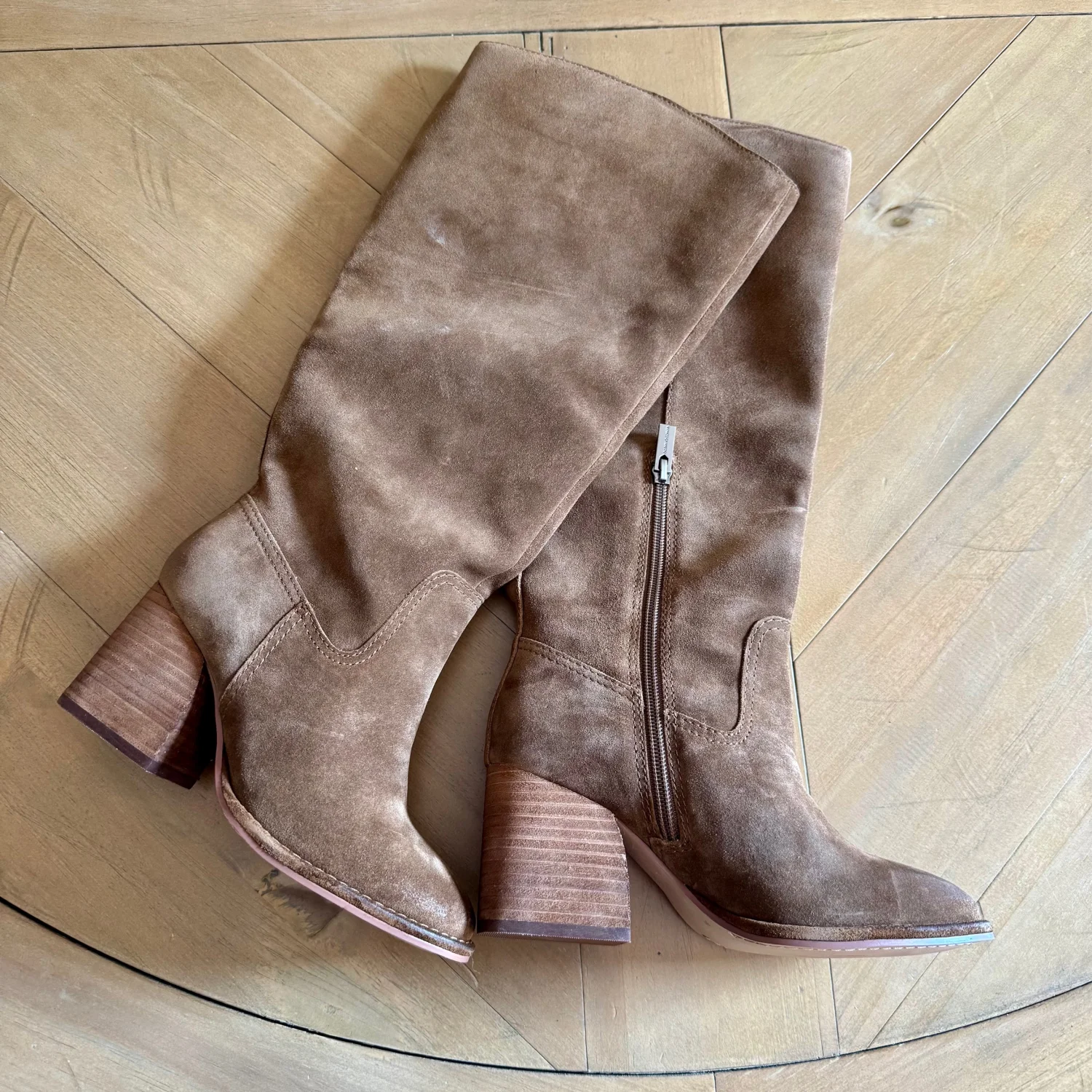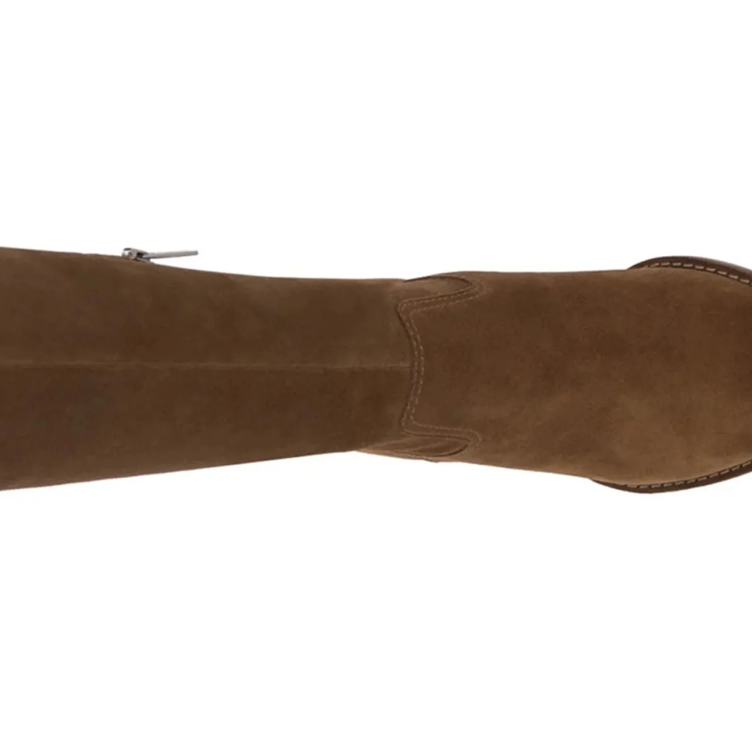 Elegance meets effortless style in the Vince Camuto Leila boot. A smooth leather upper offers durability. The asymmetrical topline, classy round toe, and stacked block heel stylize the zipper boot. Size: 5 Width: Wide Color: Reishi Brown Leather upper Pull-on Inside zipper closure Round toe Fabric lining Approx. 15" shaft height Approx. 14.6" calf circumference 2.8" stacked block heel Synthetic sole Imported MSRP: $239