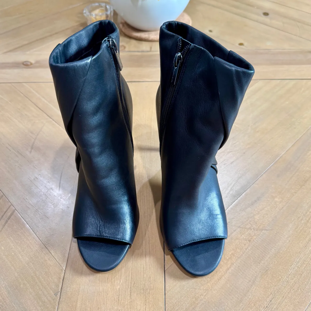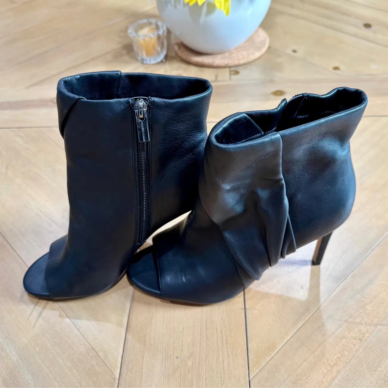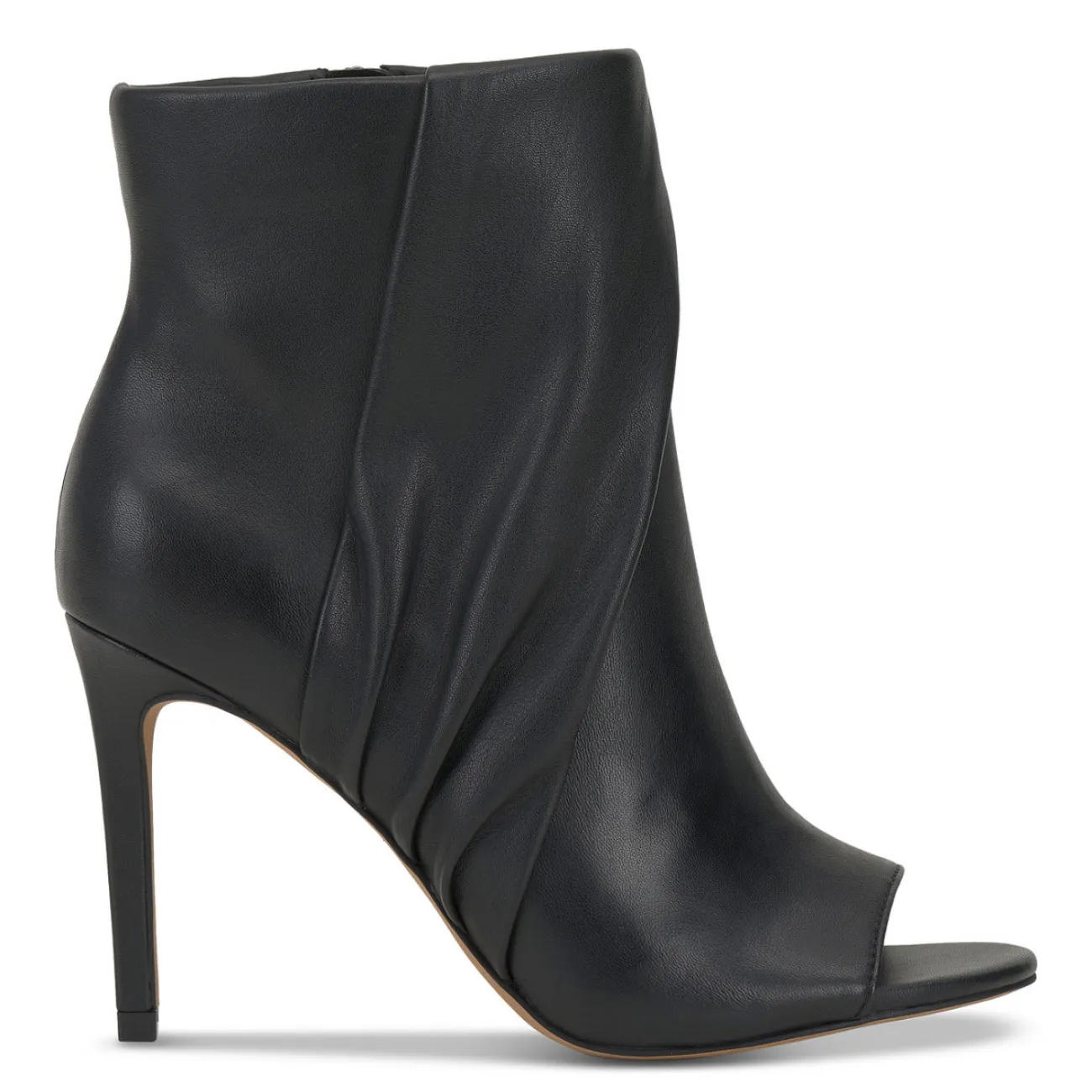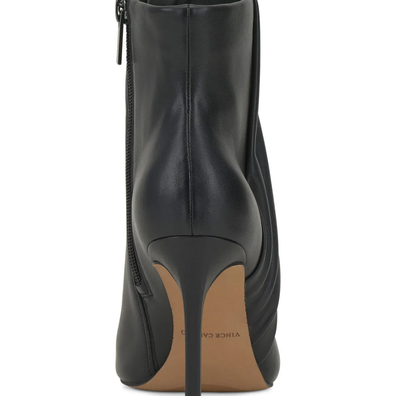 Assymetrical ruching lends modern dimension to a sleek silhouette in the Atonna stiletto booties from Vince Camuto • Size: 8 / 39 • Width: Medium • 3-1/2" stiletto heel • Round-toe booties with inner ankle zipper closure • Ruching at upper • Leather or suede uppers; fabric lining; rubber sole • Imported • MSRP: $127.20