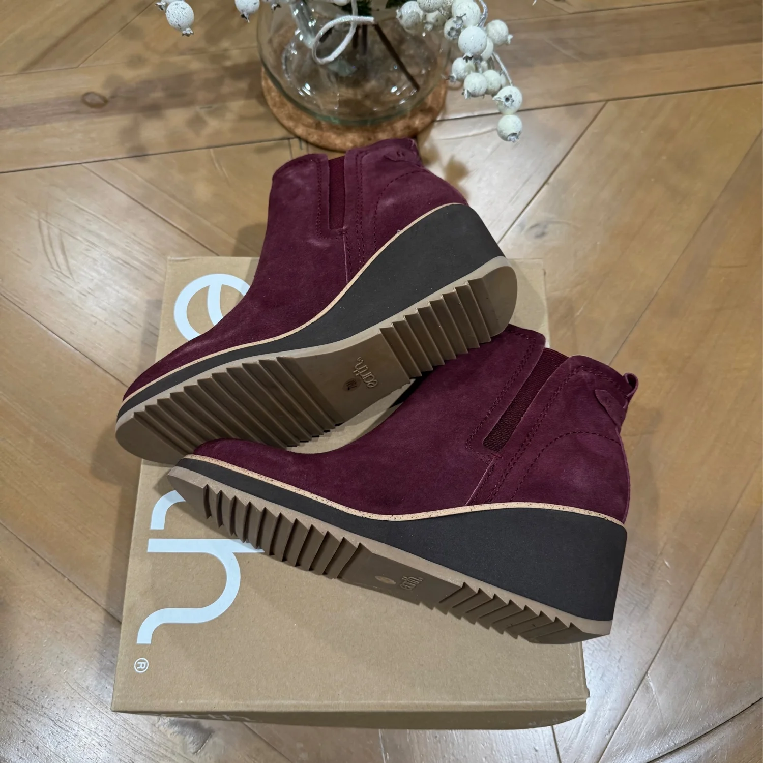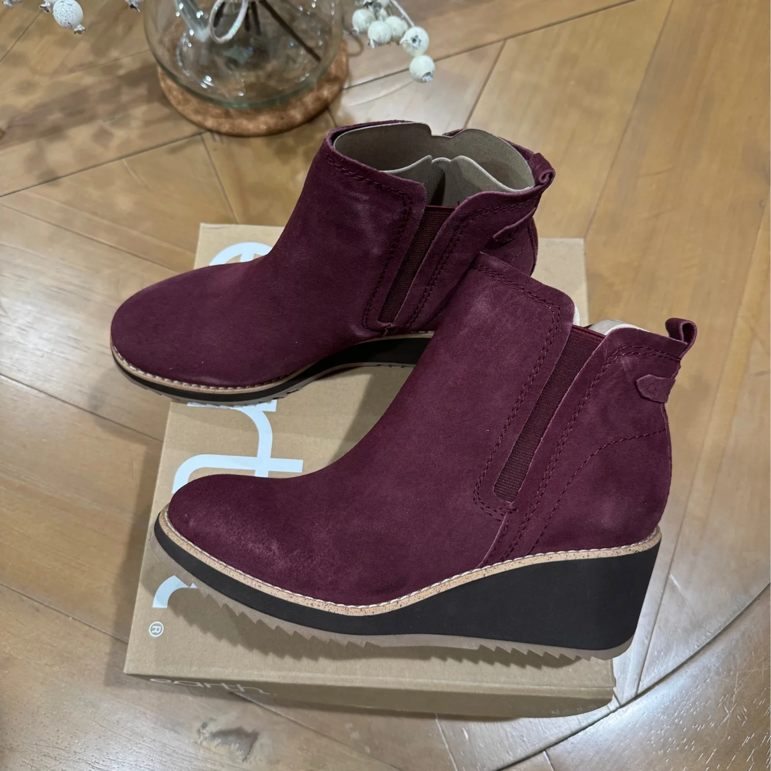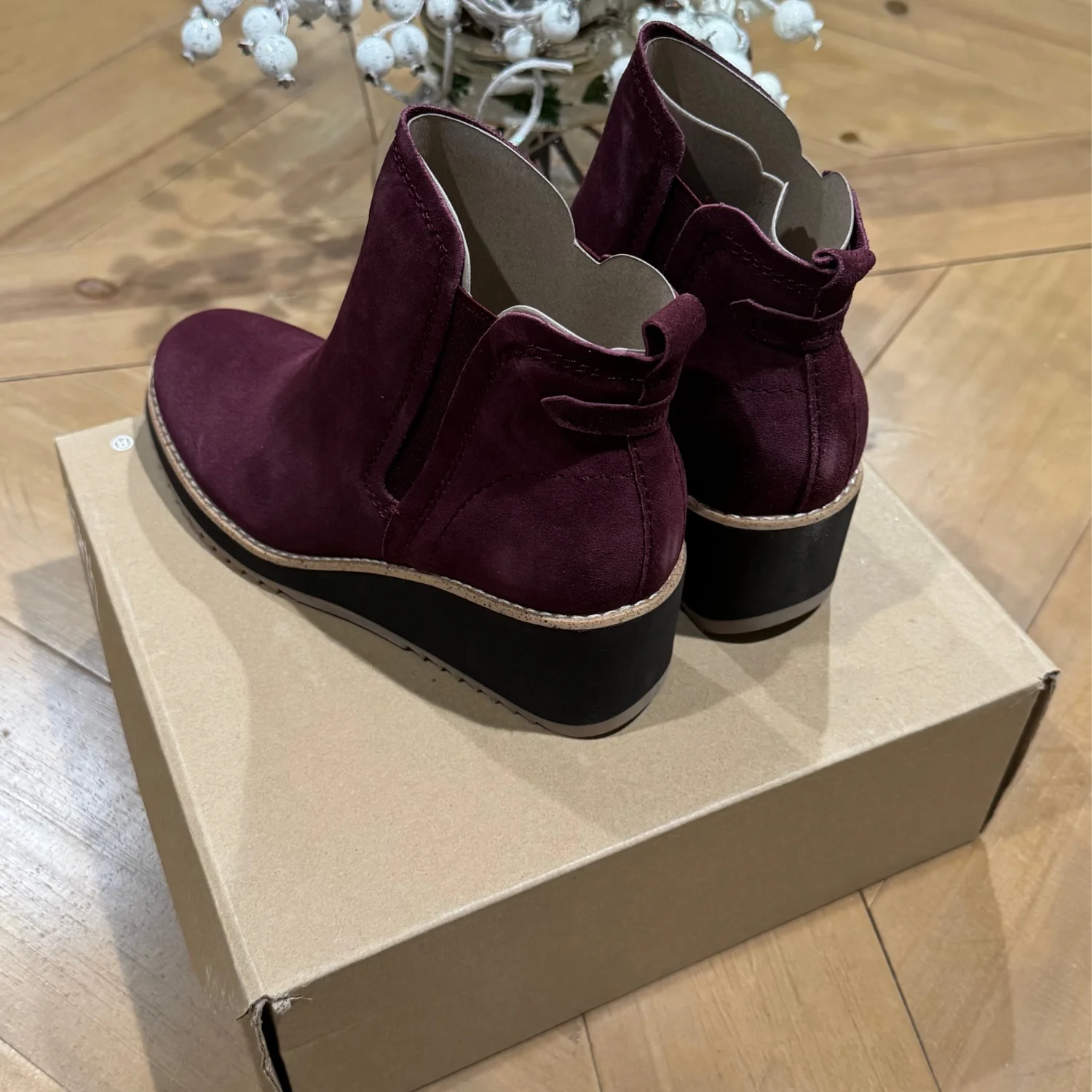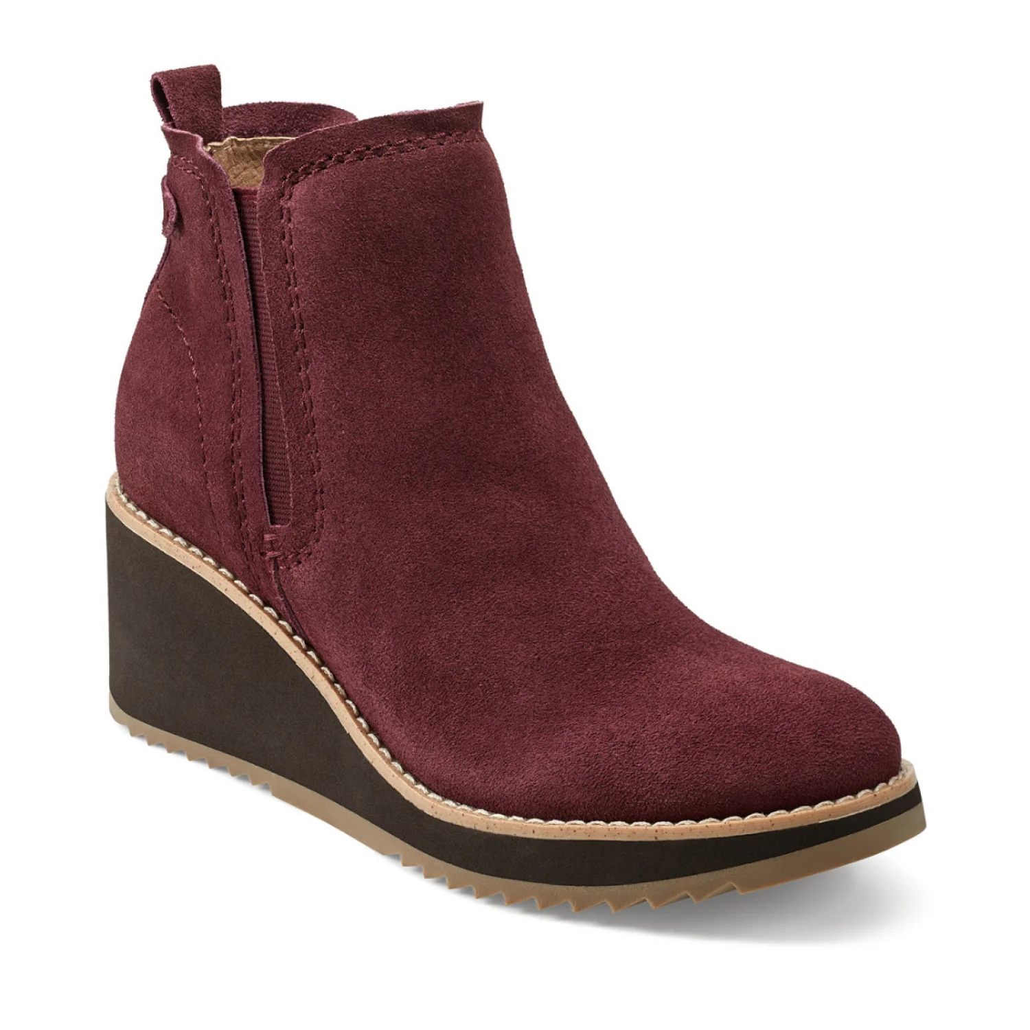 Supreme comfort, responsible design, effortless style, the Earth Cleia casual wedge bootie has all three. It features a round toe, arch support, and a soft lining. Plus, it offers memory foam cushioning made for long-term comfort. Extraordinary comfort for everyday pursuits. • Size: 7.5 • Width: Medium • 2.64" wedge heel, 0.71" platform height • Shaft height- 3.94", calf circumference- 11.42" • Shoe width- medium • Pull-on closure • Cushioned insole, arch support • Suede upper, textile and manmade lining, manmade sole • Round toe • Suede • Spot Clean • MSRP: $100