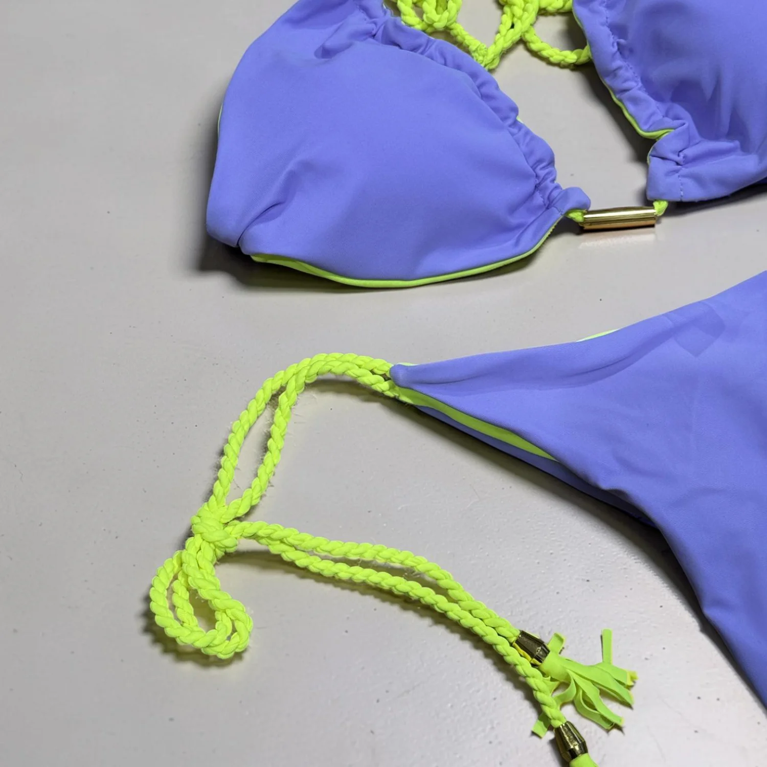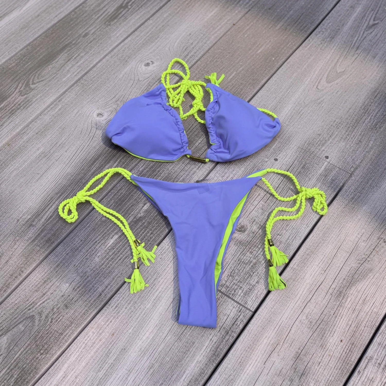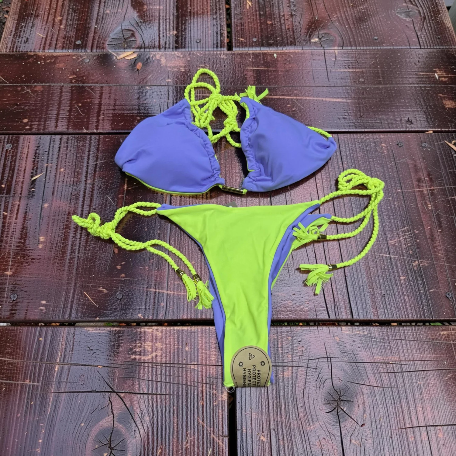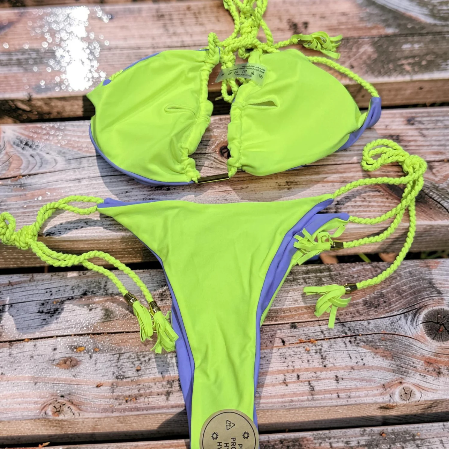 Cute Tie-up swim bikini in purple with neon green trim and braided ties. Soft, quick-dry fabric designed for active play. Adjustable string ties for a secure, customizable fit. Bright purple and neon green color combination adds fun poolside style. Size: Medium Material: 80% Nylon 20% Spandex Details: Lace Up Pattern: Solid Color Sheer: Semi Sheer Fabric: Medium Stretch Wash dark colored clothes separately , do not dry clean Weaving method: Knit Fabric Made in China
