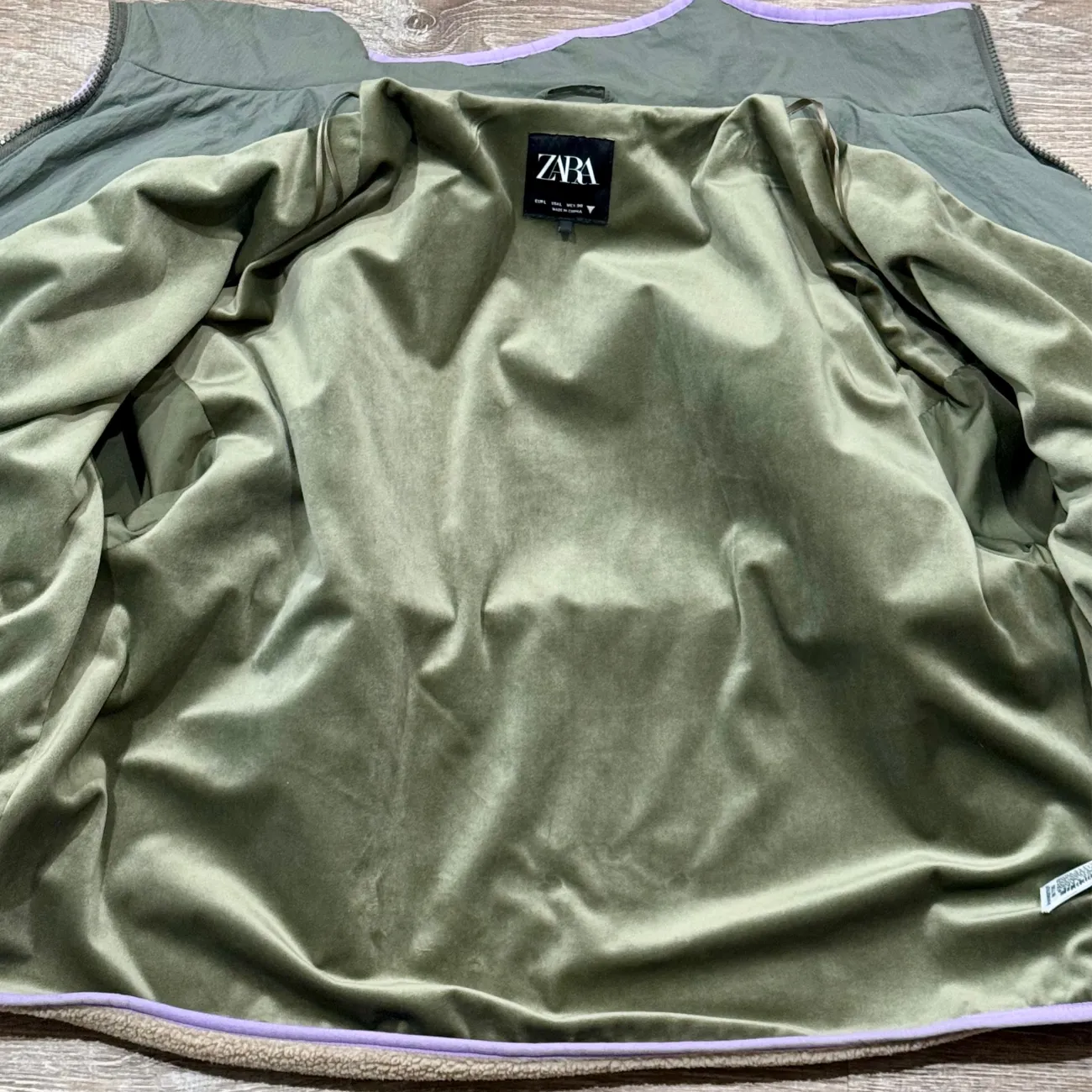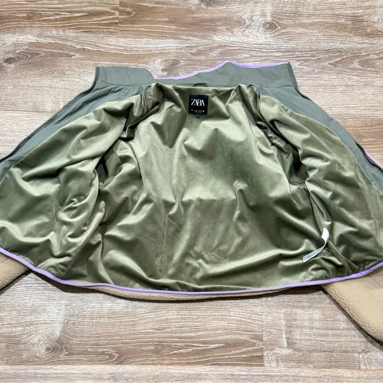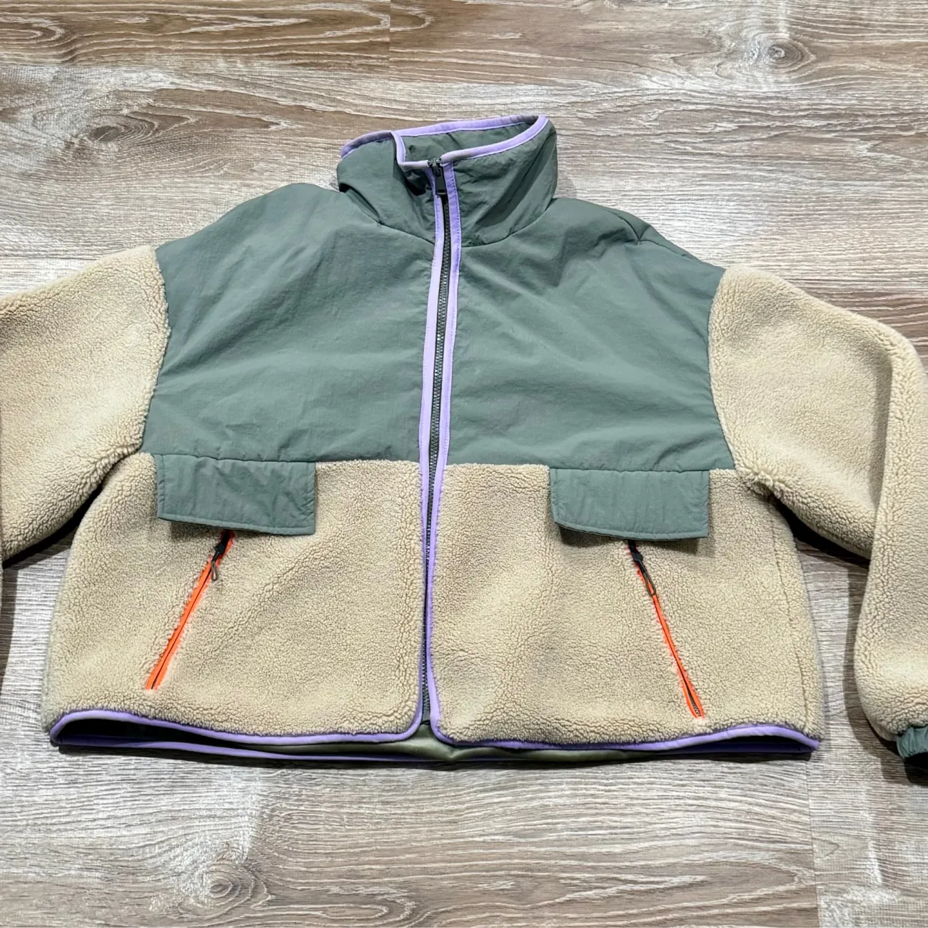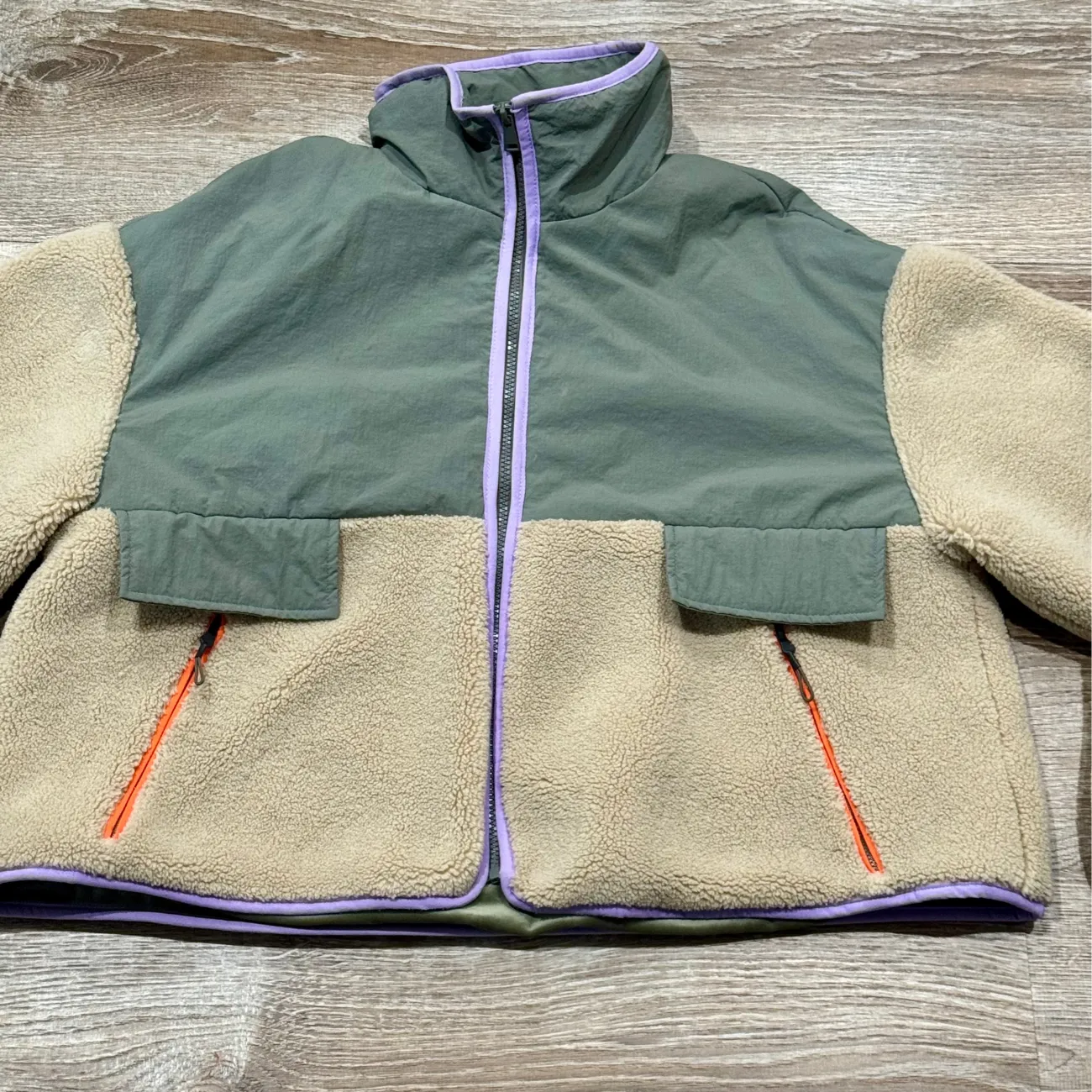 Used great condition Zara Fleece Jacket Sold Out Keeps you warm and stylish with this cozy two-tone fleece jacket. Featuring a green and tan design, it's perfect for chilly days. Size: Large Colors: Beige & Gray/olive & purple & Orange Occasion: Casual Pattern: Solid Zip Pockets Length: approx 22.5” - 23” Underarm pit to pit flat: approx 23” Material: Nylon & Polyester Machine wash cold with like colors Made in China MSRP: $150