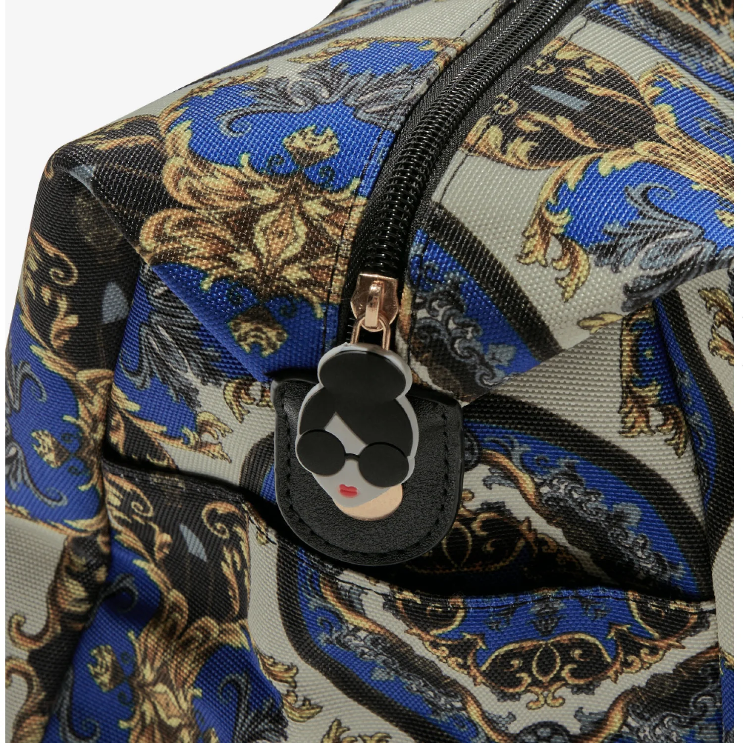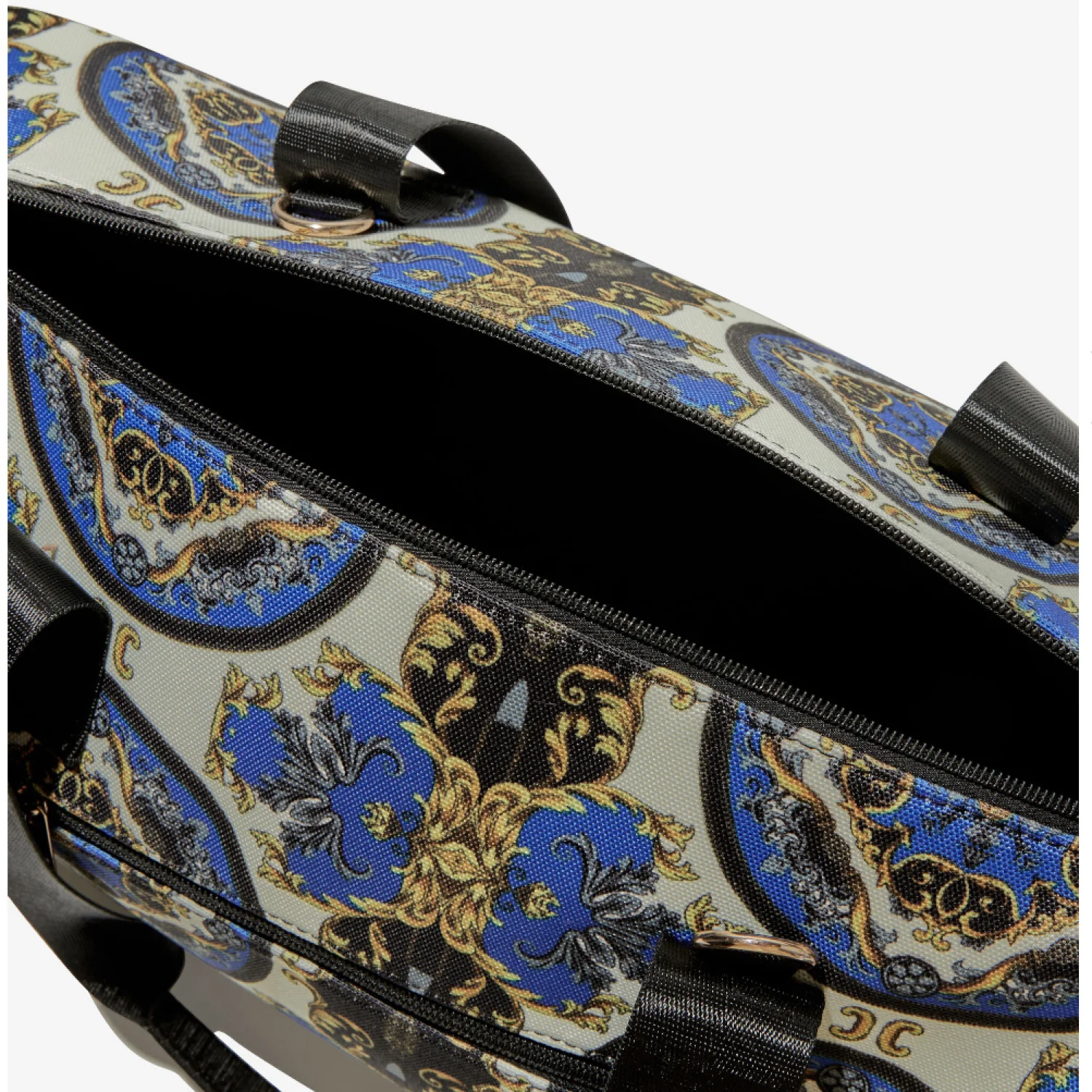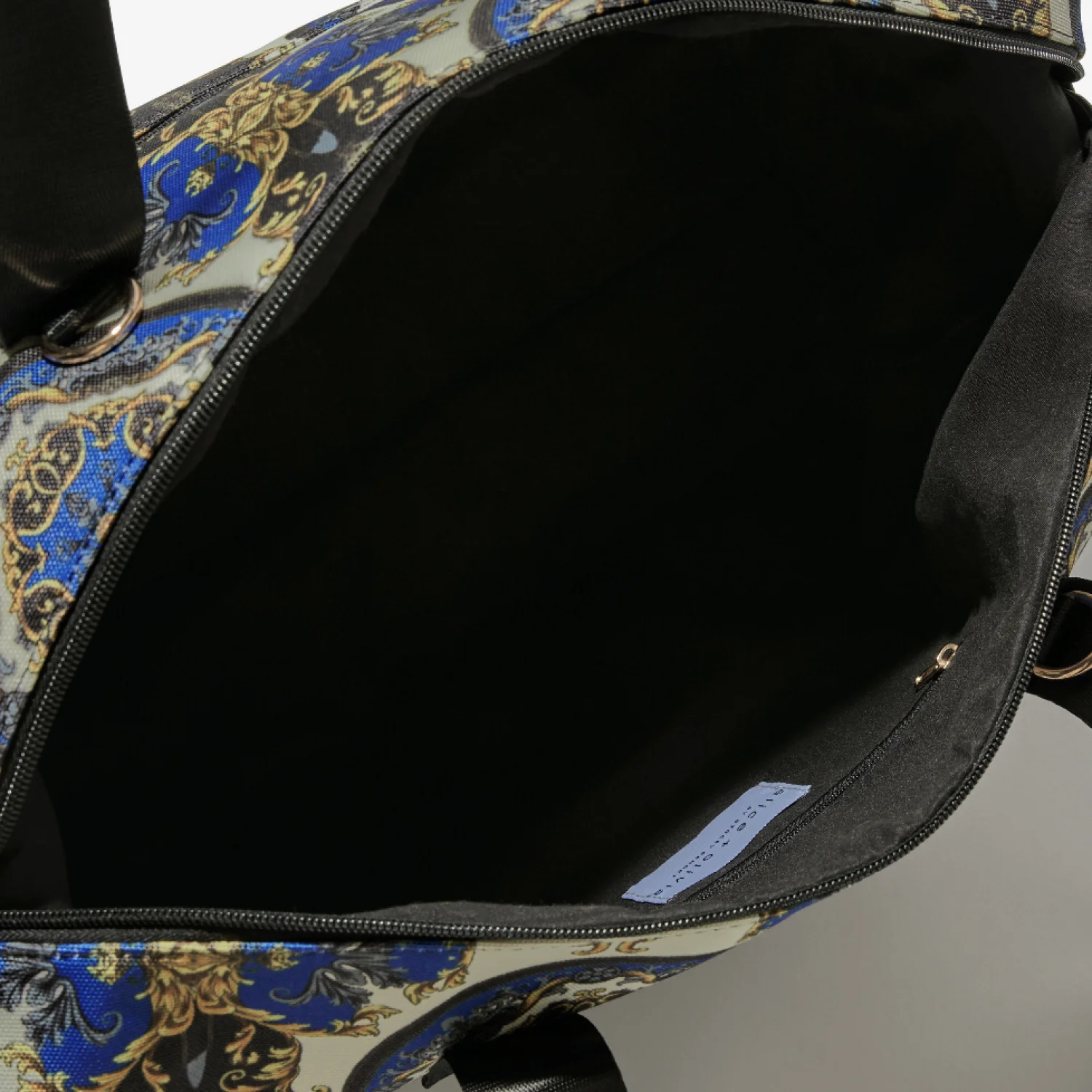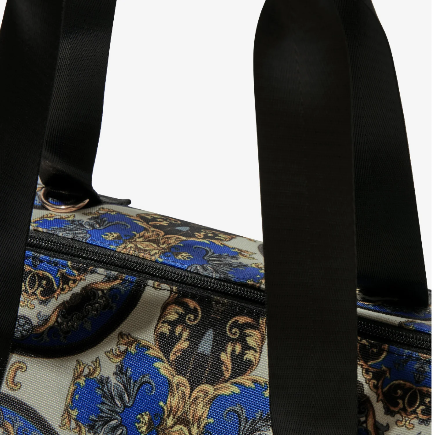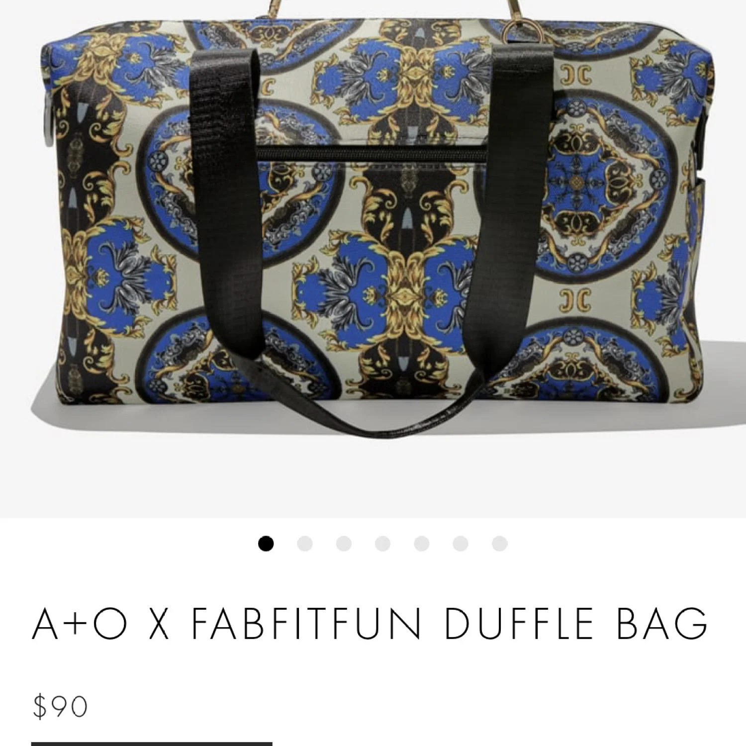 This A+O collaboration with FabFitFun features a vibrant duffle bag, perfect for travel or gym use. The bag showcases a striking Regal Romance Sapphire print with ornate blue and gold patterns. It includes black woven handles and a secure zip closure with a unique icon zipper pull. The spacious interior is ideal for carrying all your essentials. I cannot find the shoulder strap, easy fix otherwise like new. #collaboration #stylish #travelbag #A+O #Regal #WeekendBag #Dufflebag