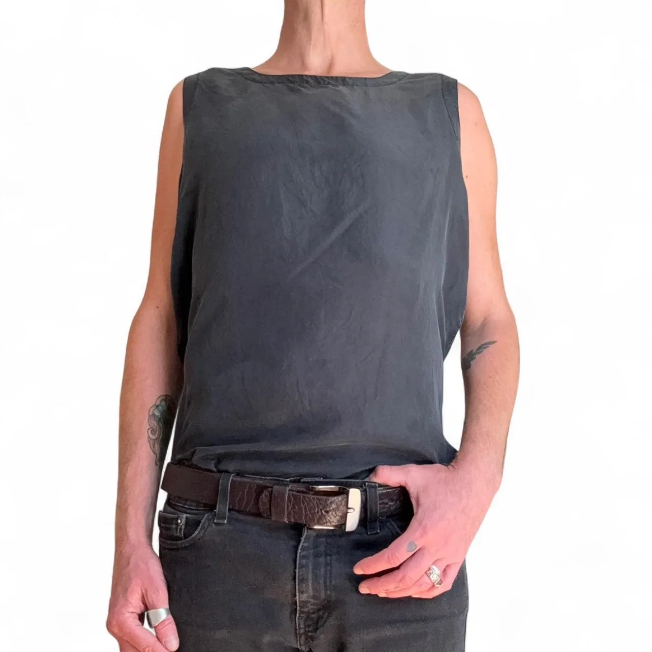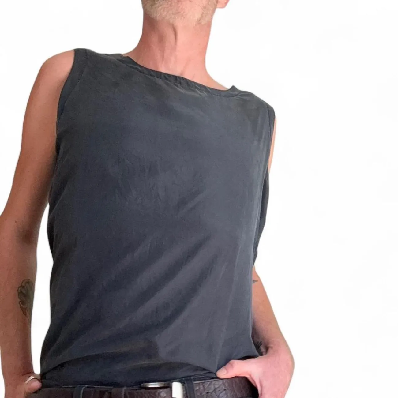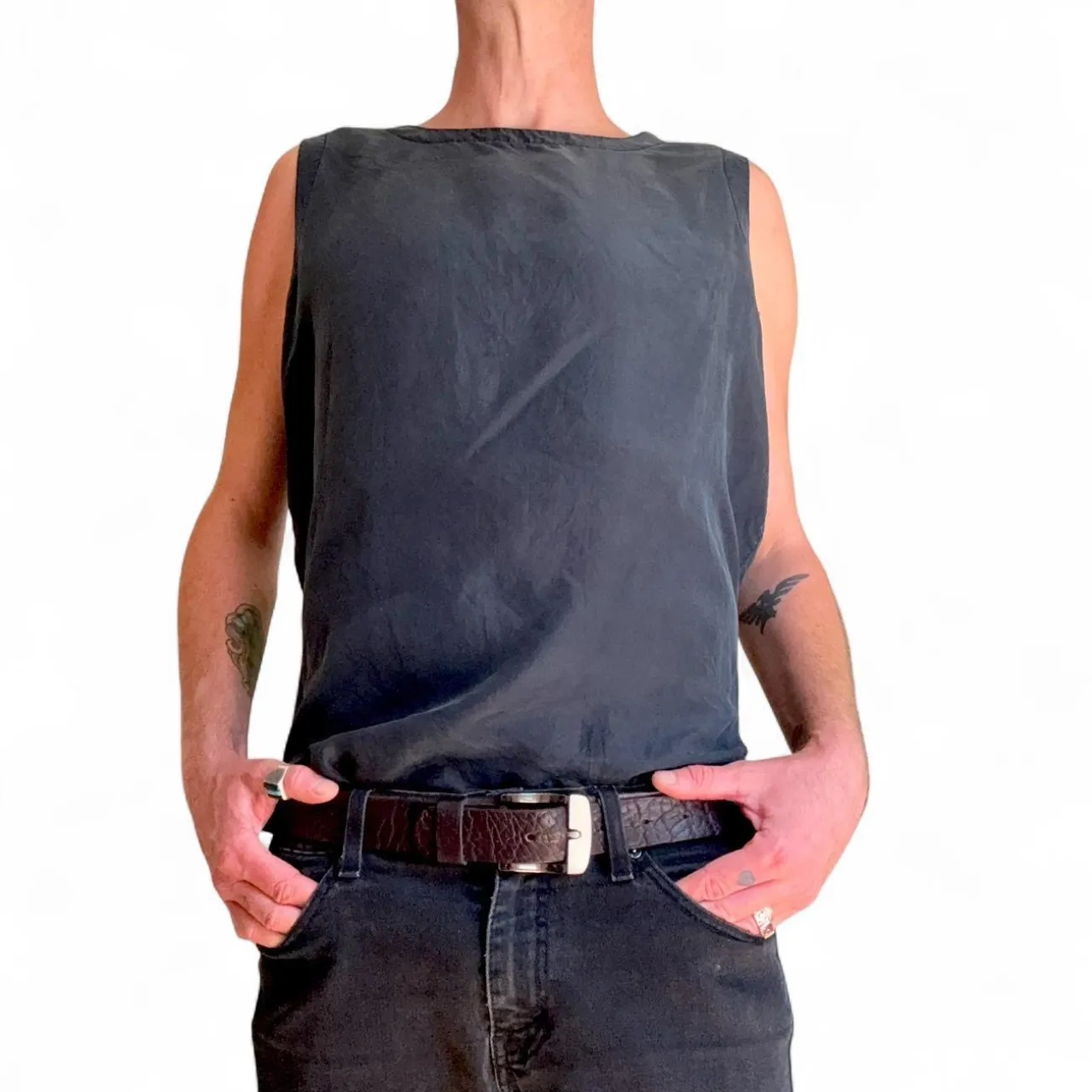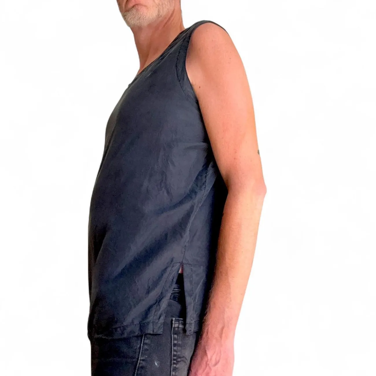 This Diane Gilman sleeveless top features a simple and casual design in solid black. Made from comfortable fabric, it is ideal for layering or wearing on its own during warmer months. Perfect for everyday wear or casual outings. The top offers side slits for added comfort and style. #casual #basic