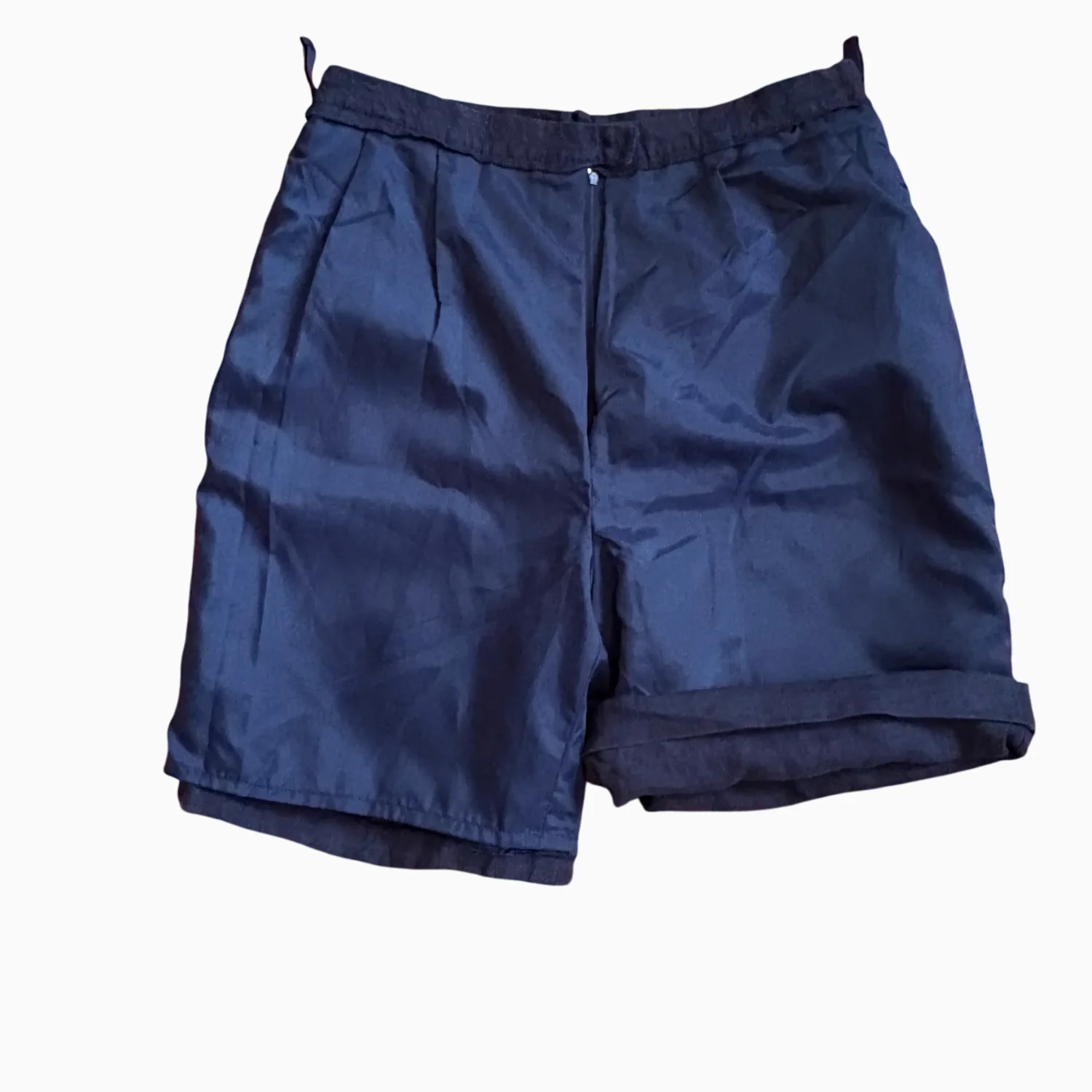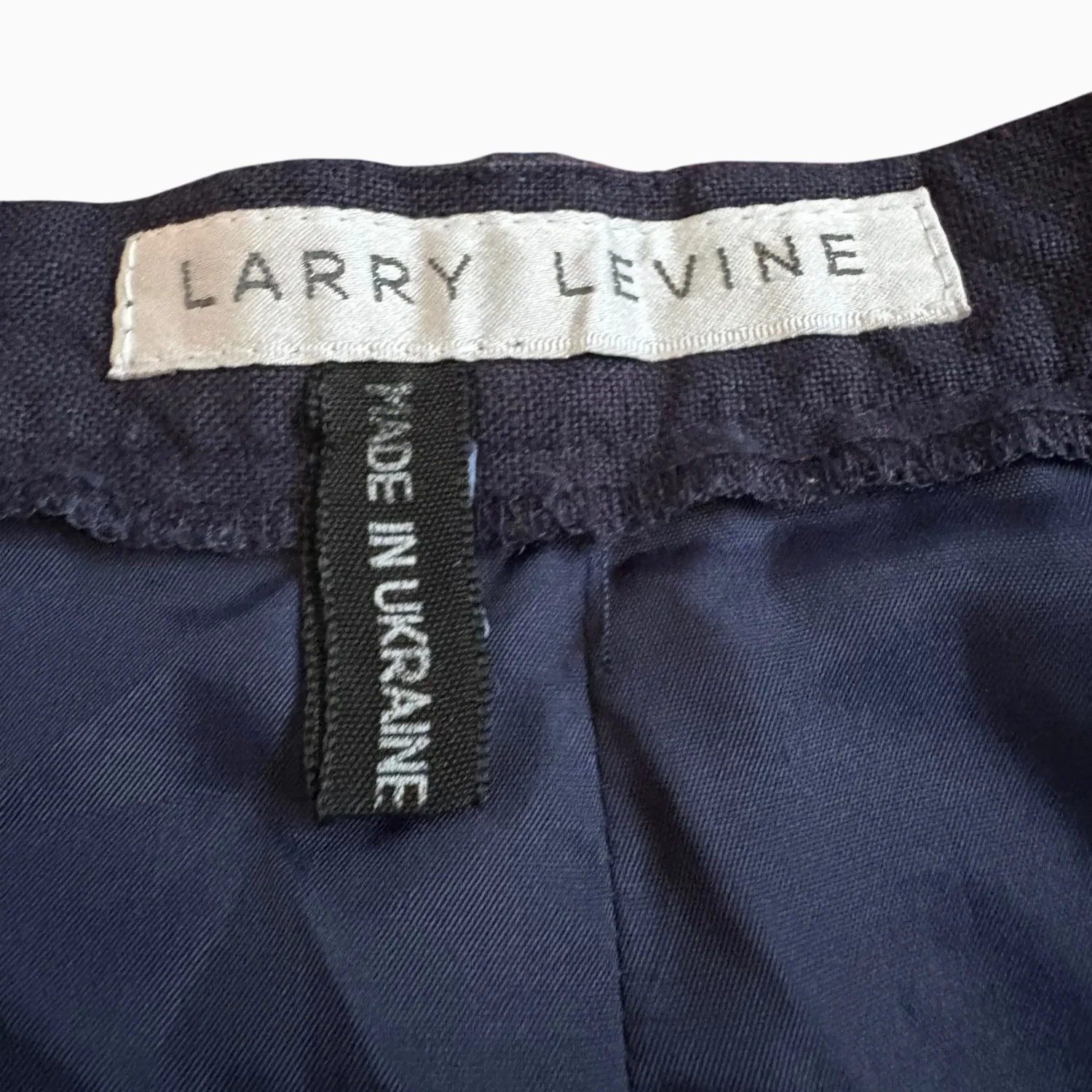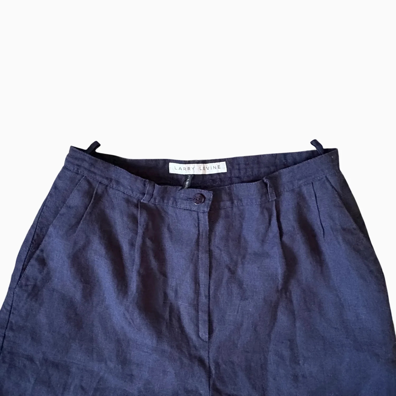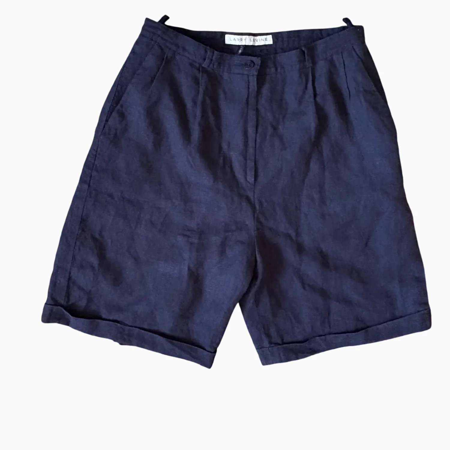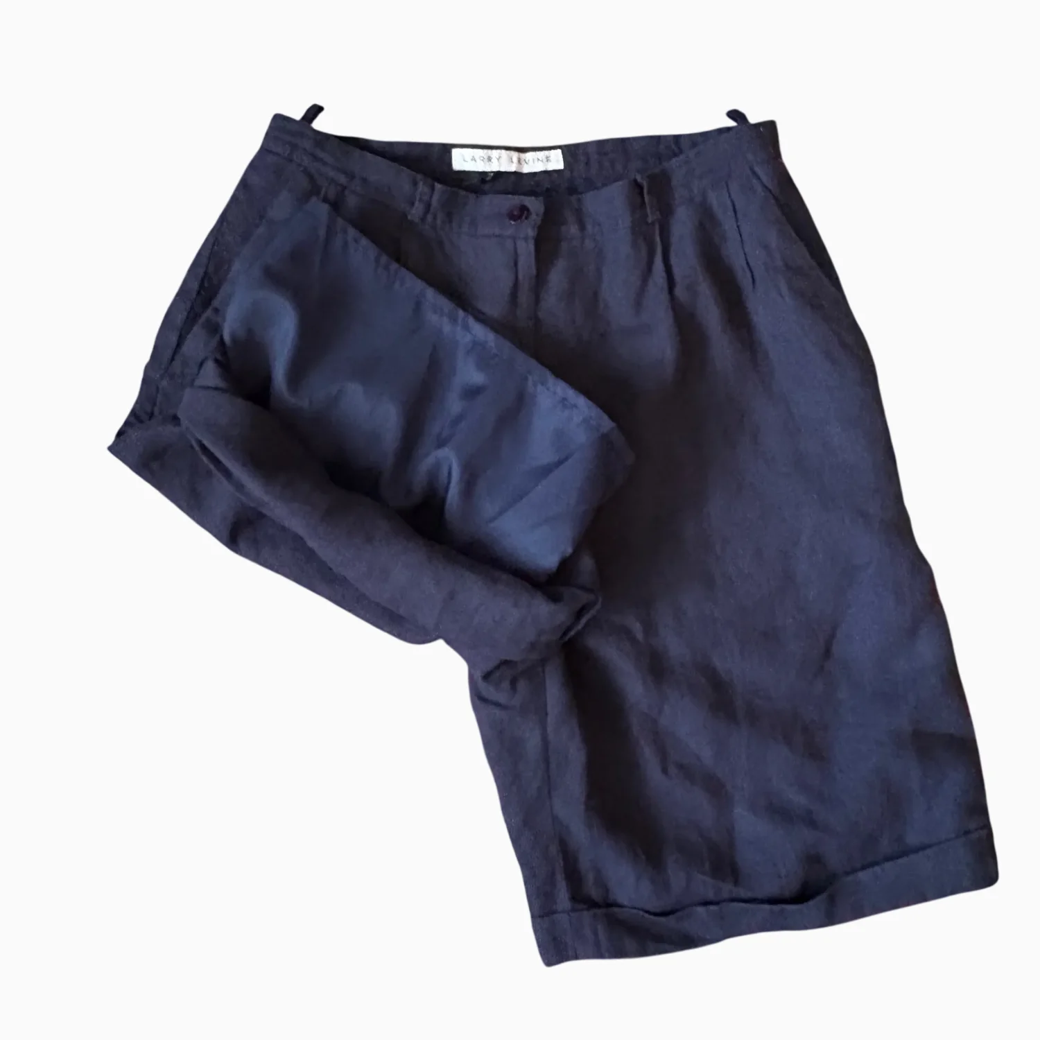 Casual navy shorts by Larry Levine crafted from a comfortable linen blend. Features a button and zip front closure, with a relaxed fit ideal for warm weather. These shorts are perfect for fall with cute tights. Shorts are beautifully lined, Made in Ukraine. #casual #linenblend #shorts #quietluxury #highwaisted
