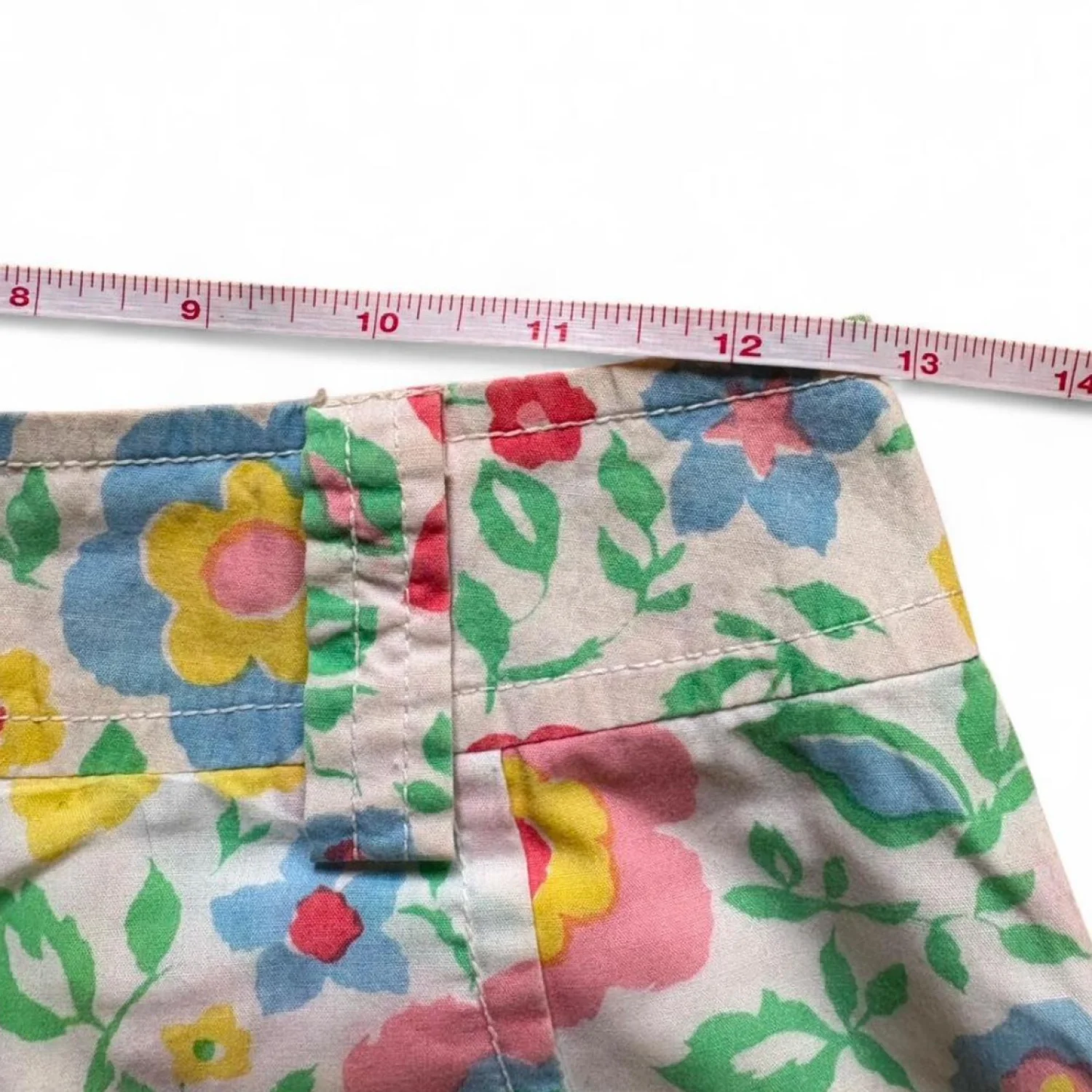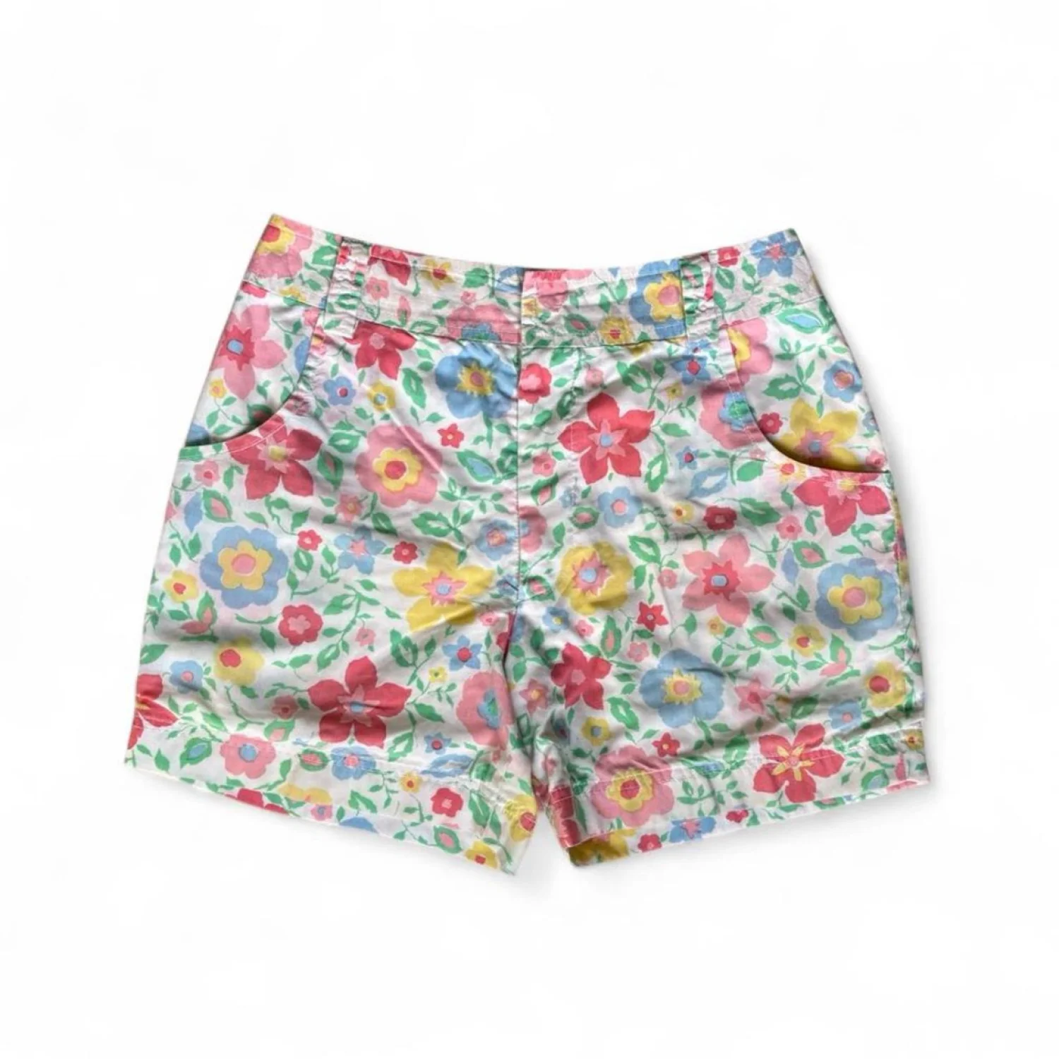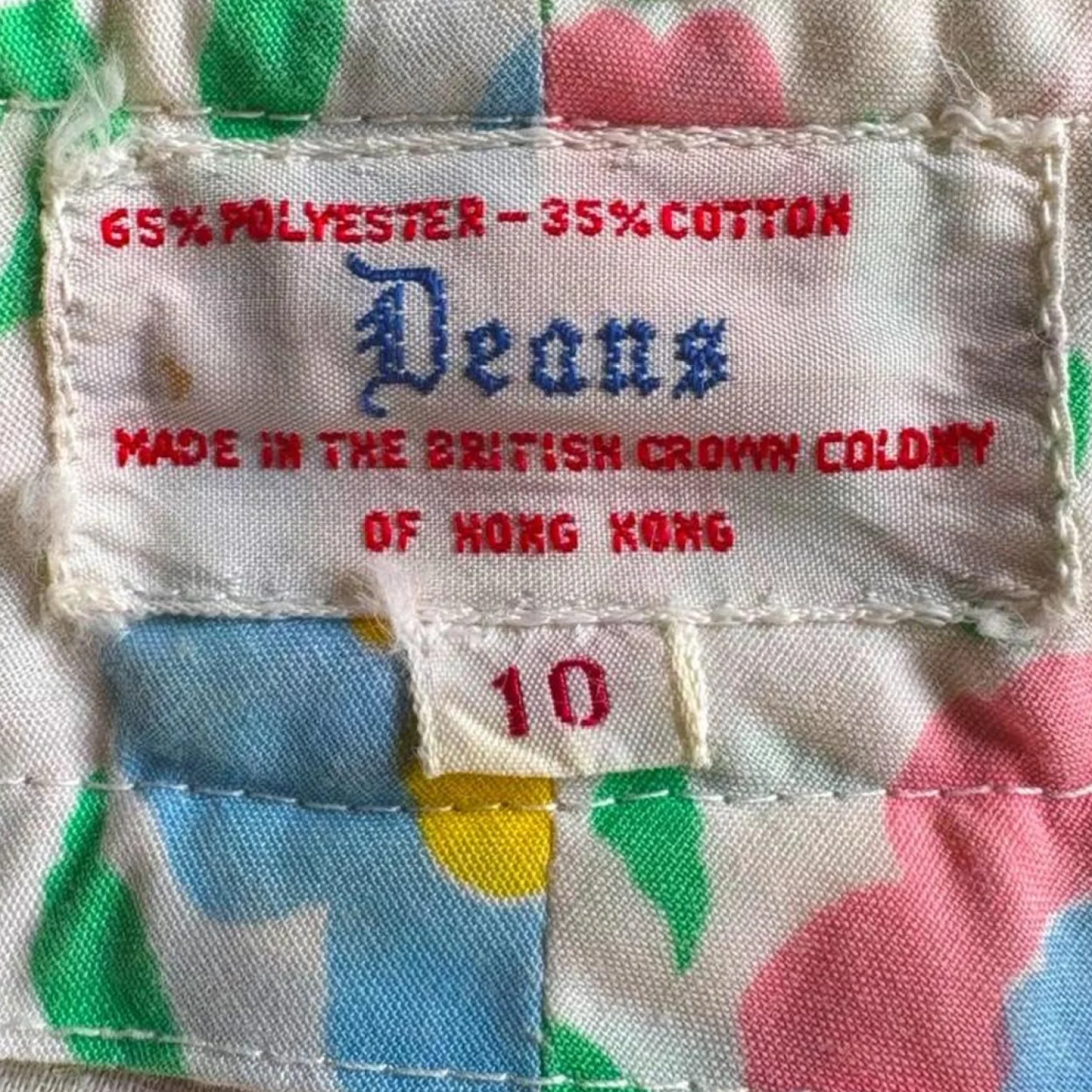 Bright and colorful vintage high-waisted shorts featuring a charming floral pattern in various shades, including pink, red, yellow, and blue. Made of 65% polyester and 35% cotton for comfort and durability. These shorts are from the brand 'Deans', known for quality craftsmanship. Ideal for a retro summer look. Size 10. #vintage #floral #highwaisted #retrofashion #shorts #bright