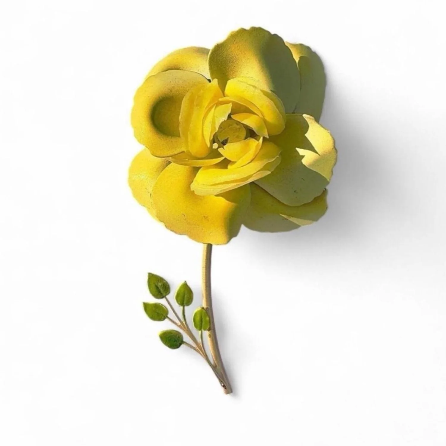 Elegant vintage brooch featuring a vibrant yellow flower with detailed petals and green leaves. Made from metal with a sturdy pin backing, perfect for adding a touch of color and charm to any outfit. Ideal for collectors or as a statement piece. #vintage #brooch #floral #retroaccessories