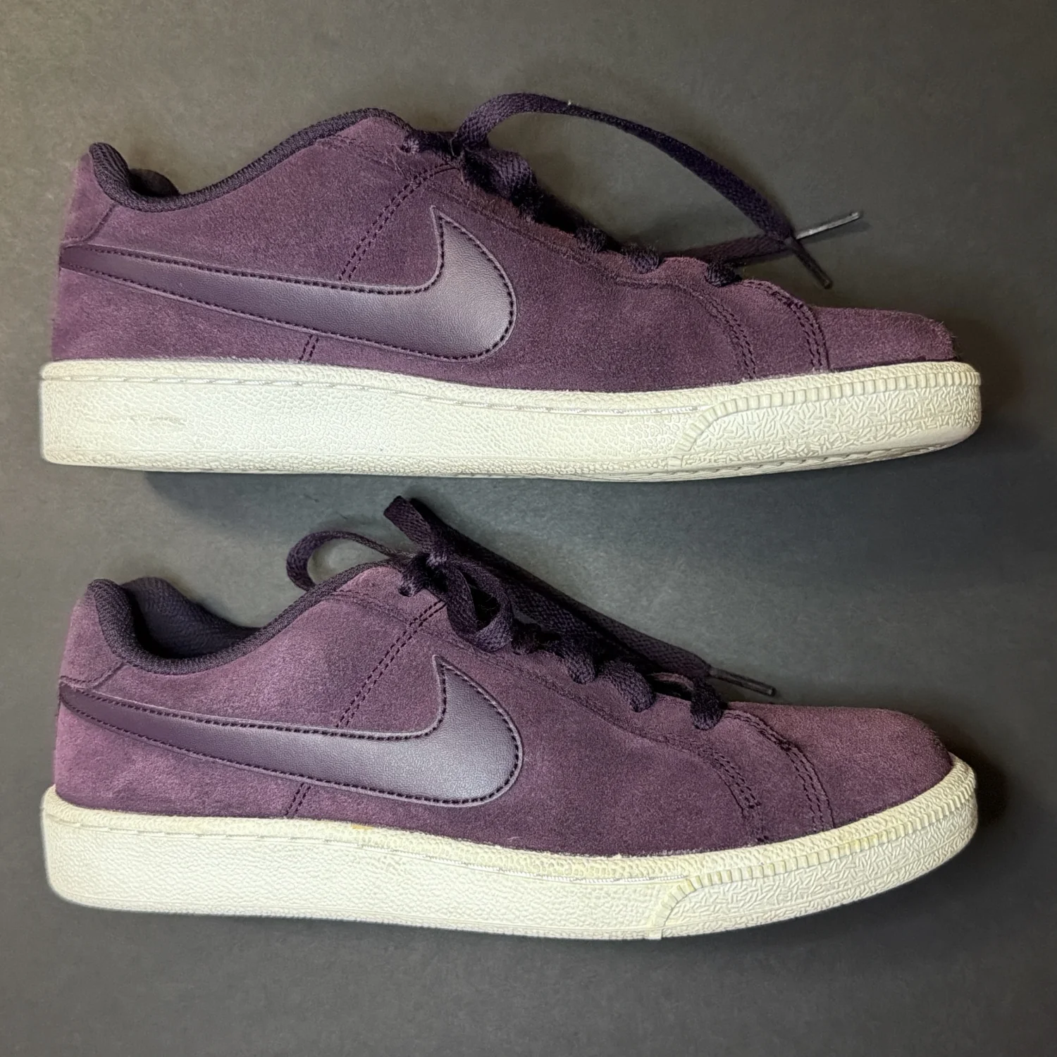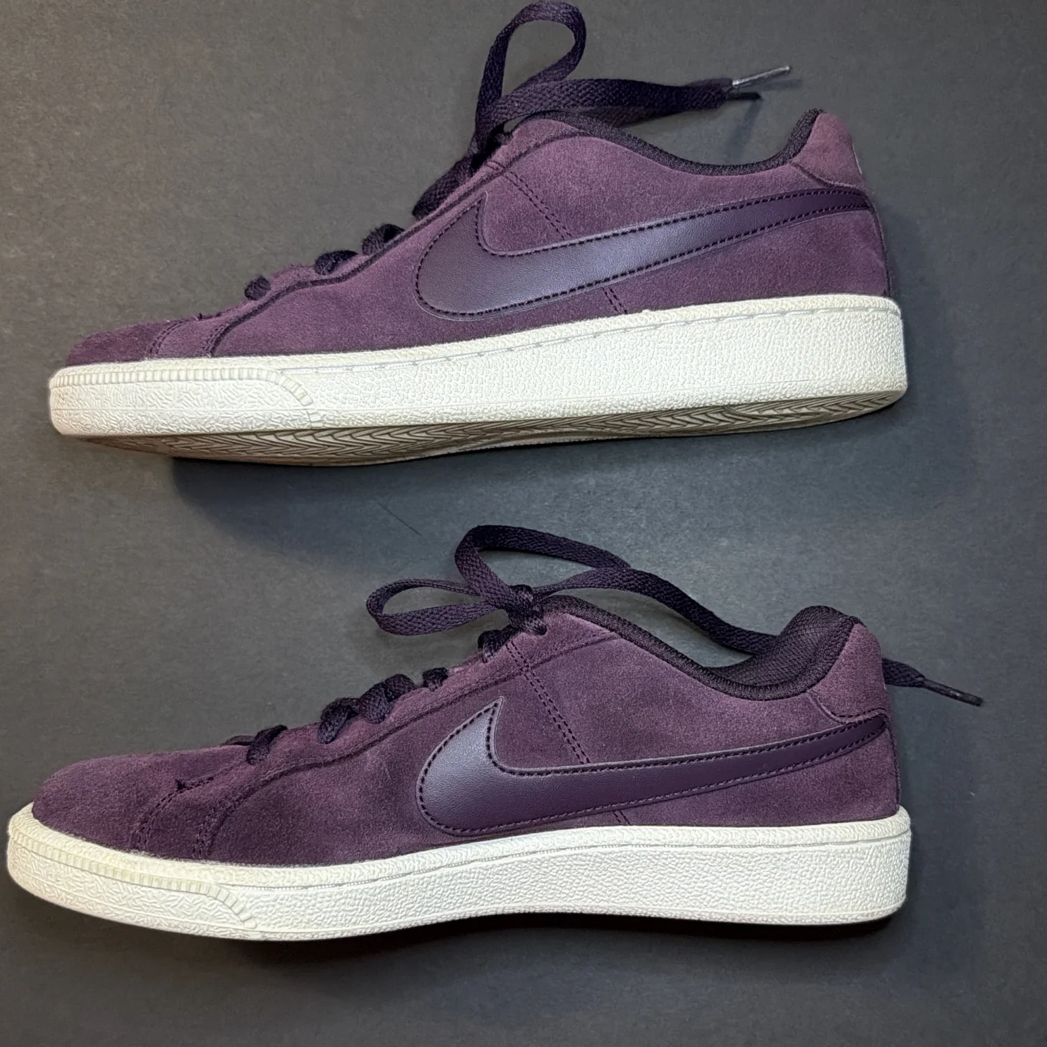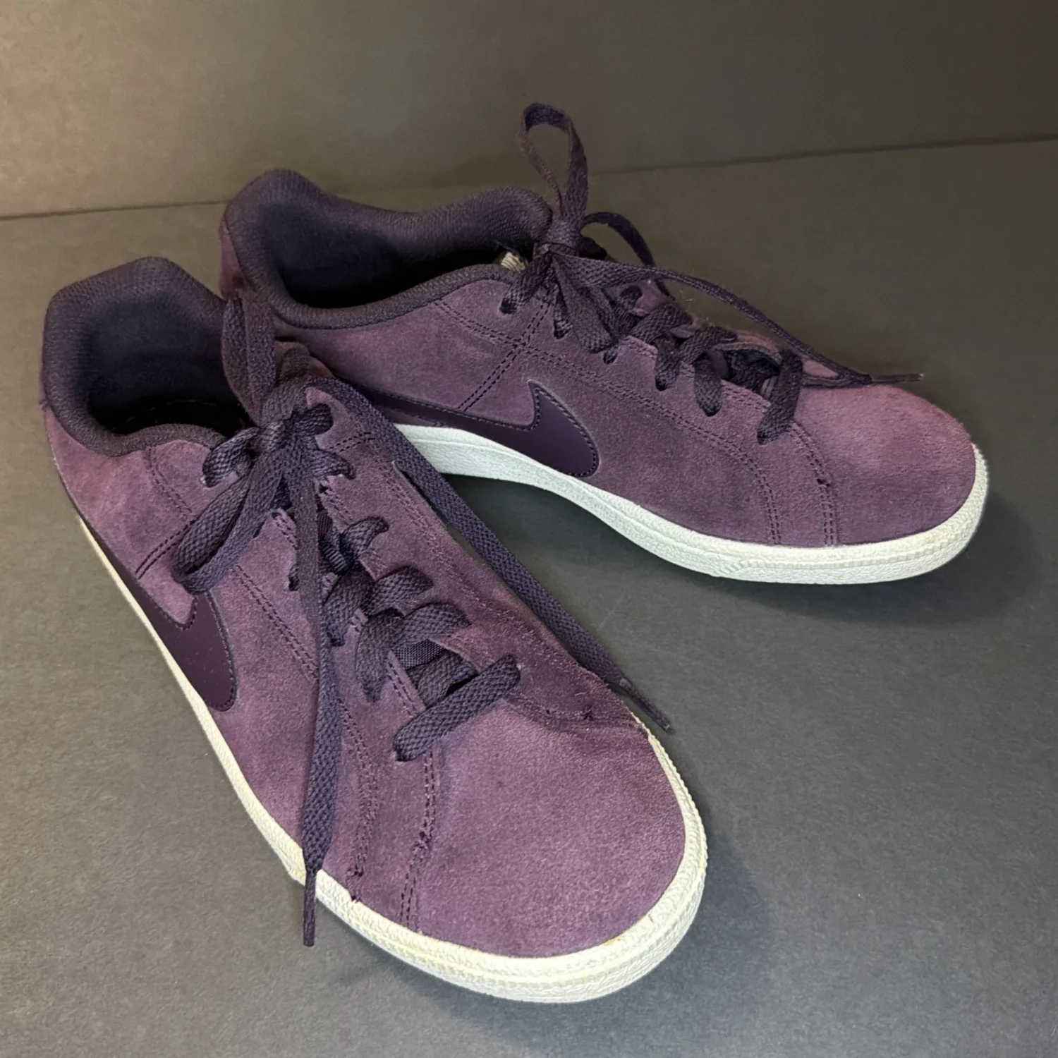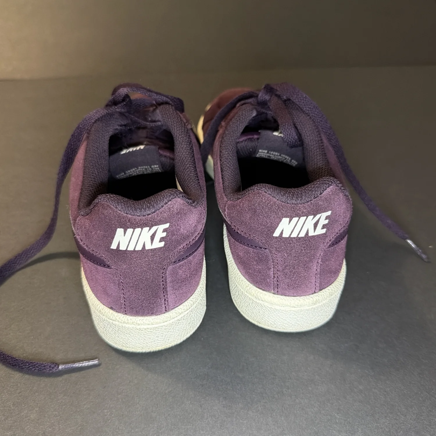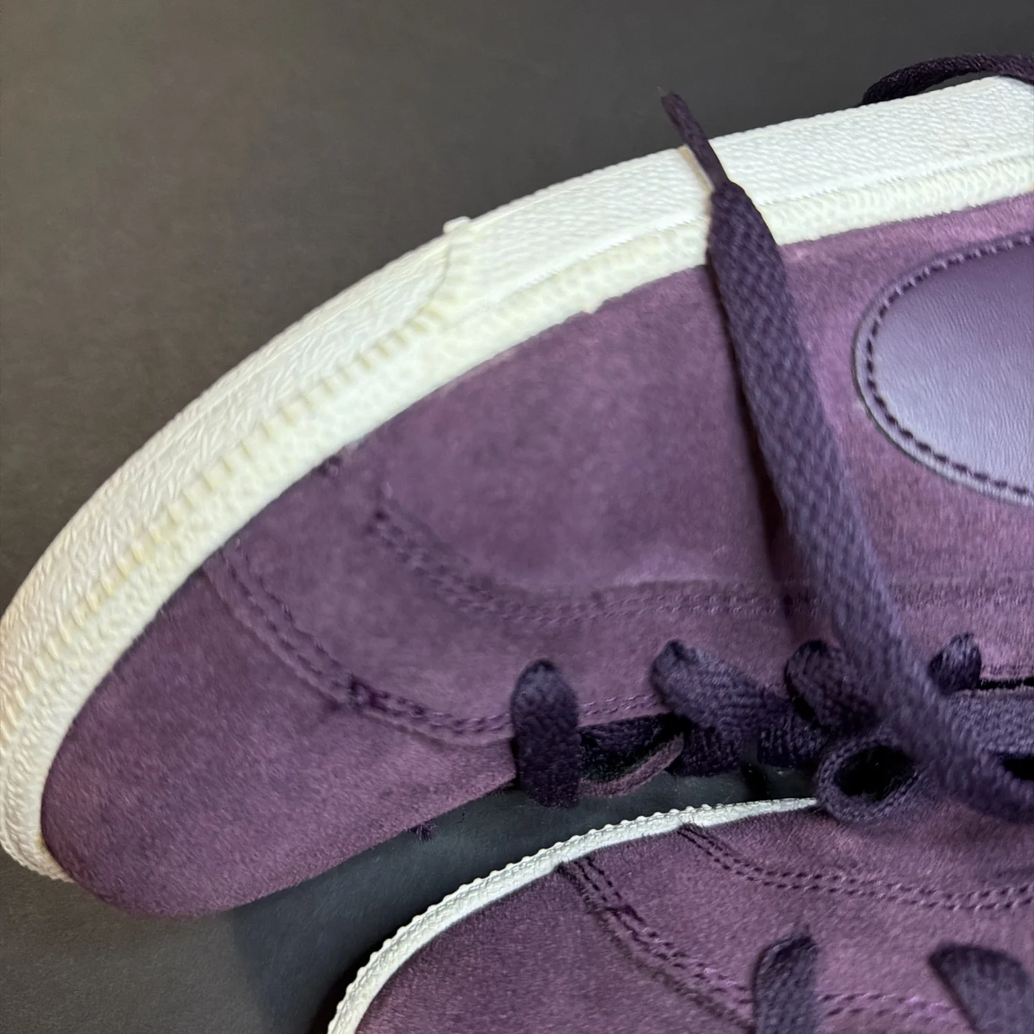 Purple suede, broken stitch view, but in good condition.