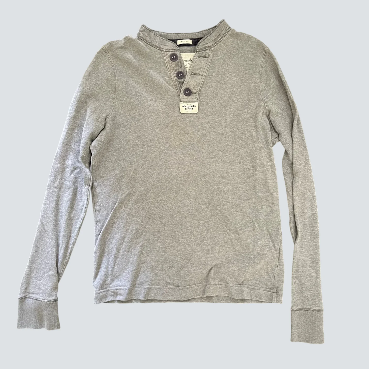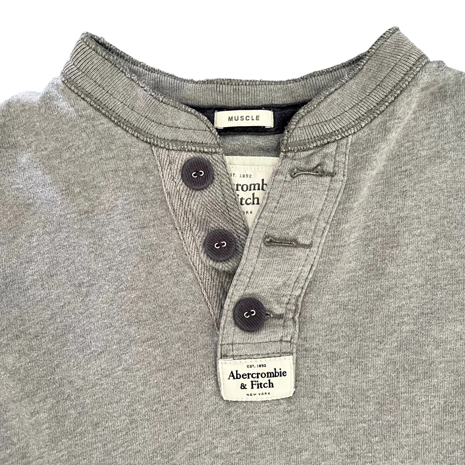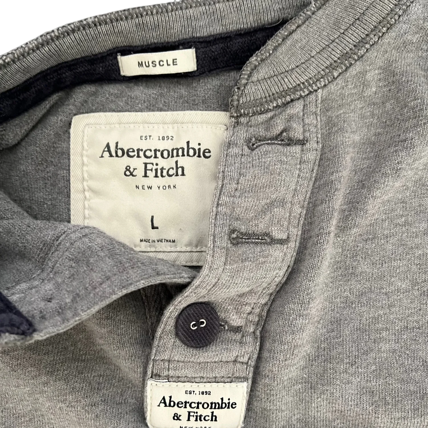 Men's grey vintage Henley shirt by Abercrombie & Fitch. This long-sleeve shirt features a button-placket style and is part of the 'Muscle' fit line. Made from soft, comfortable fabric ideal for casual outings. Great for layering in cooler weather. #Henley #Casual #Abercrombie