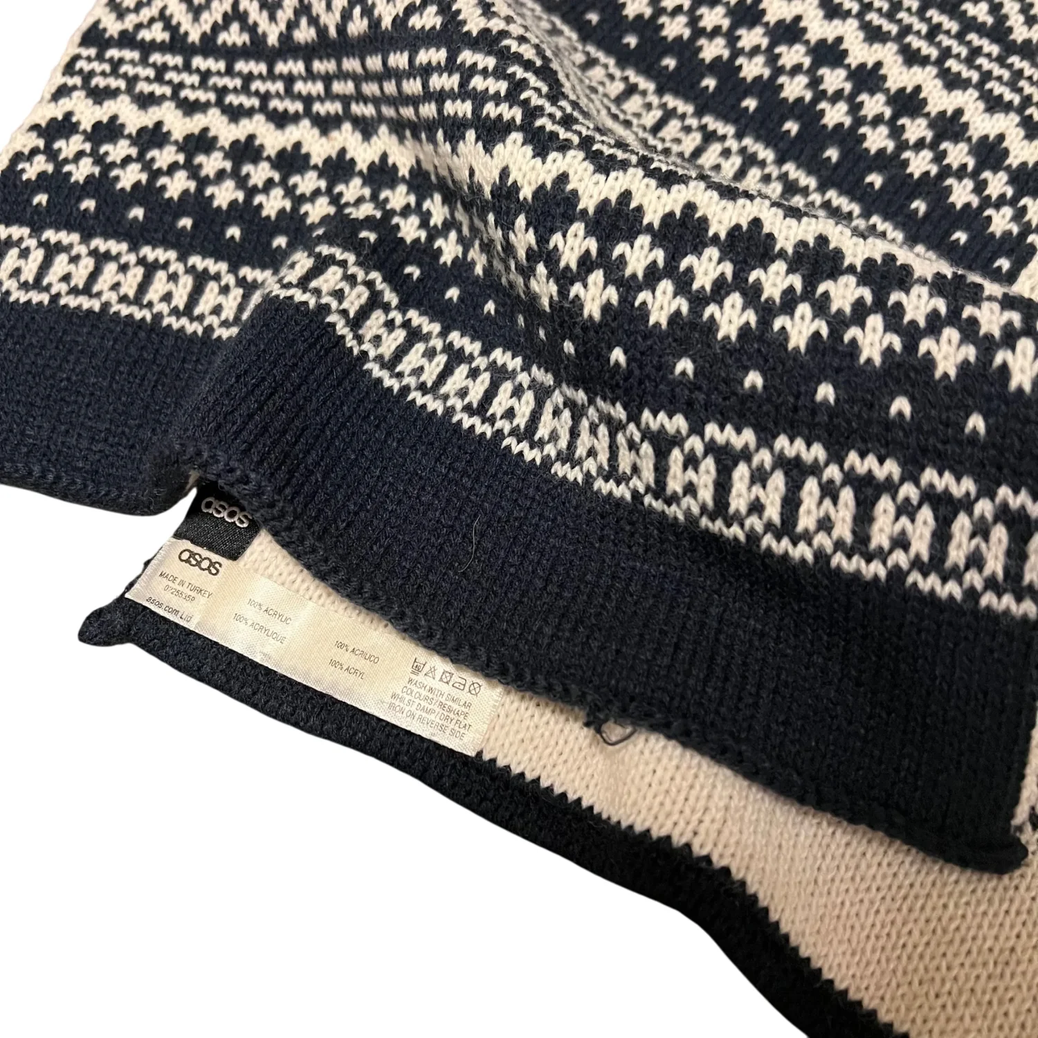 ASOS knit scarf features a classic black and white Nordic pattern, offering both style and warmth. Made from soft, high-quality materials, it's perfect for chilly weather. The scarf is generously sized and detailed with subtle branding, ensuring a fashionable statement. Ideal for both casual and sporty looks. 10.5” x 66.5”