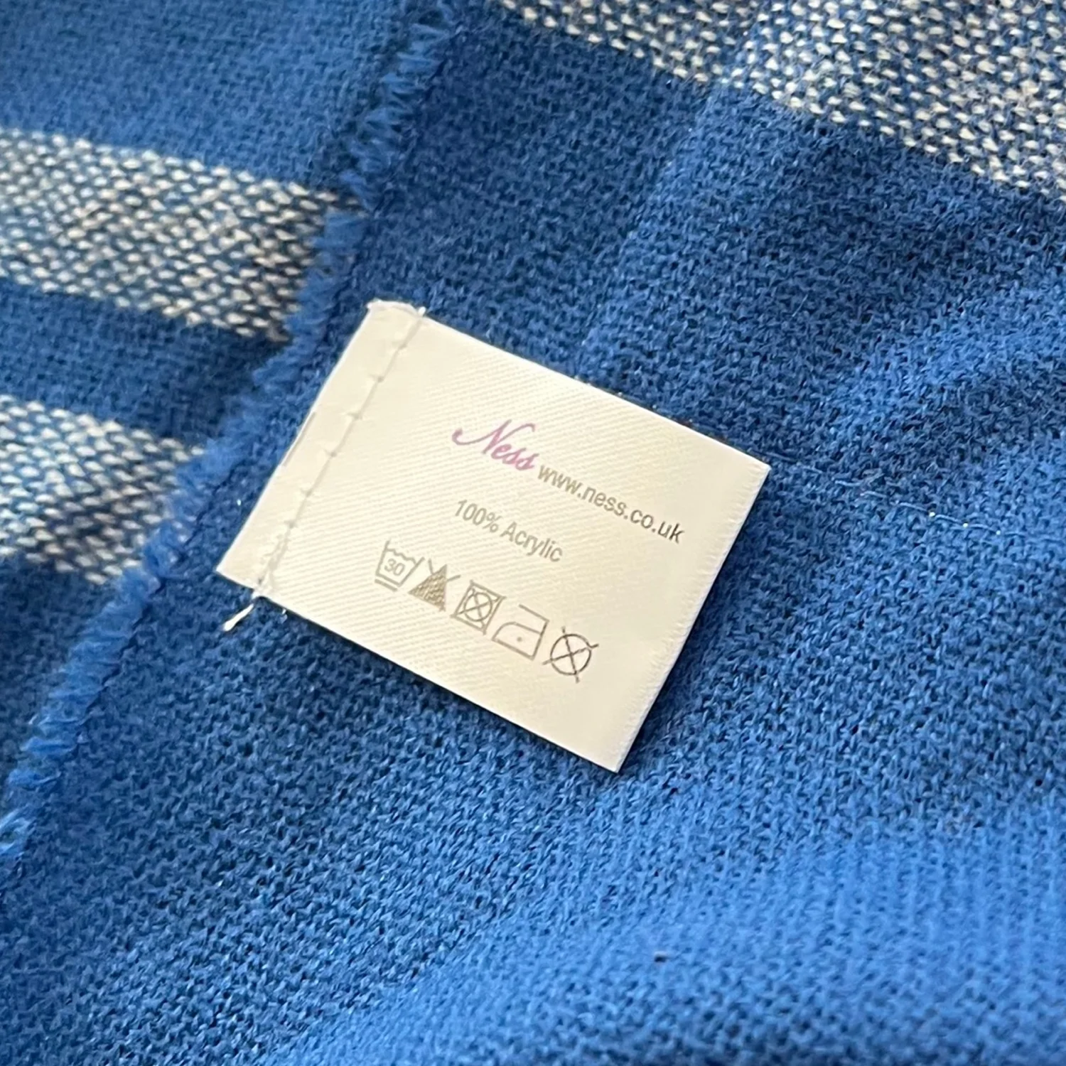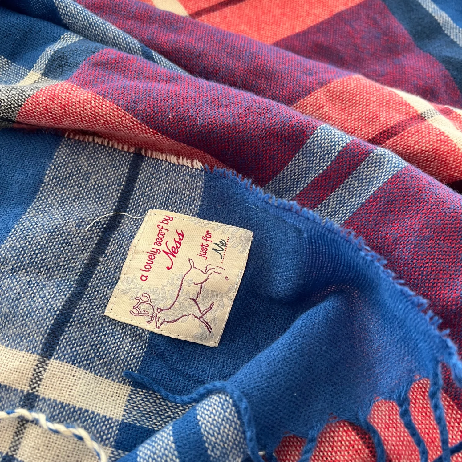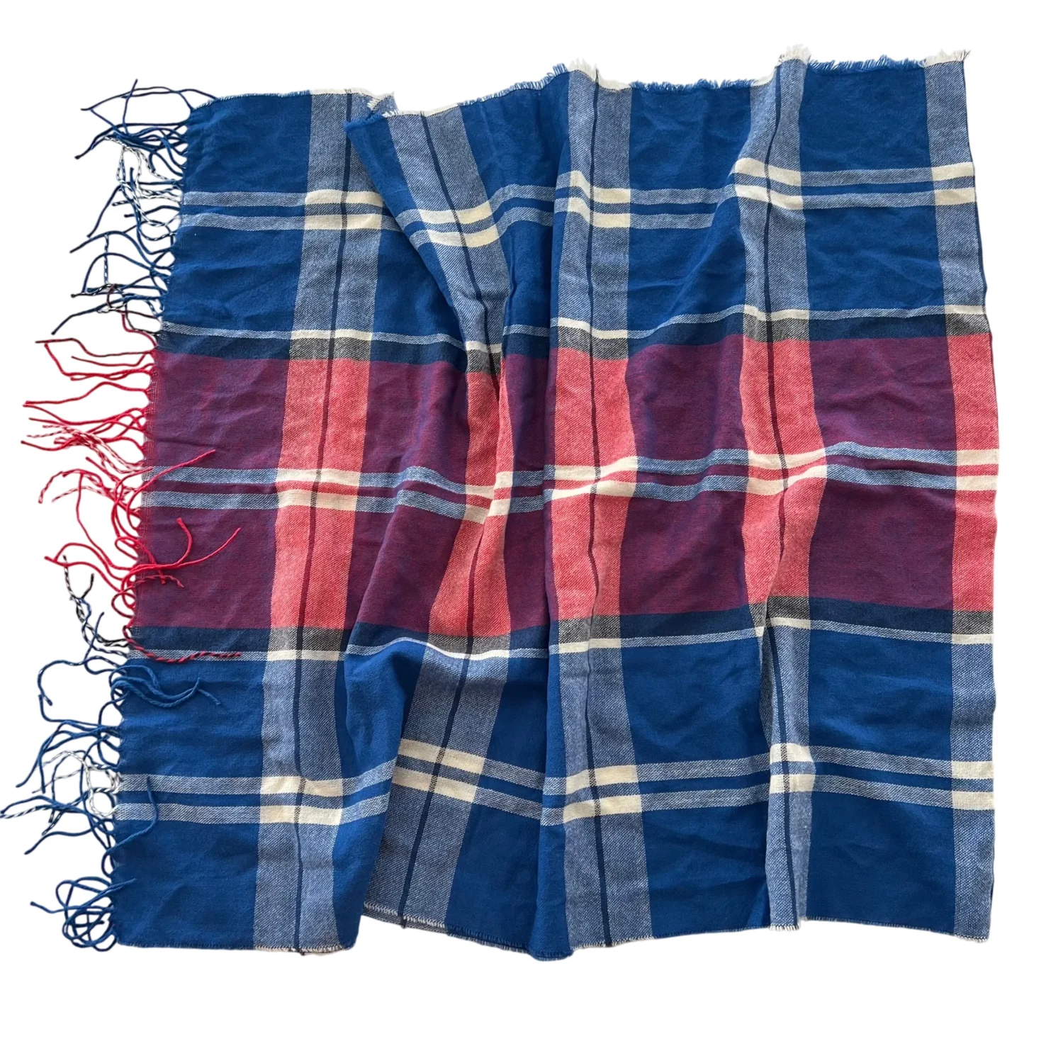 Soft and cozy plaid scarf featuring a vibrant blue, red, and white checkered pattern. From ness (UK) Approximately 70” x 30” Tags: #plaid #winter #accessory #fashion. Could be unisex, but technically it’s a men’s scarf