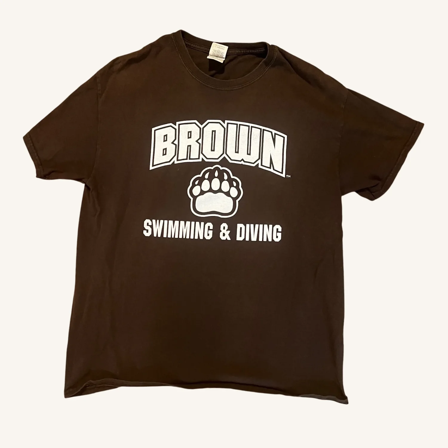 This brown t-shirt features the Brown University Swimming & Diving logo. Size Large on tag