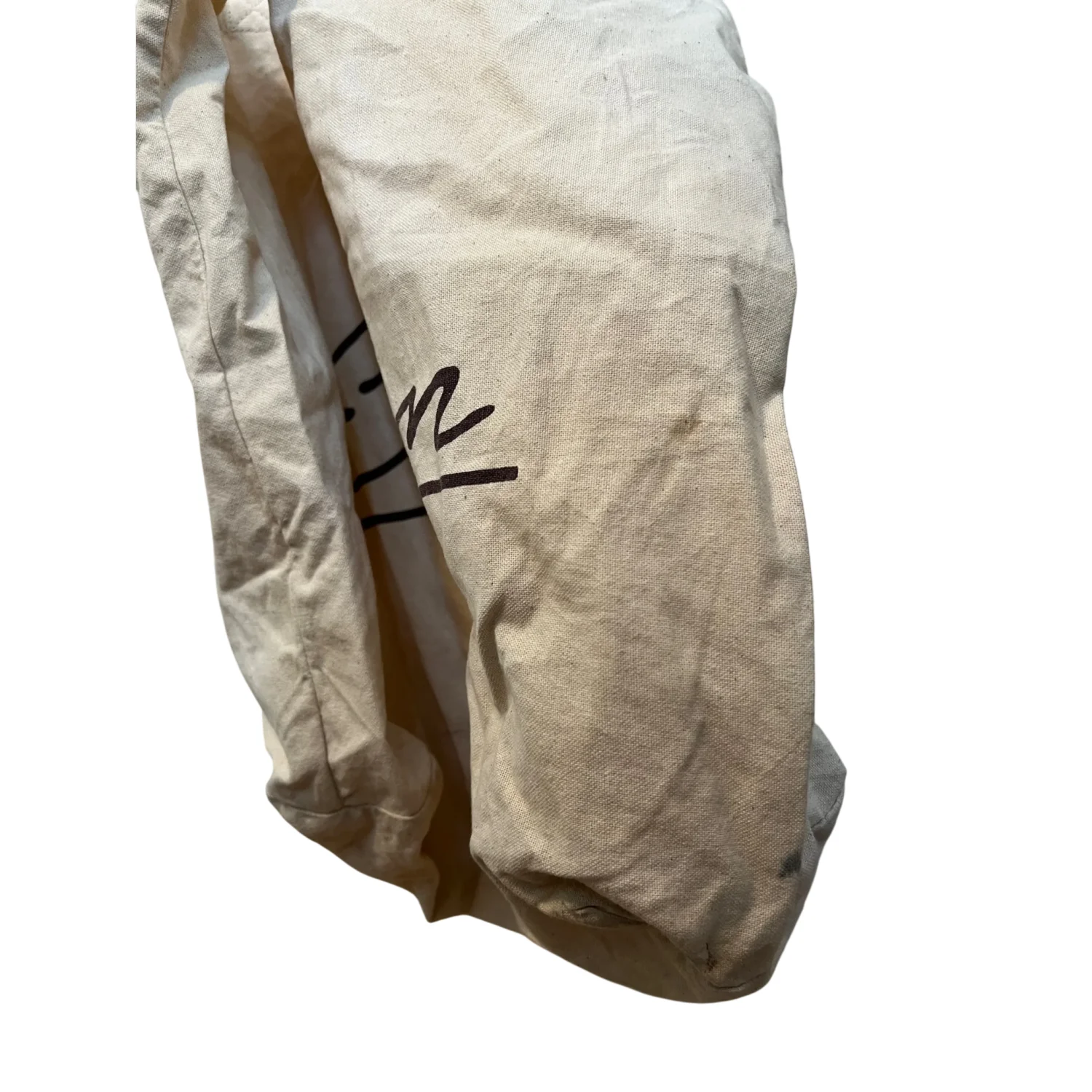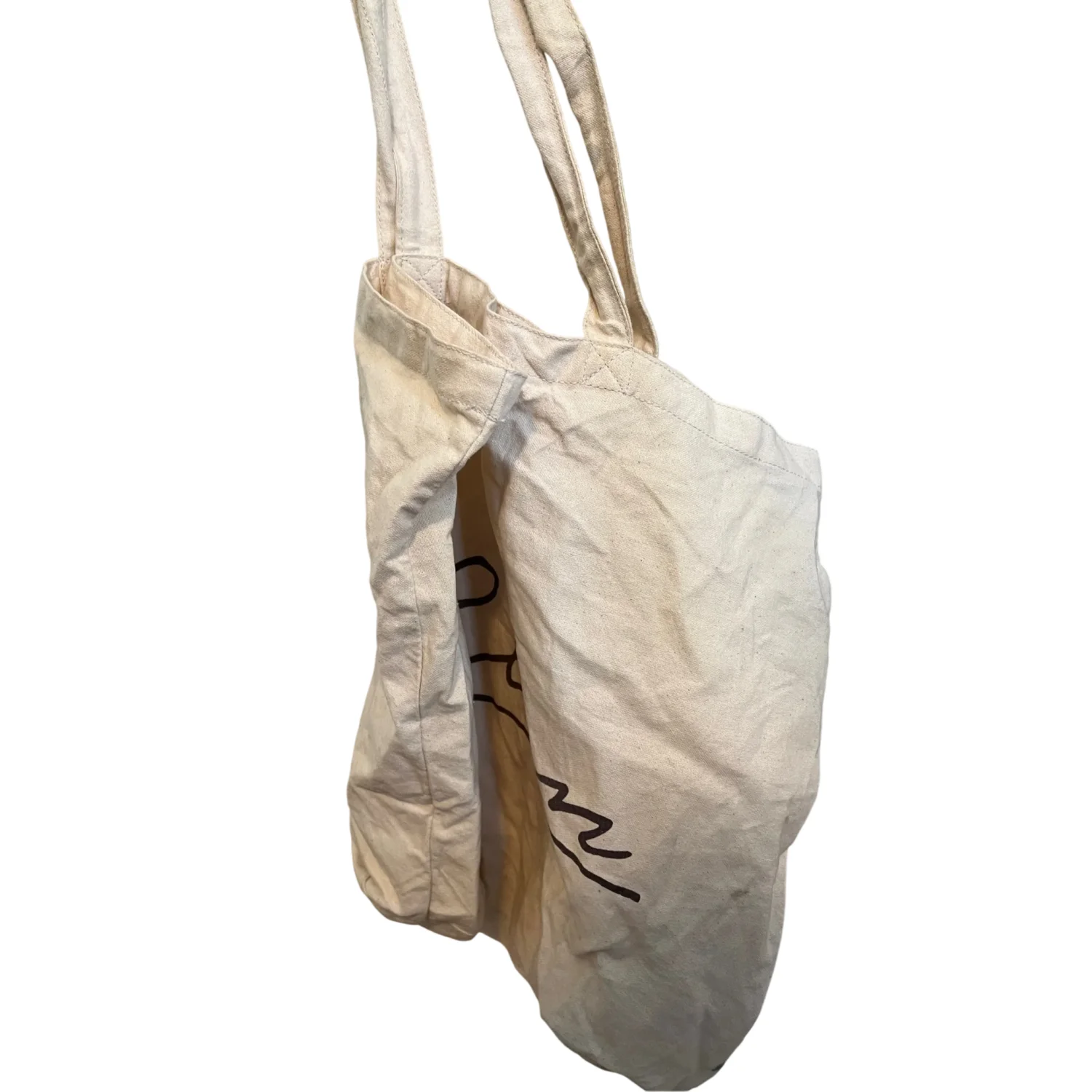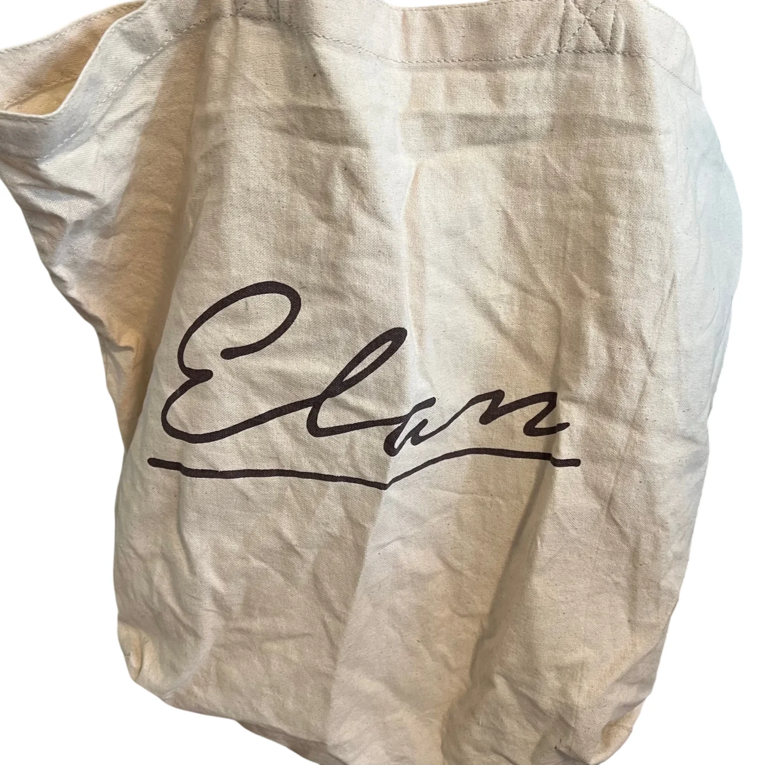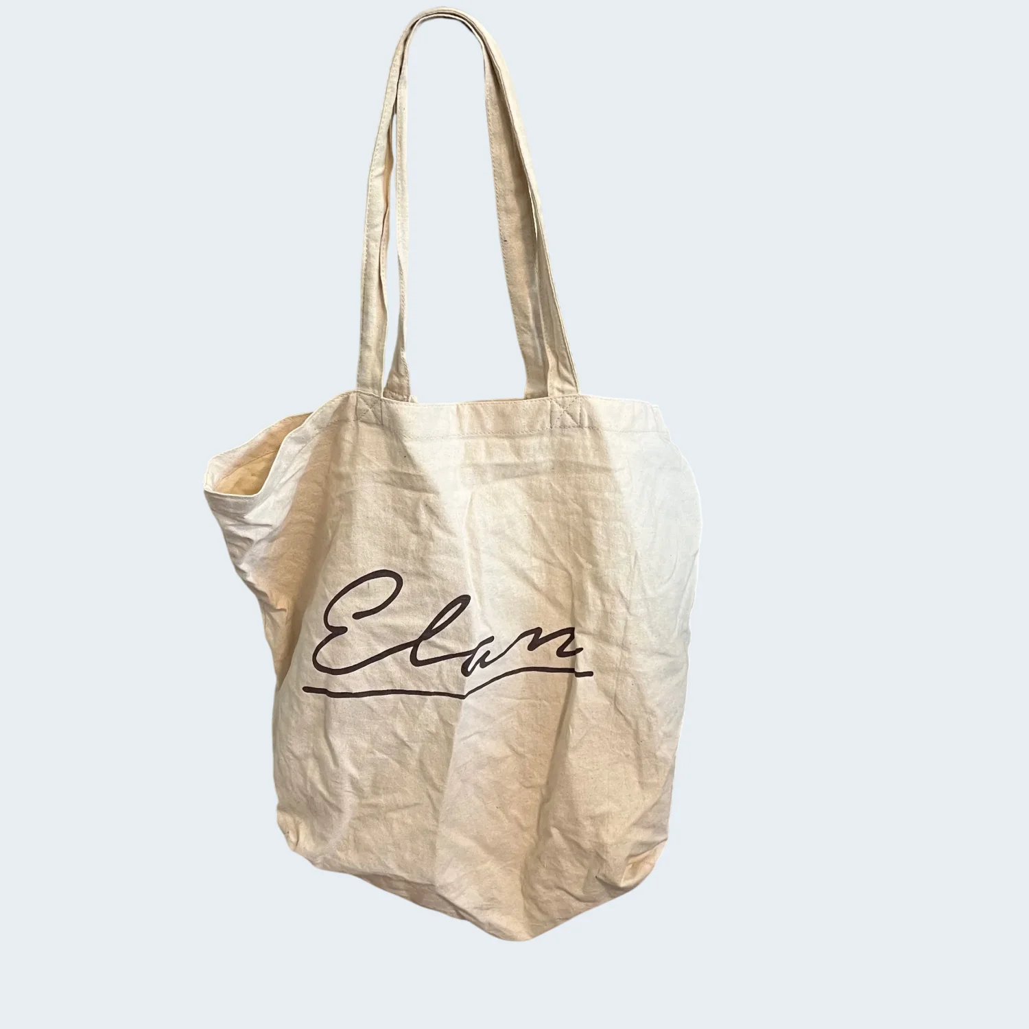 Elan canvas tote bag perfect for casual outings and grocery shopping. Unisex. Made from durable canvas material in a natural beige color with 'Elan' printed on both sides. Has some imperfections - priced accordingly. It is definitely “worn in” - sold as is