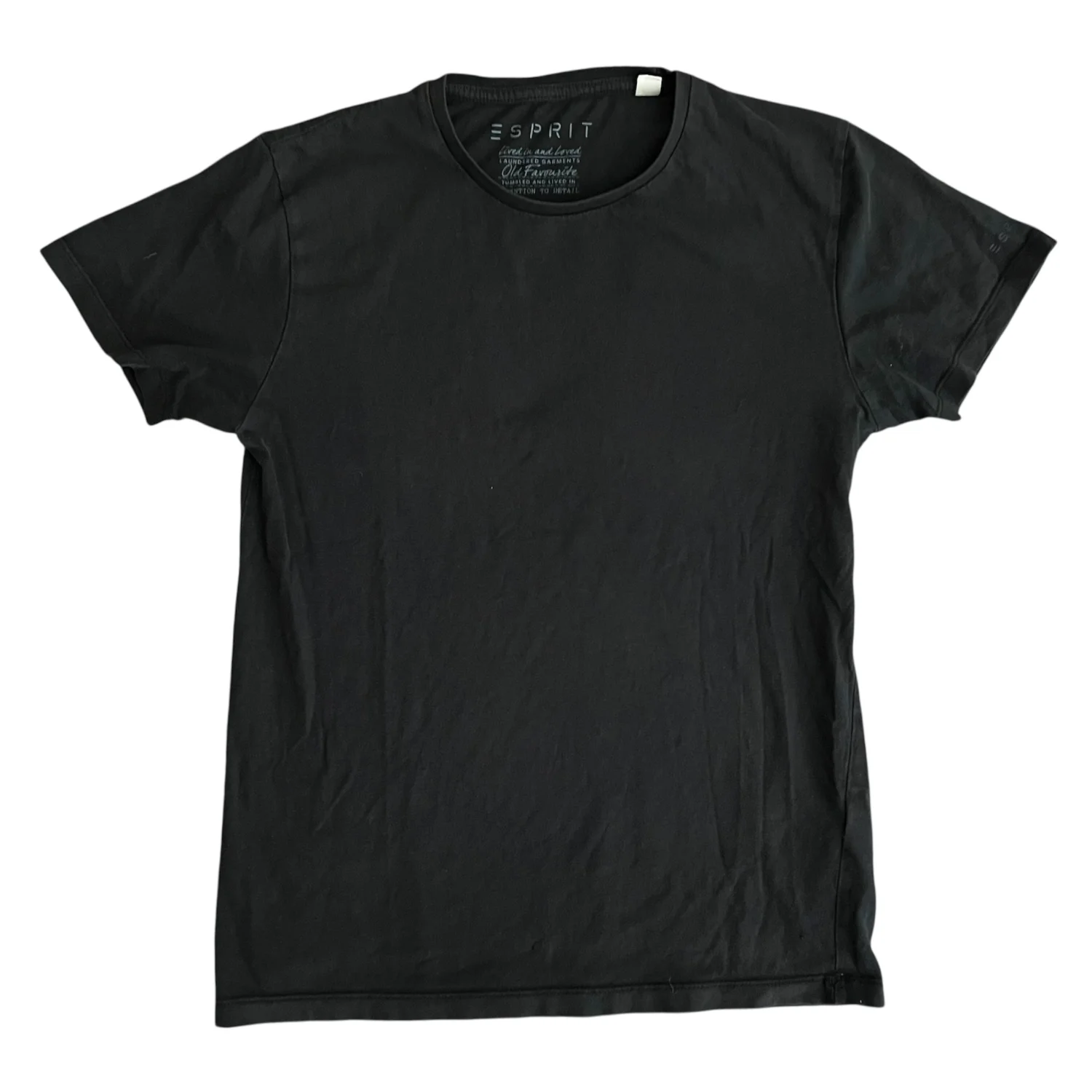 Size S (US sizing), espirit black crew neck t shirt with logo on left sleeve. Small stain as pictured that should be way to get out.