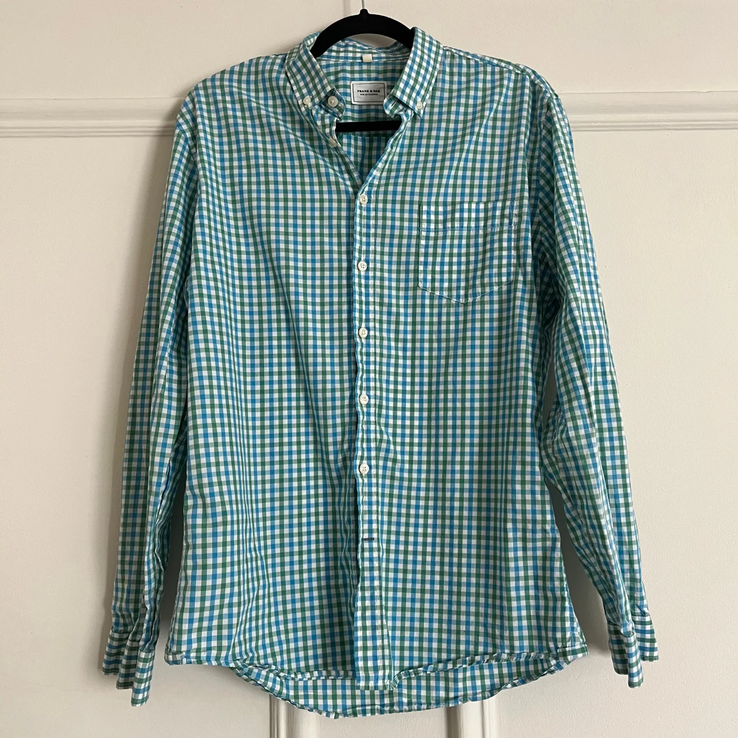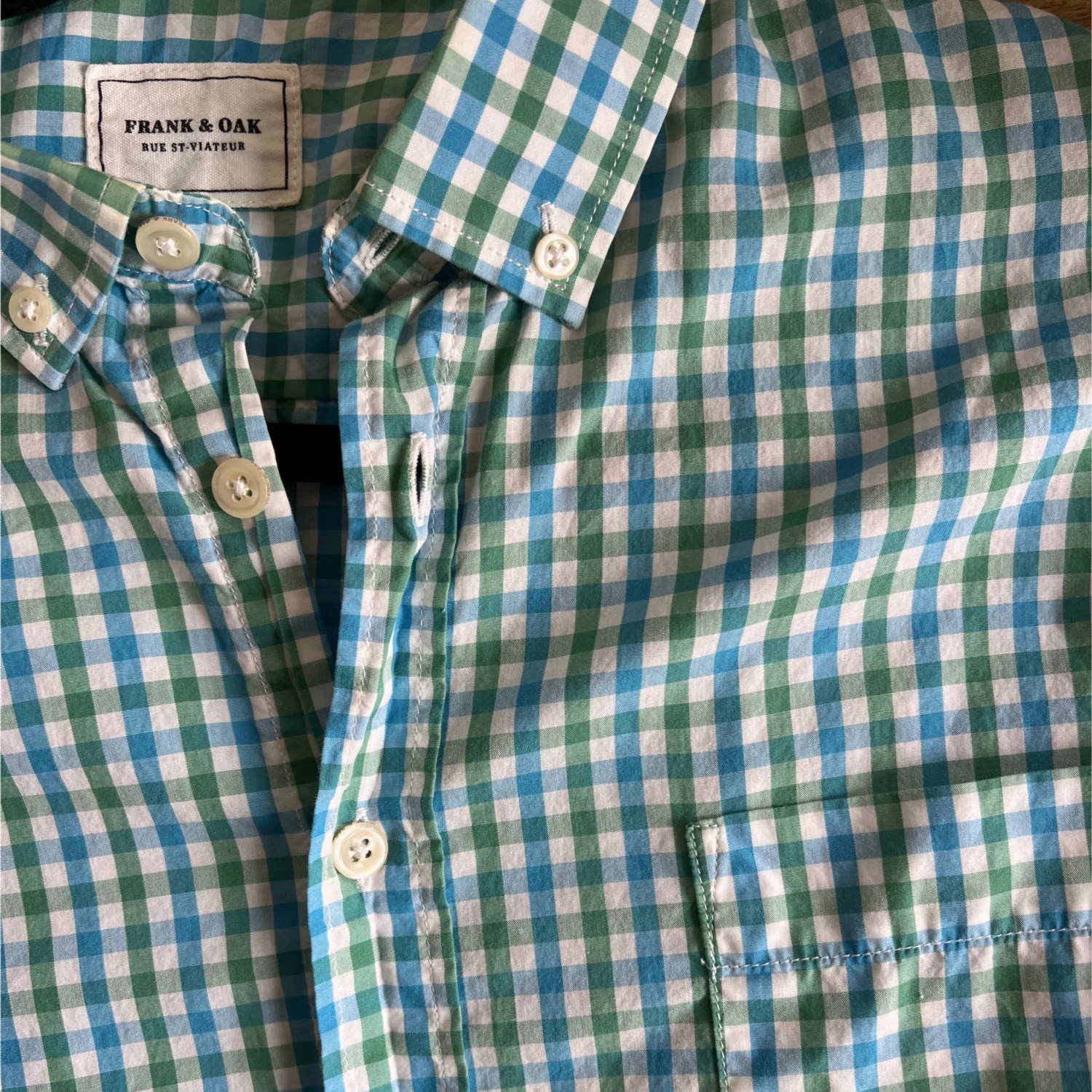 Gingham Frank & Oak light weight button down. Classic preppy look, could be casual or dressy. Size medium. Blue, Green and white plaid / gingham pattern