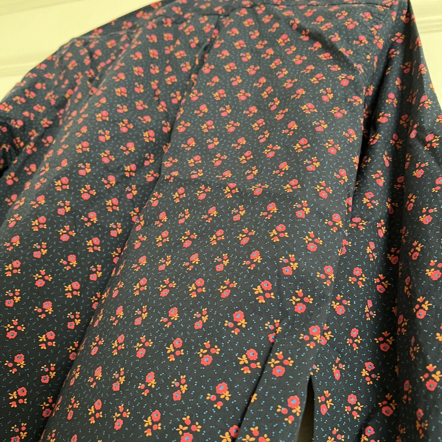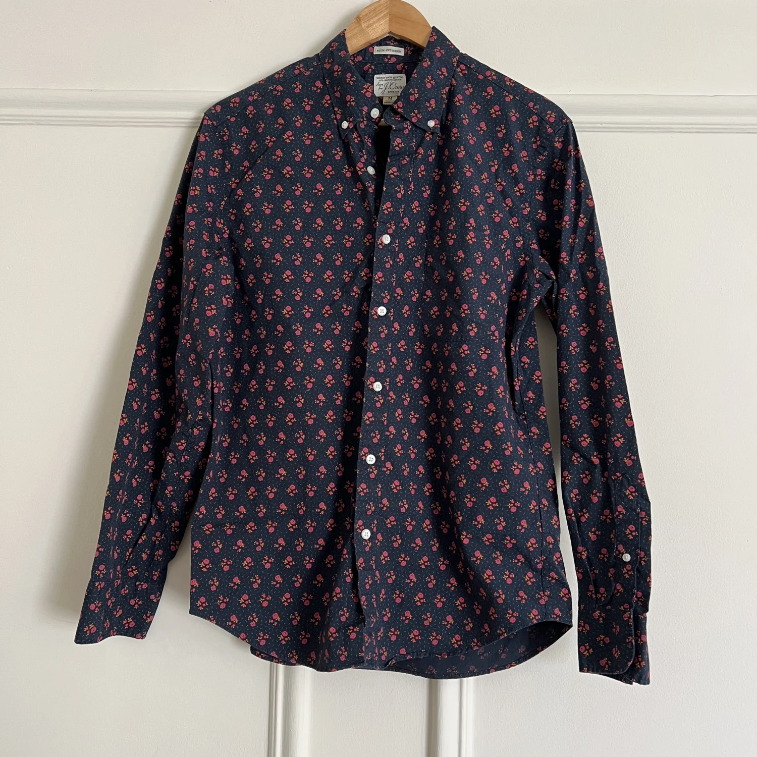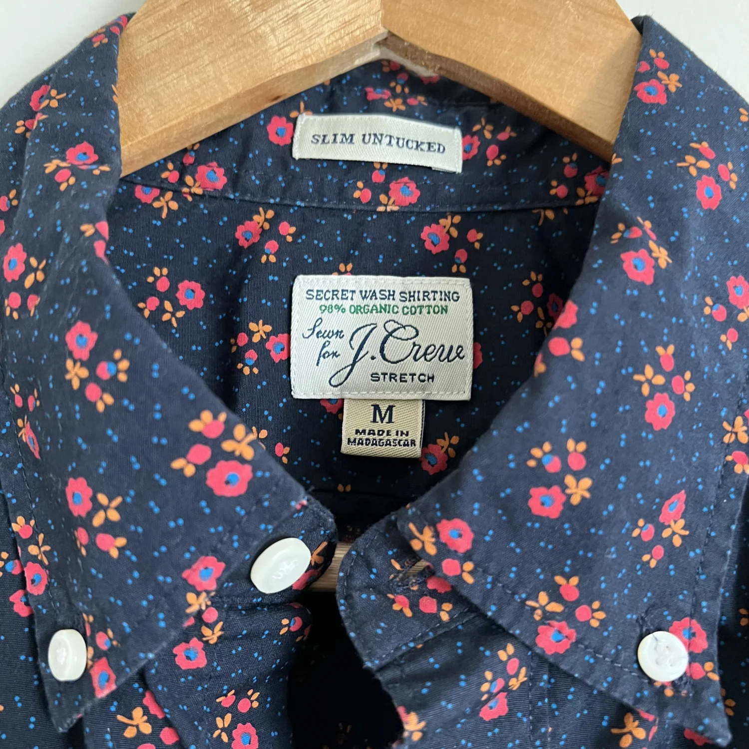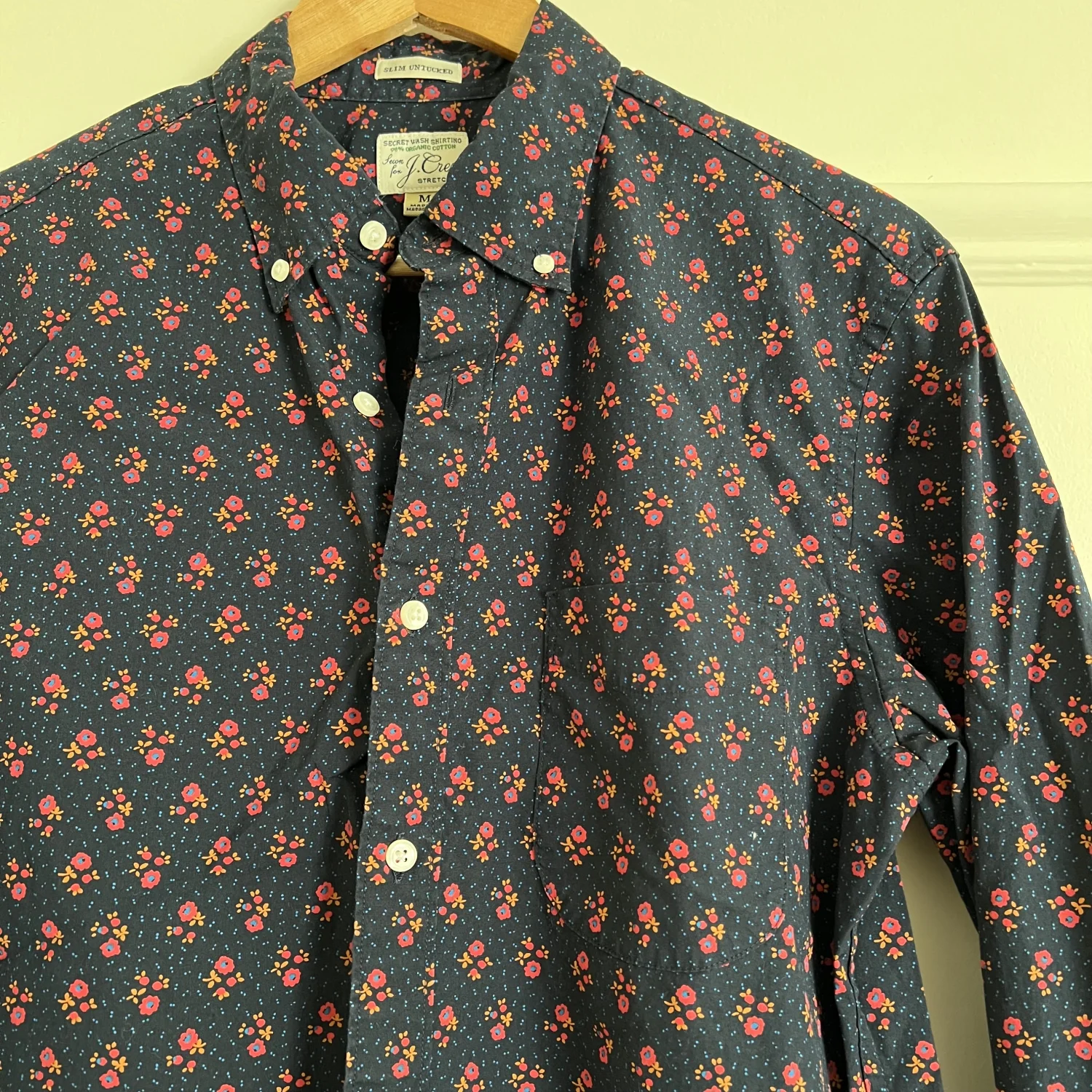 Stretch Secret Wash shirt in navy floral. 98% organic cotton. Slim untucked fit. Size Medium.